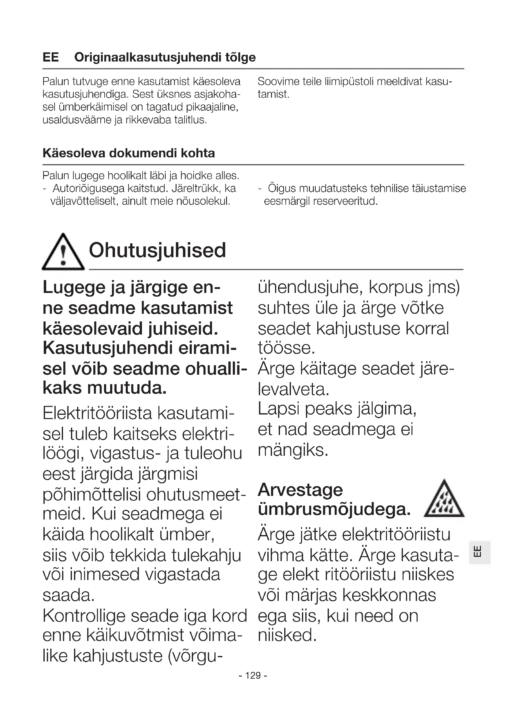 Lugege ja järgige en- ne seadme kasutamist käesolevaid juhiseid. Kasutusjuhendi eirami- sel võib seadme ohualli- kaks muutuda. Elektritööriista kasutami- sel tuleb kaitseks elektri- löögi, vigastus- ja tuleohu eest järgida järgmisi põhimõttelisi ohutusmeet- meid. Kui seadmega ei käida hoolikalt ümber, siis võib tekkida tulekahju või inimesed vigastada saada. Kontrollige seade iga kord enne käikuvõtmist võima- like kahjustuste (võrgu- ühendusjuhe, korpus jms) suhtes üle ja ärge võtke seadet kahjustuse korral töösse. Ärge käitage seadet järe- levalveta. Lapsi peaks jälgima, et nad seadmega ei mängiks. Arvestage ümbrusmõjudega. Ärge jätke elektritööriistu vihma kätte. Ärge kasuta- ge elekt ritööriistu niiskes või märjas keskkonnas ega siis, kui need on niisked. Palun tutvuge enne kasutamist käesoleva kasutusjuhendiga. Sest üksnes asjakoha- sel ümberkäimisel on tagatud pikaajaline, usaldusväärne ja rikkevaba talitlus. Soovime teile liimipüstoli meeldivat kasu- tamist. Originaalkasutusjuhendi tõlge Käesoleva dokumendi kohta Palun lugege hoolikalt läbi ja hoidke alles. - Autoriõigusega kaitstud. Järeltrükk, ka väljavõtteliselt, ainult meie nõusolekul. - Õigus muudatusteks tehnilise täiustamise eesmärgil reserveeritud. Ohutusjuhised EE- 130 - Ettevaatust seadmete kasutamisel süttimisohtli- ke materjalide läheduses. Ärge suunake pikemat aega ühele ja samale ko- hale. Ärge kasutage plah- vatusohtliku atmosfääri olemasolul. Peidetud süt- timisohtlikele materjalidele võidakse välja kiiratavat soojust edasi kanda. Kaitske ennast elektrilöögi eest. Vältige füüsilist kontak- ti maandatud osadega nagu torud, küttekehad, pliidid ja külmkapid. Ärge jätke seadet järele- valveta, kuni see töötab. Hoidke oma töö- riistu kindlalt alal. Asetage seade pärast kasutamist seisupinnale ja laske tal enne ärapakki- mist maha jahtuda. Mittekasutatavaid tööriistu peaks hoidma alal kuivas suletud ruumis ja lastele kättesaamatul viisil. Antud seadet tohivad kasutada lapsed alates
