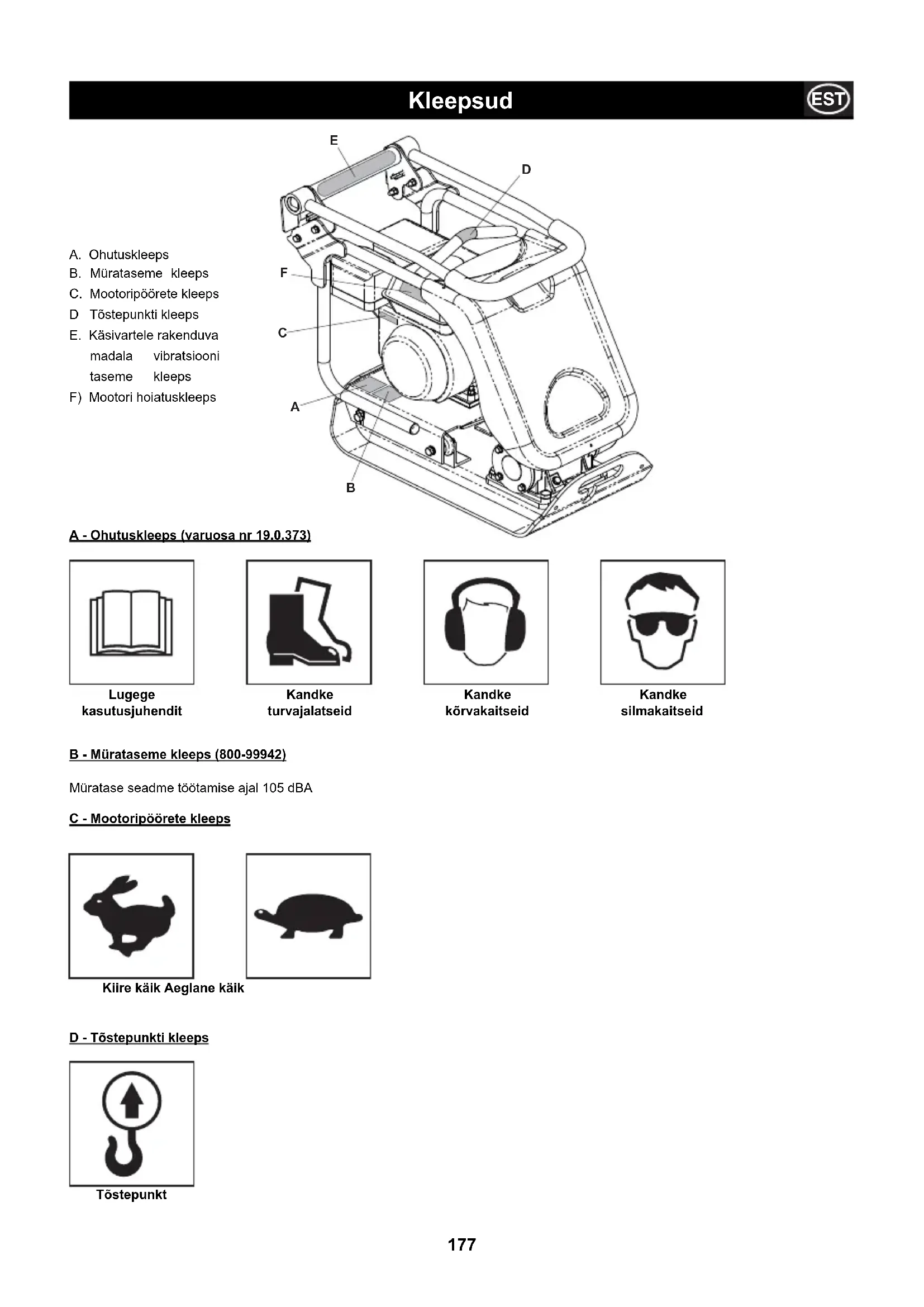 A. Ohutuskleeps B. Mürataseme kleeps C. Mootoripöörete kleeps D Tõstepunkti kleeps E. Käsivartele rakenduva madala vibratsiooni taseme kleeps F) Mootori hoiatuskleeps Kiire käik Aeglane käik D - Tõstepunkti kleeps Tõstepunkt EST178 Üldohutusnõuded EST Teie enda ja teiste inimeste ohutuse tagamiseks lugege järgnevad ohutusnõuded hoolikalt läbi. Veenduge, et saate neist aru. Operaator vastutab selle eest, et ta teab täpselt, kuidas seadet ohutult kasutada. Kui Te ei ole päris kindel, kuidas pinnasetihendajat ohutult ja õigesti kasutada, pöörduge töödejuhataja või Belle Groupi esindaja poole.