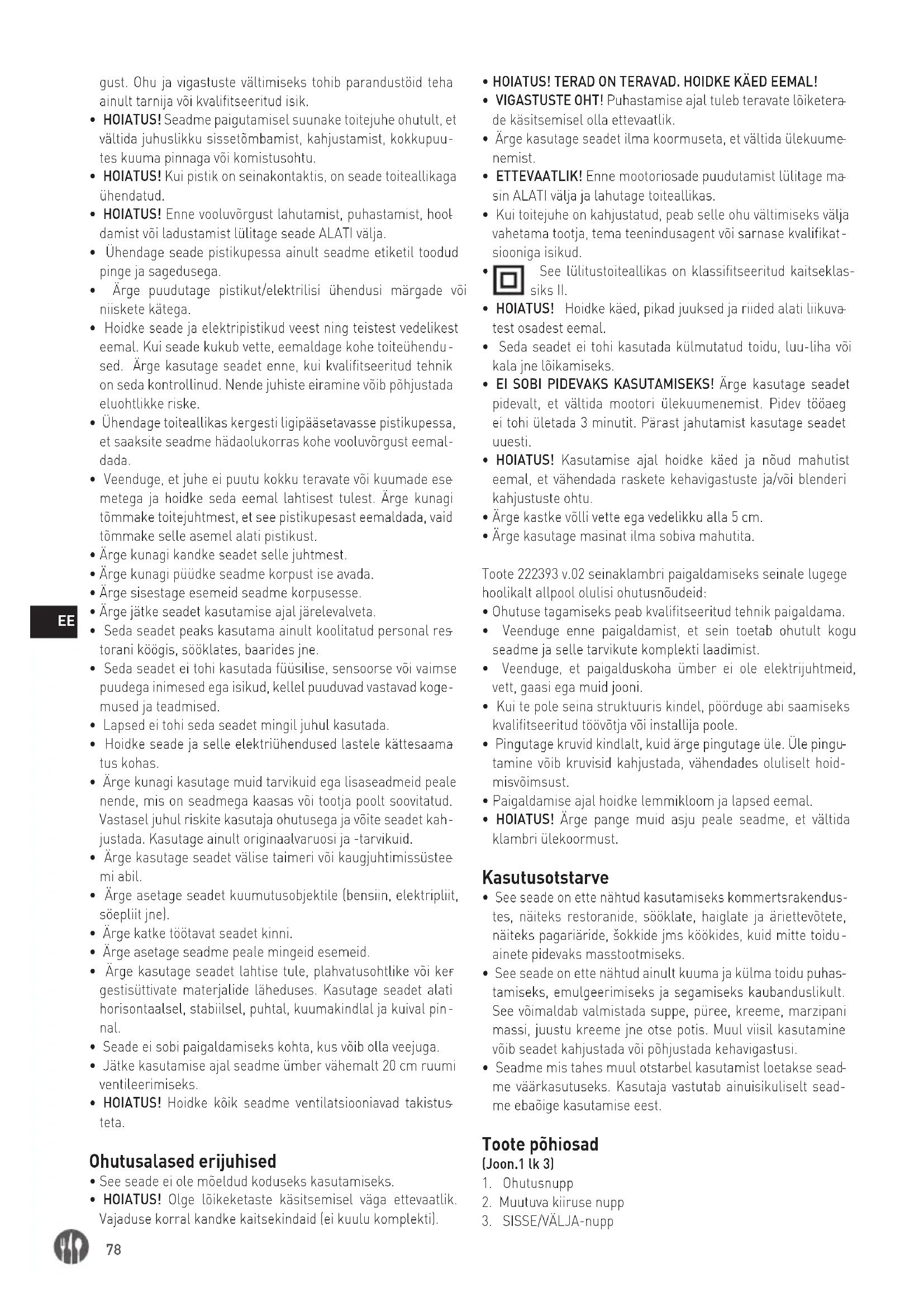 - HOIATUS! Kasutamise ajal hoidke käed ja nõud mahutist eemal, et vähendada raskete kehavigastuste ja/või blenderi kahjustuste ohtu.