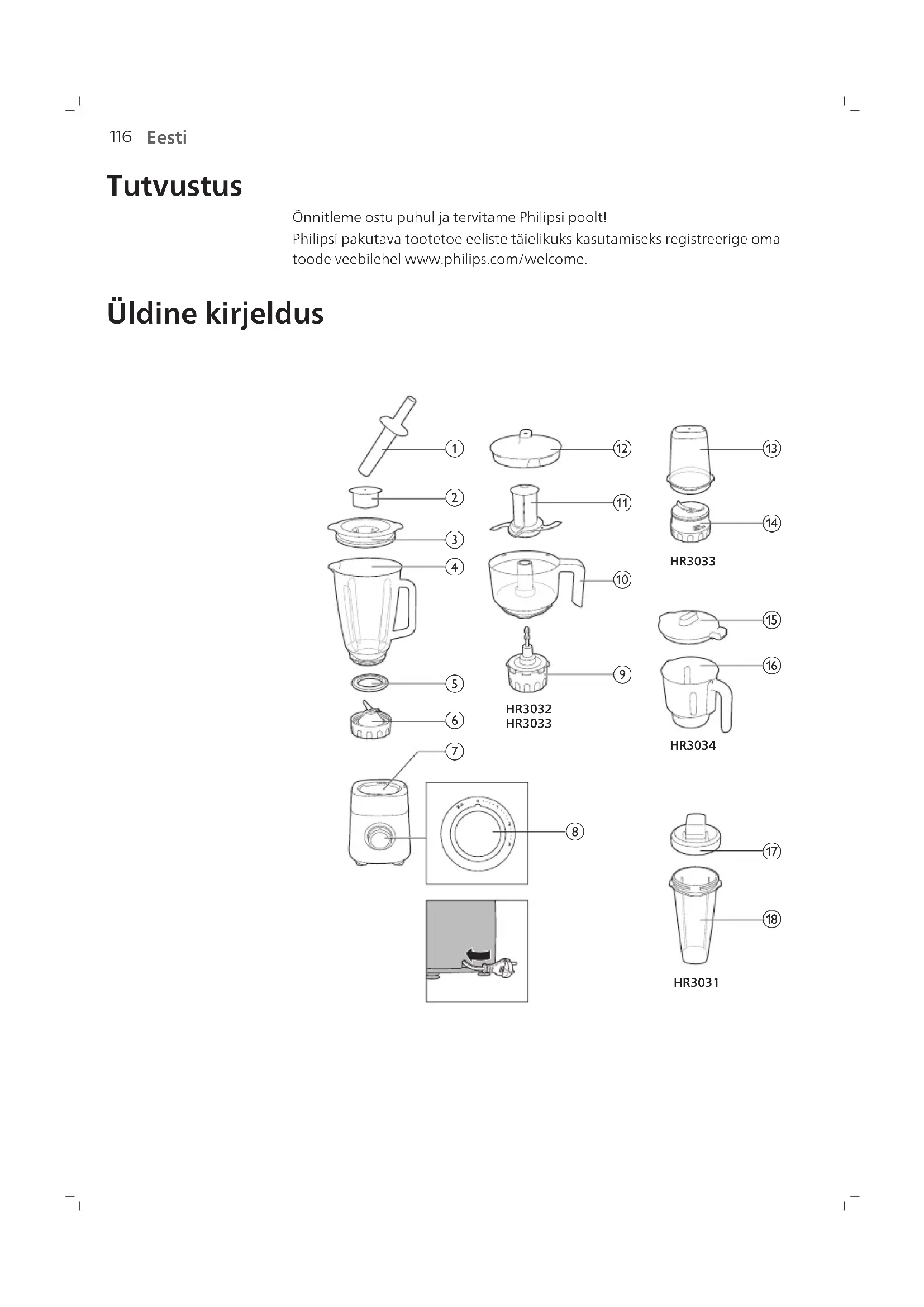 Eesti Tutvustus Õnnitleme ostu puhul ja tervitame Philipsi poolt! Philipsi pakutava tootetoe eeliste täielikuks kasutamiseks registreerige oma toode veebilehel www.philips.com/welcome. Üldine kirjeldus HR3034HR3031 HR3033HR3032 HR3033