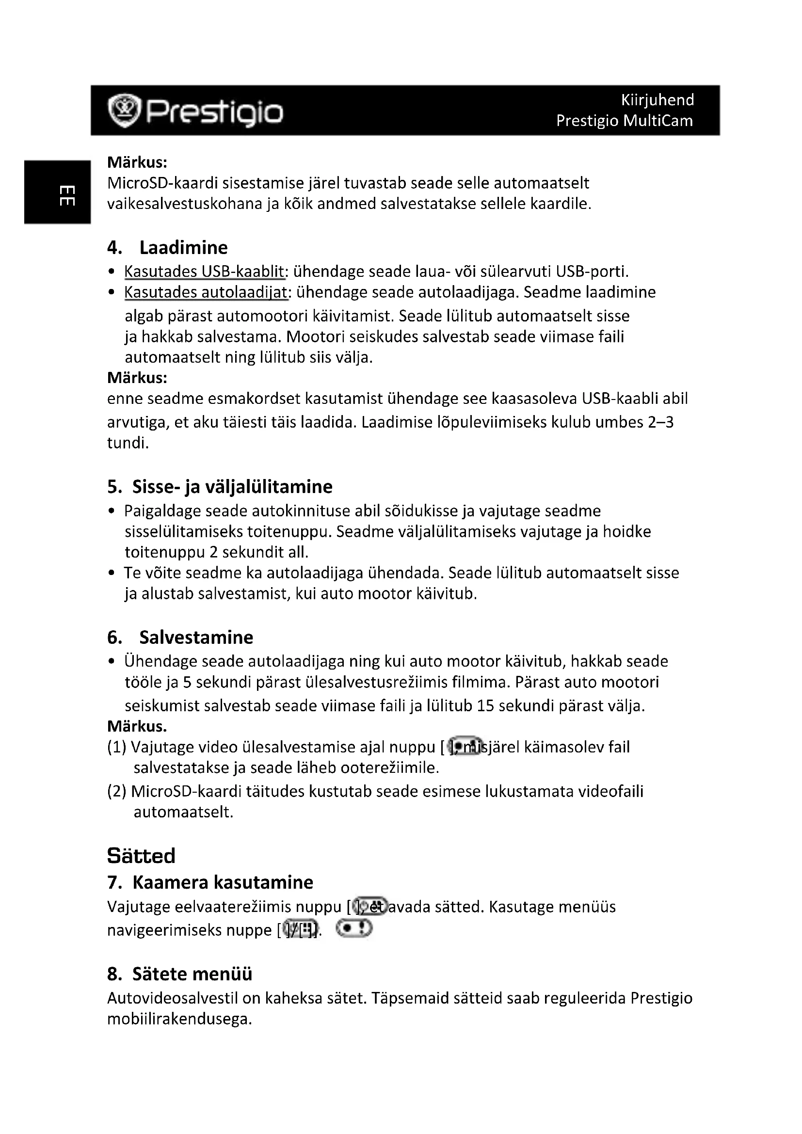 - Ärge asetage antud toodet mitte kunagi tugevat elektromagnetvälja tekitavate seadmete lähedusse. Kokkupuude tugeva magnetväljaga võib põhjustada seadme talitlushäireid ning andmeid rikkuda või kustutada.Kiirjuhend Prestigio MultiCam