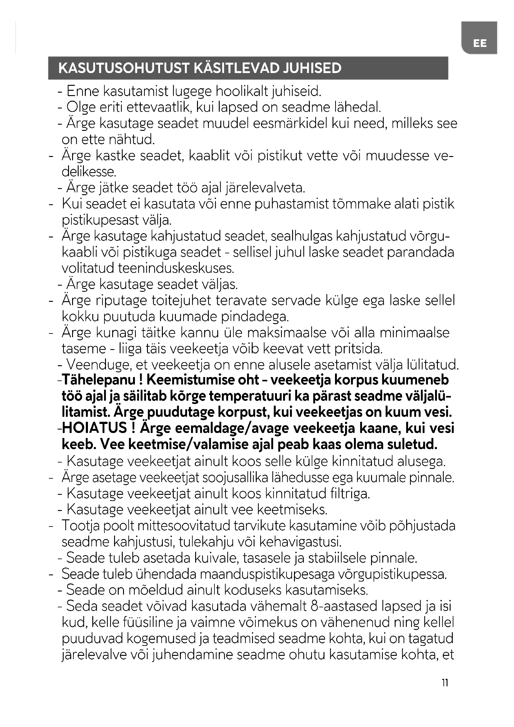 Tähelepanu ! Keemistumise oht - veekeetja korpus kuumeneb töö ajal ja säilitab kõrge temperatuuri ka pärast seadme väljalü- litamist. Ärge puudutage korpust, kui veekeetjas on kuum vesi.