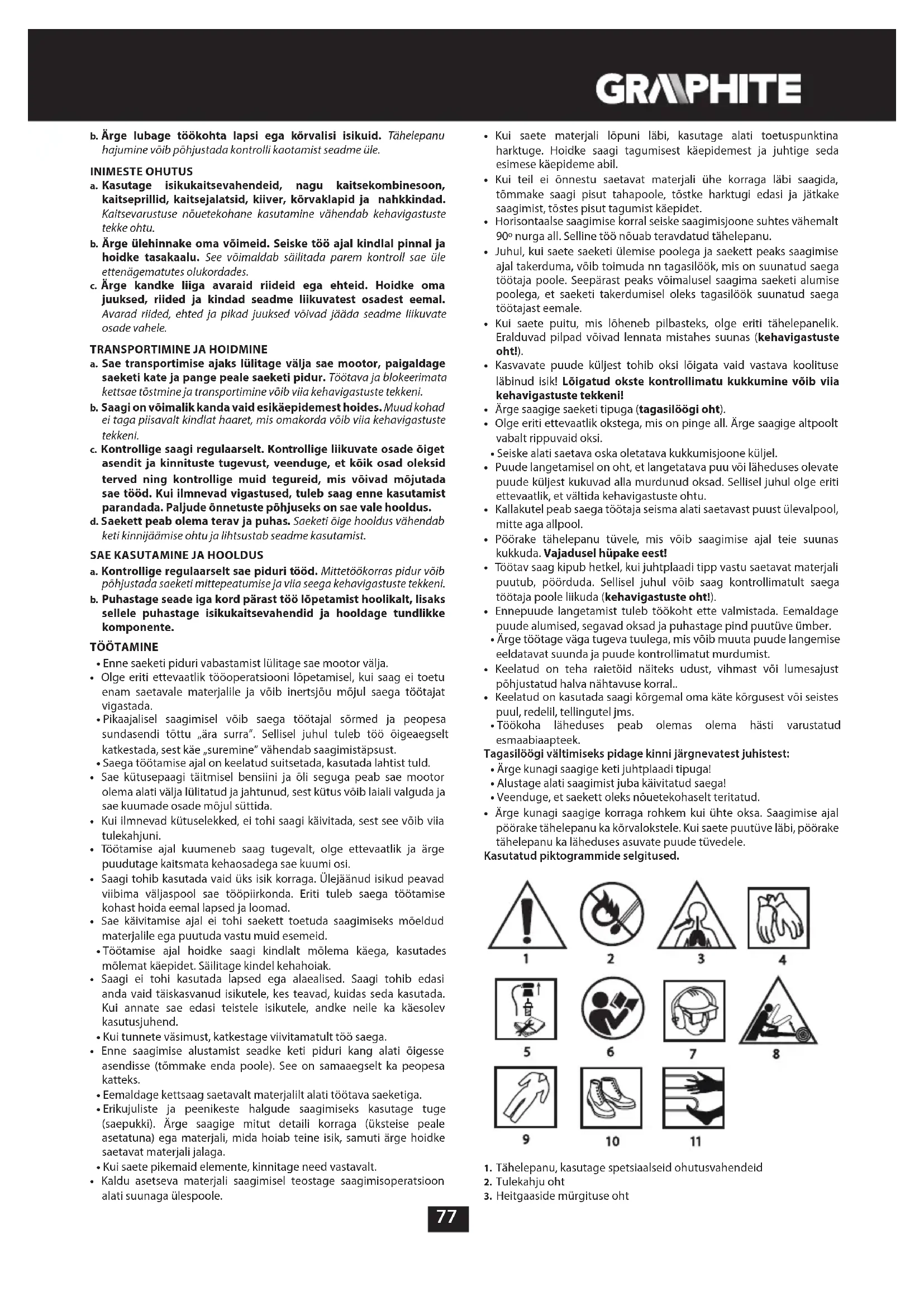 - Tootja ei vastuta sae mitteotstarbekohase kasutamise tõttu tekkinud kahju eest. TÖÖKOHT a. Hoidke töökoht korras ja jälgige, et see oleks hästi valgustatud. Korratu ja halvasti valgustatud töökoht võib põhjustada õnnetusi sae kasutamisel.77 b. Ärge lubage töökohta lapsi ega kõrvalisi isikuid. Tähelepanu hajumine võib põhjustada kontrolli kaotamist seadme üle. INIMESTE OHUTUS a. Kasutage isikukaitsevahendeid, nagu kaitsekombinesoon, kaitseprillid, kaitsejalatsid, kiiver, kõrvaklapid ja nahkkindad. Kaitsevarustuse nõuetekohane kasutamine vähendab kehavigastuste tekke ohtu. b. Ärge ülehinnake oma võimeid. Seiske töö ajal kindlal pinnal ja hoidke tasakaalu. See võimaldab säilitada parem kontroll sae üle ettenägematutes olukordades. c. Ärge kandke liiga avaraid riideid ega ehteid. Hoidke oma juuksed, riided ja kindad seadme liikuvatest osadest eemal. Avarad riided, ehted ja pikad juuksed võivad jääda seadme liikuvate osade vahele.