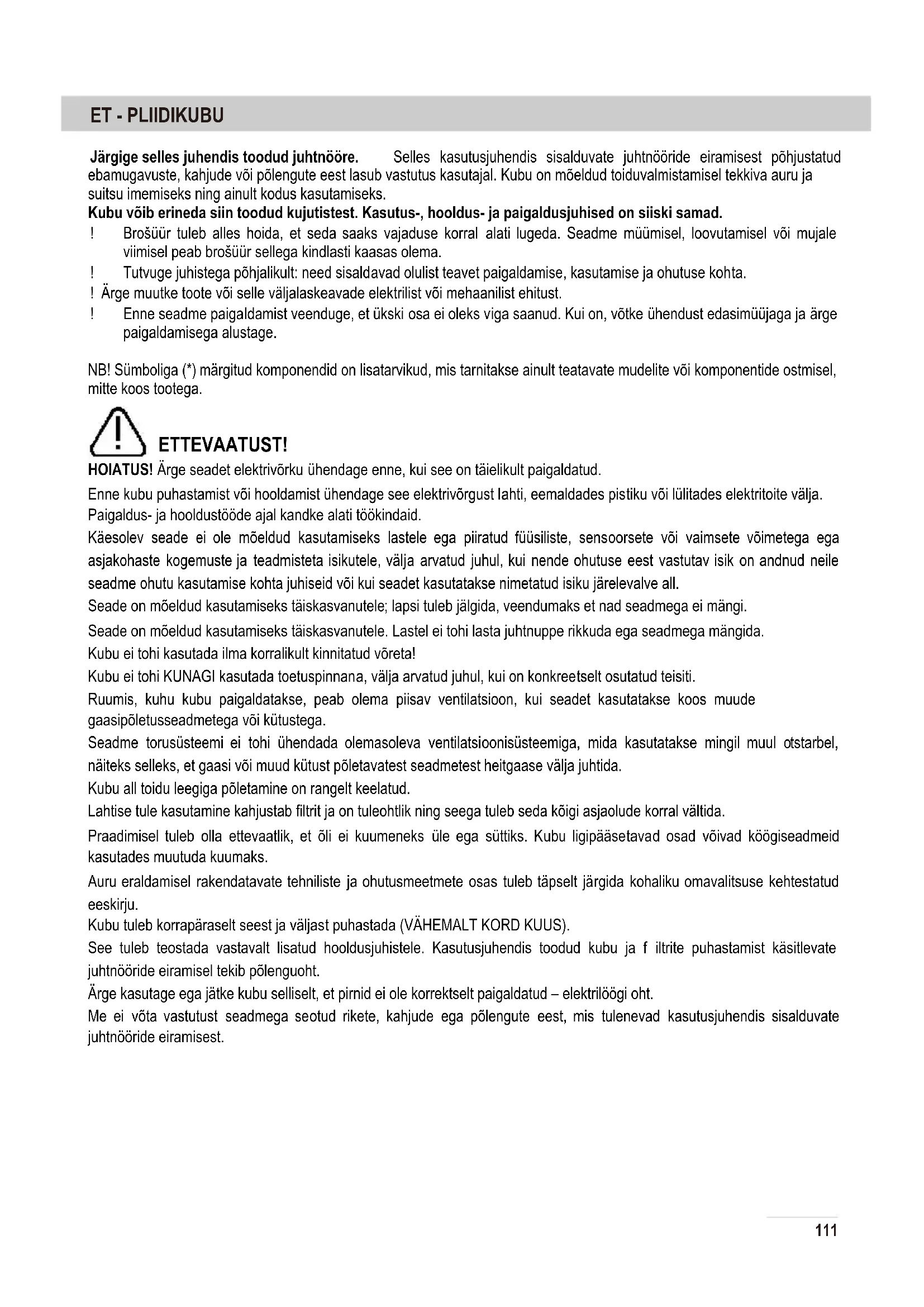 Järgige selles juhendis toodud juhtnööre. Selles kasutusjuhendis sisalduvate juhtnööride eiramisest põhjustatud ebamugavuste, kahjude või põlengute eest lasub vastutus kasutajal. Kubu on mõeldud toiduvalmistamisel tekkiva auru ja suitsu imemiseks ning ainult kodus kasutamiseks. Kubu võib erineda siin toodud kujutistest. Kasutus-, hooldus- ja paigaldusjuhised on siiski samad. ! Brošüür tuleb alles hoida, et seda saaks vajaduse korral alati lugeda. Seadme müümisel, loovutamisel või mujale viimisel peab brošüür sellega kindlasti kaasas olema. ! Tutvuge juhistega põhjalikult: need sisaldavad olulist teavet paigaldamise, kasutamise ja ohutuse kohta. ! Ärge muutke toote või selle väljalaskeavade elektrilist või mehaanilist ehitust. ! Enne seadme paigaldamist veenduge, et ükski osa ei oleks viga saanud. Kui on, võtke ühendust edasimüüjaga ja ärge paigaldamisega alustage. NB! Sümboliga (*) märgitud komponendid on lisatarvikud, mis tarnitakse ainult teatavate mudelite või komponentide ostmisel, mitte koos tootega. ETTEVAATUST! HOIATUS! Ärge seadet elektrivõrku ühendage enne, kui see on täielikult paigaldatud. Enne kubu puhastamist või hooldamist ühendage see elektrivõrgust lahti, eemaldades pistiku või lülitades elektritoite välja. Paigaldus- ja hooldustööde ajal kandke alati töökindaid. Käesolev seade ei ole mõeldud kasutamiseks lastele ega piiratud füüsiliste, sensoorsete või vaimsete võimetega ega asjakohaste kogemuste ja teadmisteta isikutele, välja arvatud juhul, kui nende ohutuse eest vastutav isik on andnud neile seadme ohutu kasutamise kohta juhiseid või kui seadet kasutatakse nimetatud isiku järelevalve all. Seade on mõeldud kasutamiseks täiskasvanutele ; lapsi tuleb jälgida, veendumaks et nad seadmega ei mängi. Seade on mõeldud kasutamiseks täiskasvanutele. Lastel ei tohi lasta juhtnuppe rikkuda ega seadmega mängida. Kubu ei tohi kasutada ilma korralikult kinnitatud võreta! Kubu ei tohi KUNAGI kasutada toetuspinnana, välja arvatud juhul, kui on konkreetselt osutatud teisiti. Ruumis, kuhu kubu paigaldatakse, peab olema piisav ventilatsioon, kui seadet kasutatakse koos muude gaasipõletusseadmetega või kütustega. Seadme torusüsteemi ei tohi ühendada olemasoleva ventilatsioonisüsteemiga, mida kasutatakse mingil muul o tstarbel, näiteks selleks, et gaasi või muud kütust põletavatest seadmetest heitgaase välja juhtida. Kubu all toidu leegiga põletamine on rangelt keelatud. Lahtise tule kasutamine kahjustab filtrit ja on tuleohtlik ning seega tuleb seda kõigi asjaolude korral vältida. Praadimisel tuleb olla ettevaatlik, et õli ei kuumeneks üle ega süttiks. Kubu ligipääsetavad osad võivad köögiseadmeid kasutades muutuda kuumaks. Auru eraldamisel rakendatavate tehniliste ja ohutusmeetmete osas tuleb täpselt järgida kohaliku omavalitsuse kehtestatud eeskirju. Kubu tuleb korrapäraselt seest ja väljast puhastada (VÄHEMALT KORD KUUS). See tuleb teostada vastavalt lisatud hooldusjuhistele. Kasutusjuhendis toodud kubu ja f iltrite puhastamist käsitlevate juhtnööride eiramisel tekib põlenguoht. Ärge kasutage ega jätke kubu selliselt, et pirnid ei ole korrektselt paigaldatud – elektrilöögi oht. Me ei võta vastutust seadmega seotud rikete, kahjude ega põlengute eest, mis tulenevad kasutusjuhendis sisalduvate juhtnööride eiramisest. 111Seade on märgistatud vastavalt Euroopa elektri- ja elektroonikaseadmete jäätmete (WEEE) direktiivile 2012/96/EL. Õige jäätmekäitluse tagamisega aitate vältida võimalikke kahjulikke tagajärgi loodusele ja inimeste tervisele, mida selle seadme väär äraviskamine võib kaasa tuua. Sümbol tootel või sellega kaasas olevates dokumentides tähendab, et toodet ei tohi käidelda olmeprügina. Selle asemel tuleb see viia elektriliste ja elektrooniliste seadmete kogumiseks ettenähtud jäätmejaama. Seadme utiliseerimine peab toimuma vastavalt kohalikele jäätmekäitluseeskirjadele. Täiendava teabe saamiseks tootega seotud jäätmete kogumise ja ringlussevõtu korra kohta võtke ühendust kohaliku omavalitsuse vastava osakonnaga või olemprügiga tegeleva ko haliku ametiga või kauplusega, kust te toote ostsite. Seade on konstrueeritud, toodetud ja seda on katsetatud vastavalt järgmistele standarditele. Ohutus: EN/IEC 60335-1; EN/IEC 60335-2-31, EN/IEC 62233. Jõudlus: EN/IEC 61591; ISO 5167-1; ISO 5167-3; ISO 5168; EN/IEC 60704-1; EN/IEC 60704-2-13; ISO 3741; EN 50564; IEC 62301. Elektromagnetiline ühilduvus: EN 55014-1; CISPR 14-1; EN 55014-2; CISPR 14-2; EN/IEC 61000-3-2; EN/IEC 61000- 3-3. Soovitused õigeks, keskkonnamõju vähendavaks kasutuseks: toitu valmistama asudes lülitage kubu sisse minimaalsel kiirusel ja jätke see pärast lõpetamist m õneks minutiks tööle. Suurendage kiirust ainult siis, kui suitsu ja auru tekib suures koguses ning kasutage maksimaalset kiirust ainult erakorralises olukorras. Asendage söefilter (-filtrid), kui on vaja parandada lõhnaeemaldamise tõhusust. Puhastage rasvafilter (-filtrid), kui on vaja parandada rasvafiltri tõhusust. Kasutage selles juhendis toodud maksimaalse läbimõõduga ventilatsioonikanaleid, et optimeerida tõhusust ja vähendada müra. Täiendavad paigaldamisjuhised Kasutage ainult koos tootega tarnitud kruvisid, kui need puuduvad, ostke õiget tüüpi kruvid. Kasutage õige pikkusega kruvisid, lähtudes paigaldamisjuhendist. Kahtluste korral pidage nõu volitatud teeninduskeskuse või muu kvalifitseer itud isikuga. HOIATUS! Kui kruvide või kinnitusseadme paigaldamisel ei järgita käesolevaid juhiseid, on elektrilöögi oht. KASUTUS Kubu on mõeldud kasutamiseks kas väljalaskesüsteemi või filtriga versioonis. Äratõmbesüsteemiga versioon Aur viiakse hoonest kubu peal asuva ühendusrõnga külge kinnitatud spetsiaalse toru kaudu välja. NB! Väljalasketoru ei kuulu komplekti, vaid tuleb eraldi osta. Väljalasketoru läbimõõt peab vastama ühendusrõngale. Kui torud kulgevad horisontaalselt, s