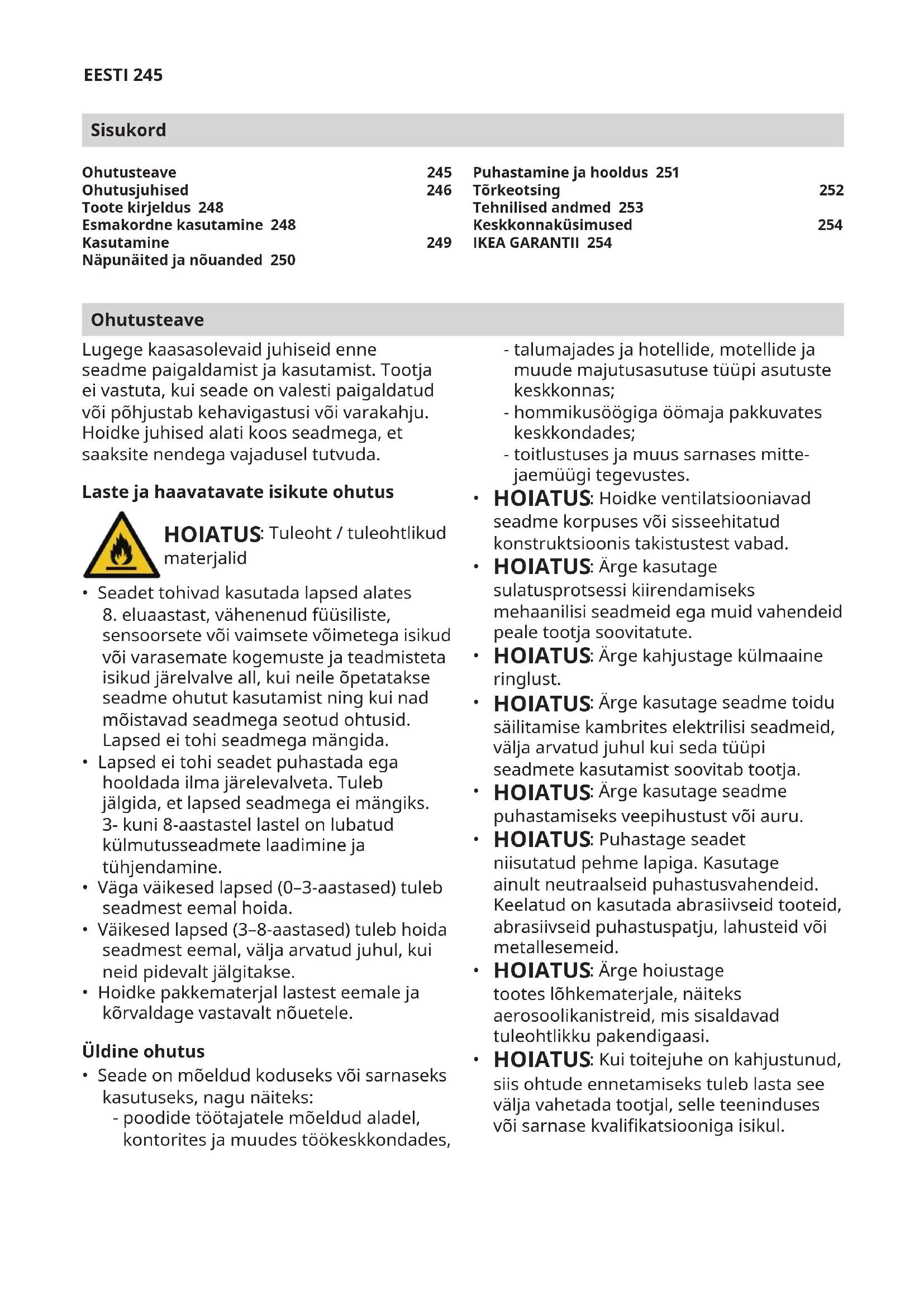 - soovite lasta selgitada IKEA seadmete funktsioone. Parima abi saamiseks lugege enne meie poole pöördumist hoolikalt läbi paigaldusjuhised ja/või kasutujuhend. Kuidas meie poole pöörduda, kui vajate meie abi IKEA määratud müügijärgse teeninduse pakkujate telefoninumbrid leiate selle kasutusjuhendi lõpust. Kiirema teeninduse pakkumiseks soovitame kasutada selles kasutusjuhendis loetletud konkreetseid telefoninumbreid. Kasutage toe vajamisel alati konkreetse seadme kasutusjuhendis toodud numbreid. Ärge unustage sisestada oma seadme andmeplaadil näidatud 8-kohaline artiklinumber ja 22-kohaline seerianumber. HOIDKE OSTUKVIITUNG ALLES! See tõendab teie ostu ja seda nõutakse garantiinõude korral. Lisaks on ostukviitungil IKEA kaupluse nimi ja iga teie ostetud seadme tootenumber (8-kohaline kood). Kas vajate täiendavat abi? Nende lisaküsimustega, mis ei ole seotud teie seadme järelhooldusega, pöörduge lähima IKEA kaupluse klienditeenindusosakonda. Enne ühenduse võtmist soovitame teil seadme juhendid hoolikalt läbi lugeda. Varuosade teave - Järgmised varuosad: termostaadid, temperatuuriandurid, trükkplaadid ja valgusallikad on professionaalsetele remonditöökodadele kättesaadavad vähemalt seitsmeks aastaks pärast mudeli viimase üksuse müüki minekut. - Järgmised varuosad: ukselingid, uksehinged, alused ja korvid on professionaalsetele remonditöökodadele ja lõppkasutajatele saadaval vähemalt seitse aastat ning uksetihendid vähemalt 10 aastat pärast mudeli viimase üksuse müüki minekut. Varuosasid võib leida aadressilt: www.ikea.comHRVATSKI 256 Sadržaj Sigurnosne informacije Prije instalacije i uporabe uređaja, pažljivo pročitajte priložene upute. Proizvođač nije odgovoran, ako nepravilna instalacija ili uporaba prouzrokuju ozljede i štetu. Upute držite uvijek zajedno s uređajem za buduću uporabu. Sigurnost djece i nemoćnih osoba UPOZORENJE: Opasnost od požara / Zapaljivi materijali