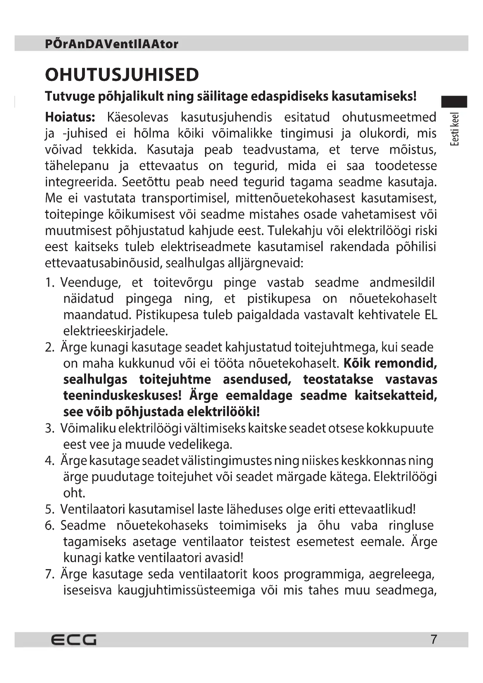 Põrandaventilaator OHUTUSJUHISED Tutvuge põhjalikult ning säilitage edaspidiseks kasutamiseks! Hoiatus: Käesolevas kasutusjuhendis esitatud ohutusmeetmed ja -juhised ei hõlma kõiki võimalikke tingimusi ja olukordi, mis võivad tekkida. Kasutaja peab teadvustama, et terve mõistus, tähelepanu ja ettevaatus on tegurid, mida ei saa toodetesse integreerida. Seetõttu peab need tegurid tagama seadme kasutaja. Me ei vastutata transportimisel, mittenõuetekohasest kasutamisest, toitepinge kõikumisest või seadme mistahes osade vahetamisest või muutmisest põhjustatud kahjude eest. Tulekahju või elektrilöögi riski eest kaitseks tuleb elektriseadmete kasutamisel rakendada põhilisi ettevaatusabinõusid, sealhulgas alljärgnevaid: