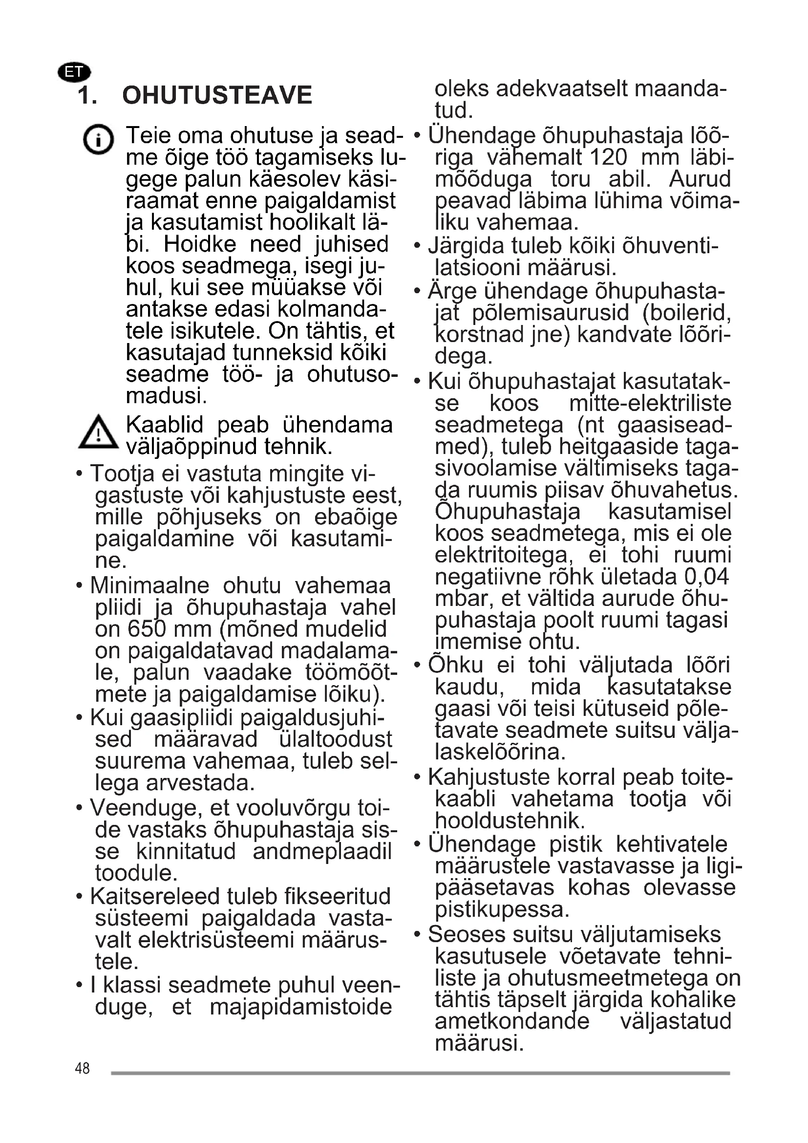 Teie oma ohutuse ja sead- me õige töö tagamiseks lu- gege palun käesolev käsi- raamat enne paigaldamist ja kasutamist hoolikalt lä- bi. Hoidke need juhised koos seadmega, isegi ju- hul, kui see müüakse või antakse edasi kolmanda- tele isikutele. On tähtis, et kasutajad tunneksid kõiki seadme töö- ja ohutuso- madusi. Kaablid peab ühendama väljaõppinud tehnik.