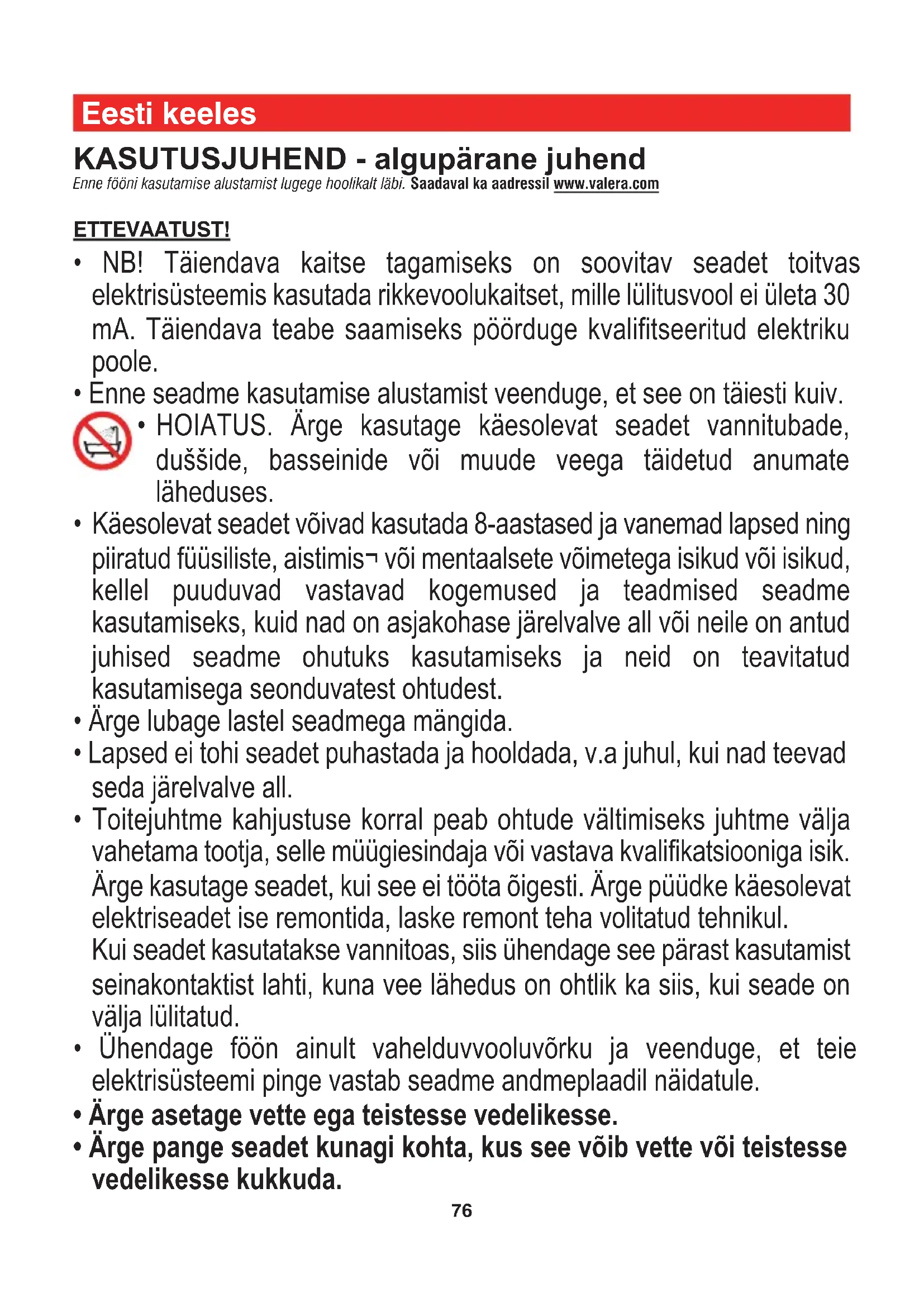 - HOIATUS. Ärge kasutage käesolevat seadet vannitubade, duššide, basseinide või muude veega täidetud anumate läheduses.