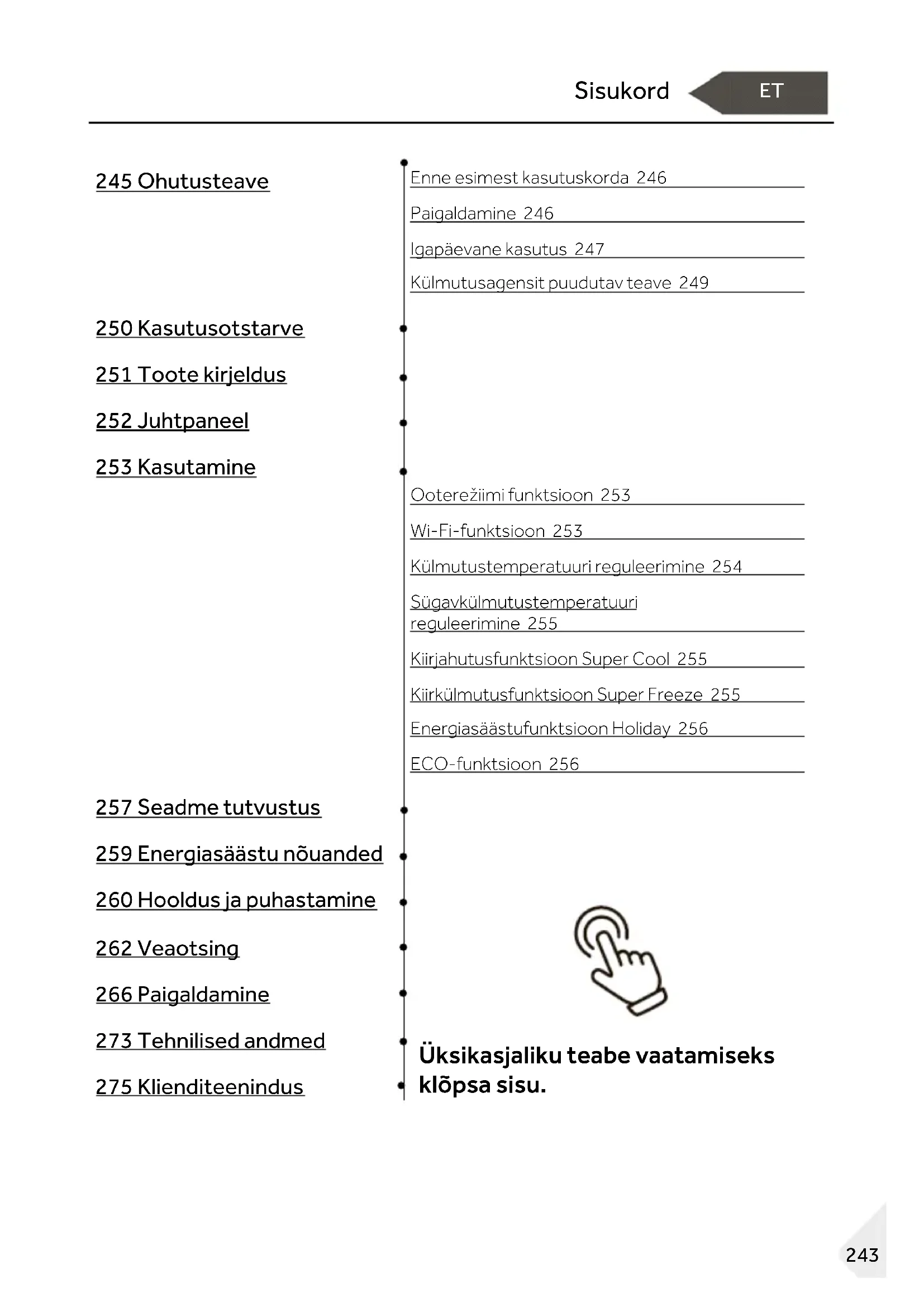 Sisukord 245 Ohutusteave Enne esimest kasutuskorda 246 Paigaldamine 246 Igapäevane kasutus 247 Külmutusagensit puudutav teave 249 250 Kasutusotstarve