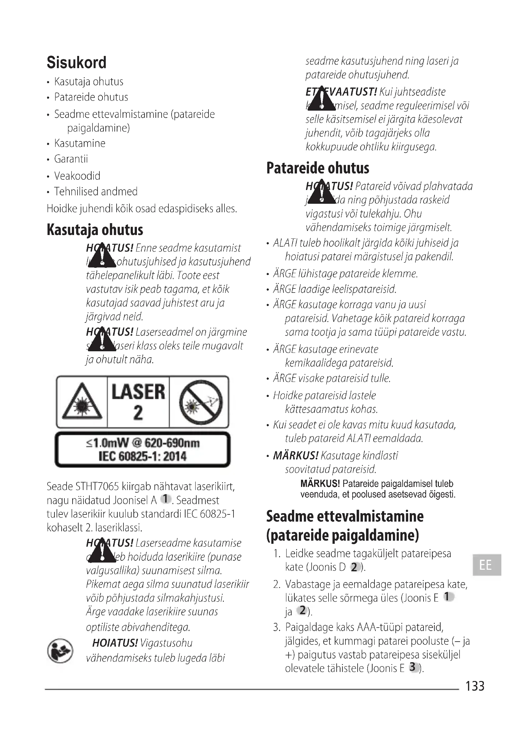 Seade STHT7065 kiirgab nähtavat laserikiirt, nagu näidatud Joonisel A . Seadmest tulev laserikiir kuulub standardi IEC 60825-1 kohaselt2.laseriklassi. HOIATUS! Laserseadme kasutamise ajal tuleb hoiduda laserikiire (punase valgusallika) suunamisest silma. Pikemat aega silma suunatud laserikiir võib põhjustada silmakahjustusi. Ärge vaadake laserikiire suunas optilisteabivahenditega. HOIATUS! Vigastusohu vähendamiseks tuleb lugeda läbi seadme kasutusjuhend ning laseri ja patareideohutusjuhend. ETTEVAATUST! Kui juhtseadiste kasutamisel, seadme reguleerimisel või selle käsitsemisel ei järgita käesolevat juhendit, võib tagajärjeks olla kokkupuude ohtlikukiirgusega. Patareide ohutus