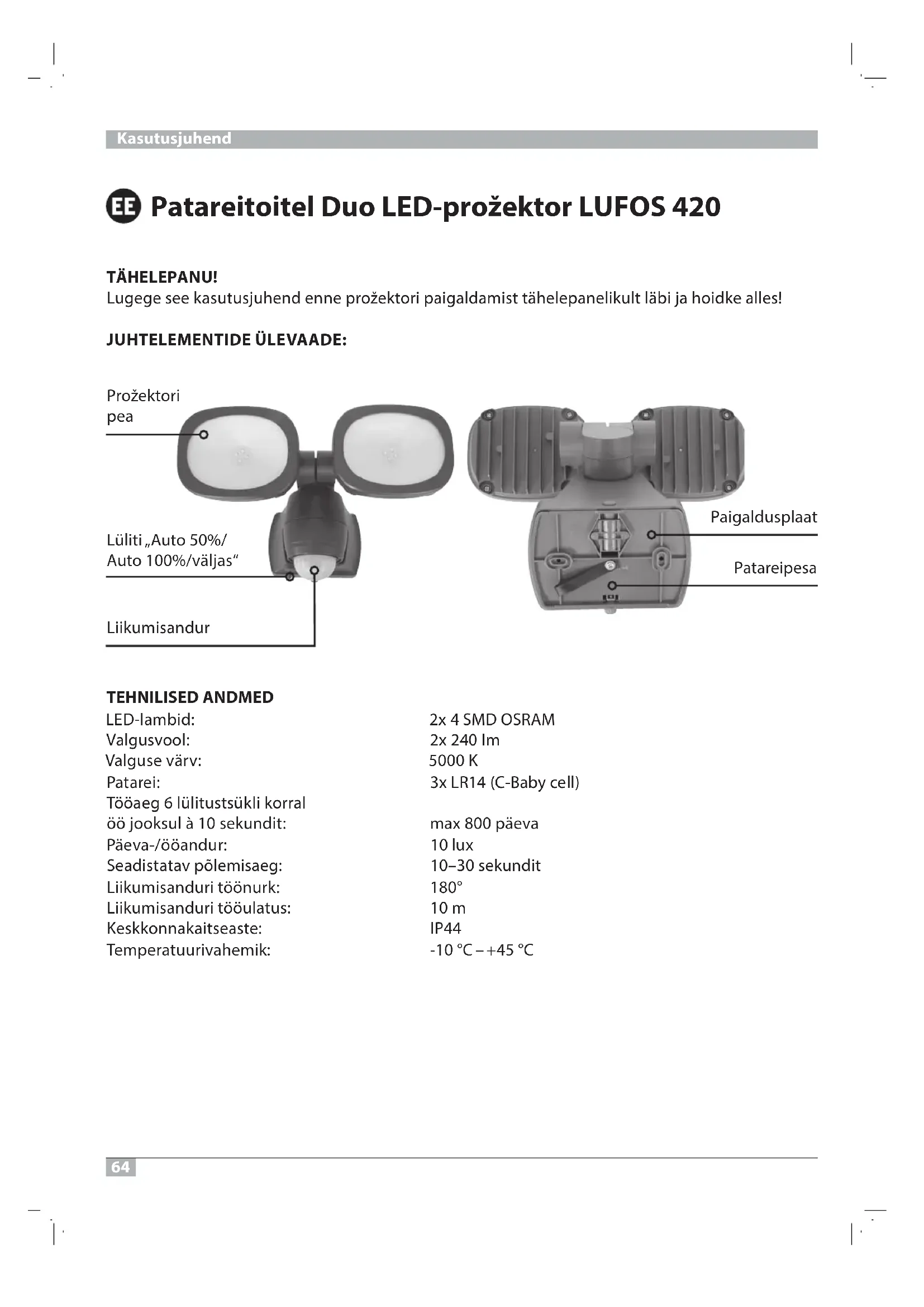 A declaração de conformidade encontra-se no fabricante. Fabricante Hugo Brennenstuhl GmbH & Co. KG Seestraße 1 – 3 · D-72074 Tübingen H. Brennenstuhl S.A.S. lectra technik ag Blegistrasse 13 · CH-6340 Baar www.brennenstuhl.com64 Patareitoitel Duo LED-prožektor LUFOS 420 TÄHELEPANU! Lugege see kasutusjuhend enne prožektori paigaldamist tähelepanelikult läbi ja hoidke alles! JUHTELEMENTIDE ÜLEVAADE: TEHNILISED ANDMED MARSO DMS 4x2 :dibmal-DEL mI 042 x2 :loovsuglaV K 0005 :vräv esuglaV )llec ybaB-C( 41RLx3 :ierataP Tööaeg 6 lülitustsükli korral öö jooksul à10 sekundit: max 800 päeva xul 01 :rudnaöö/-aveäP Seadistatav põlemisaeg: 10–30 sekundit Liikumisanduri töönurk: 180° Liikumisanduri tööulatus: 10m Keskkonnakaitseaste: IP44 Temperatuurivahemik: -10°C – +45°C Kasutusjuhend Prožektori pea Paigaldusplaat Patareipesa Liikumisandur Lüliti „Auto 50%/ Auto 100%/väljas“65 See patareitoitel LED-prožektor sobib kasutamiseks sise- ja välistingimustes ning on mõeldud püsipaigaldamiseks. Prožektorit ei tohi kasutada muudel eesmärkidel. OHUTUSJUHISED