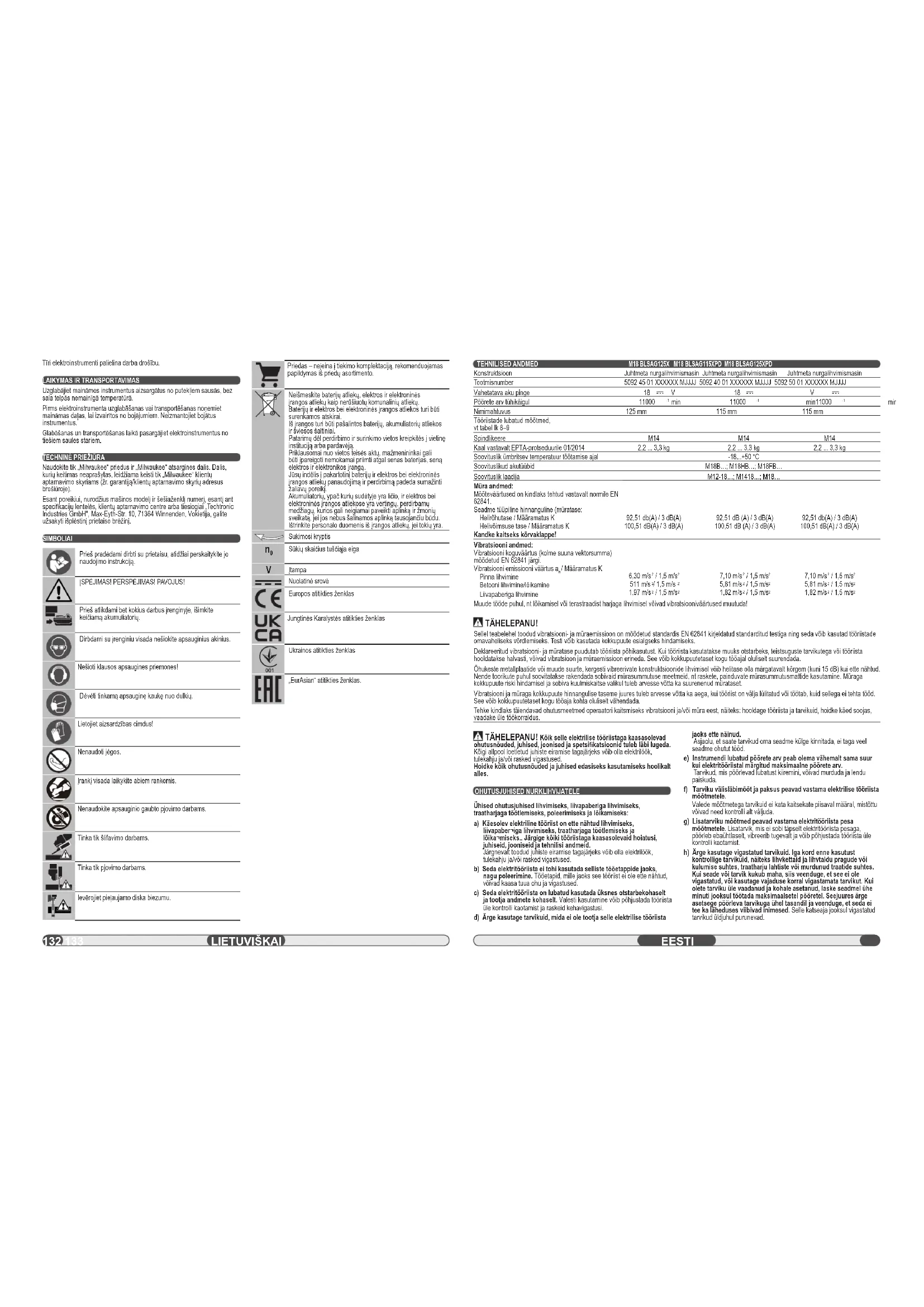 Hoiustage kasutatavaid tööriistu tolmu eest kaitstult kuivas ja roostet mittetekitavas ruumis ühtlase temperatuuri juures. Enne elektritööriista hoiule panemist või transportimist eemaldage kahjustuste vältimiseks tarvikud. Ärge kasutage kahjustatud tööriistu. Kaitske elektritööriistu hoiustamisel ja transpordil otsese päikesekiirguse eest. HOOLDUS Kasutage ainult Milwaukee tarvikuid ja Milwaukee tagavaraosi. Detailid, mille väljavahetamist pole kirjeldatud, laske välja vahetada Milwaukee klienditeeninduspunktis (vaadake brošüüri garantii / klienditeeninduste aadressid). Vajadusel saab nõuda seadme plahvatusjoonise võimsussildil oleva masinatüübi ja kuuekohalise numbri alusel klienditeeninduspunktist või vahetult fi rmalt Techtronic Industries GmbH, Max-Eyth-Straße 10, 71364 Winnenden, Germany. SÜMBOLID Palun lugege enne käikulaskmist kasutamisjuhend hoolikalt läbi. TÄHELEPANU! HOIATUS! OHT! Enne kõiki töid masina kallal võtke vahetatav aku välja. Masinaga töötades kandke alati kaitseprille. Kandke kaitseks kõrvaklappe! Kanda sobivat kaitsemaski. Kanda kaitsekindaid! Ärge kasutage jõudu. Liigutage tööriista alati mõlema käega. Ärge kasutage kettakaitset lõikamistöödeks. Ainult lihvimistöödeks. Ainult lõikamistöödeks. Pidage silmas lubatud kettapaksust. Tarvikud - ei kuulu tarne komplekti, soovitatav täiendus on saadaval tarvikute programmis. Ärge kõrvaldage patareide, elektri- ja elektroonikaseadmete jäätmeid sorteerimata olmejäätmetena. Akude, elektri- ja elektroonikaseadmete jäätmed tuleb koguda eraldi. Akude, akumulaatorite ja valgusallikate jäätmed tuleb seadmetest eemaldada. Küsige oma kohalikust omavalitsusest või jaemüüjalt nõuandeid ringlussevõtu ja kogumispunkti kohta. Olenevalt kohalikest määrustest võib jaemüüjal lasuda kohustus võtta akude, elektri- ja elektroonikaseadmeid vastu tasuta. Teie panus akude, elektri- ja elektroonikaseadmete jäätmete korduskasutusse ja ringlussevõttu aitab vähendada nõudlust toorainete järele. Akud, eriti liitiumakud ning elektri- ja elektroonikaseadmete jäätmed, sisaldavad väärtuslikke taaskasutatavaid materjale, mis võivad kahjustada keskkonda ja inimeste tervist, kui neid ei kõrvaldata keskkonnasõbralikul viisil. Kustutage kõrvaldatavatest seadmetest isiklikud andmed, kui neid seal on. Pöörlemissuund
