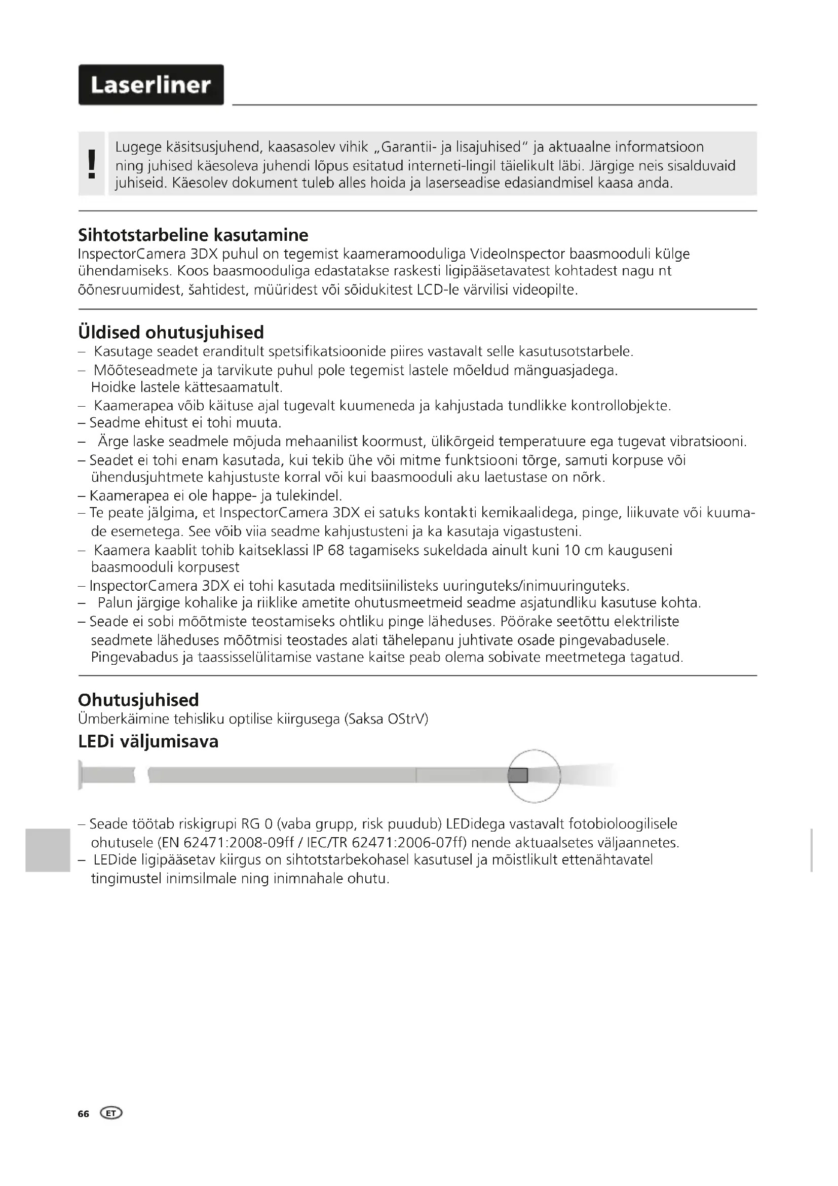 Sihtotstarbeline kasutamine InspectorCamera 3DX puhul on tegemist kaameramooduliga VideoInspector baasmooduli külge ühendamiseks. Koos baasmooduliga edastatakse raskesti ligipääsetavatest kohtadest nagu nt õõnesruumidest, šahtidest, müüridest või sõidukitest LCD-le värvilisi videopilte. Üldised ohutusjuhised – Kasutage seadet eranditult spetsikatsioonide piires vastavalt selle kasutusotstarbele. – Mõõteseadmete ja tarvikute puhul pole tegemist lastele mõeldud mänguasjadega. Hoidke lastele kättesaamatult. – Kaamerapea võib käituse ajal tugevalt kuumeneda ja kahjustada tundlikke kontrollobjekte. – Seadme ehitust ei tohi muuta. – Ärge laske seadmele mõjuda mehaanilist koormust, ülikõrgeid temperatuure ega tugevat vibratsiooni. – Seadet ei tohi enam kasutada, kui tekib ühe või mitme funktsiooni tõrge, samuti korpuse või ühendusjuhtmete kahjustuste korral või kui baasmooduli aku laetustase on nõrk. – Kaamerapea ei ole happe- ja tulekindel. – Te peate jälgima, et InspectorCamera 3DX ei satuks kontakti kemikaalidega, pinge, liikuvate või kuuma- de esemetega. See võib viia seadme kahjustusteni ja ka kasutaja vigastusteni. – Kaamera kaablit tohib kaitseklassi IP 68 tagamiseks sukeldada ainult kuni 10 cm kauguseni baasmooduli korpusest – InspectorCamera 3DX ei tohi kasutada meditsiinilisteks uuringuteks/inimuuringuteks. – Palun järgige kohalike ja riiklike ametite ohutusmeetmeid seadme asjatundliku kasutuse kohta. – Seade ei sobi mõõtmiste teostamiseks ohtliku pinge läheduses. Pöörake seetõttu elektriliste seadmete läheduses mõõtmisi teostades alati tähelepanu juhtivate osade pingevabadusele. Pingevabadus ja taassisselülitamise vastane kaitse peab olema sobivate meetmetega tagatud. Ohutusjuhised Ümberkäimine tehisliku optilise kiirgusega (Saksa OStrV) LEDi väljumisava – Seade töötab riskigrupi RG 0 (vaba grupp, risk puudub) LEDidega vastavalt fotobioloogilisele ohutusele (EN 62471:2008-09ff / IEC/TR 62471:2006-07ff) nende aktuaalsetes väljaannetes. – LEDide ligipääsetav kiirgus on sihtotstarbekohasel kasutusel ja mõistlikult ettenähtavatel tingimustel inimsilmale ning inimnahale ohutu. Lugege käsitsusjuhend, kaasasolev vihik „Garantii- ja lisajuhised“ ja aktuaalne informatsioon ning juhised käesoleva juhendi lõpus esitatud interneti-lingil täielikult läbi. Järgige neis sisalduvaid juhiseid. Käesolev dokument tuleb alles hoida ja laserseadise edasiandmisel kaasa anda. !InspectorCamera 3DX