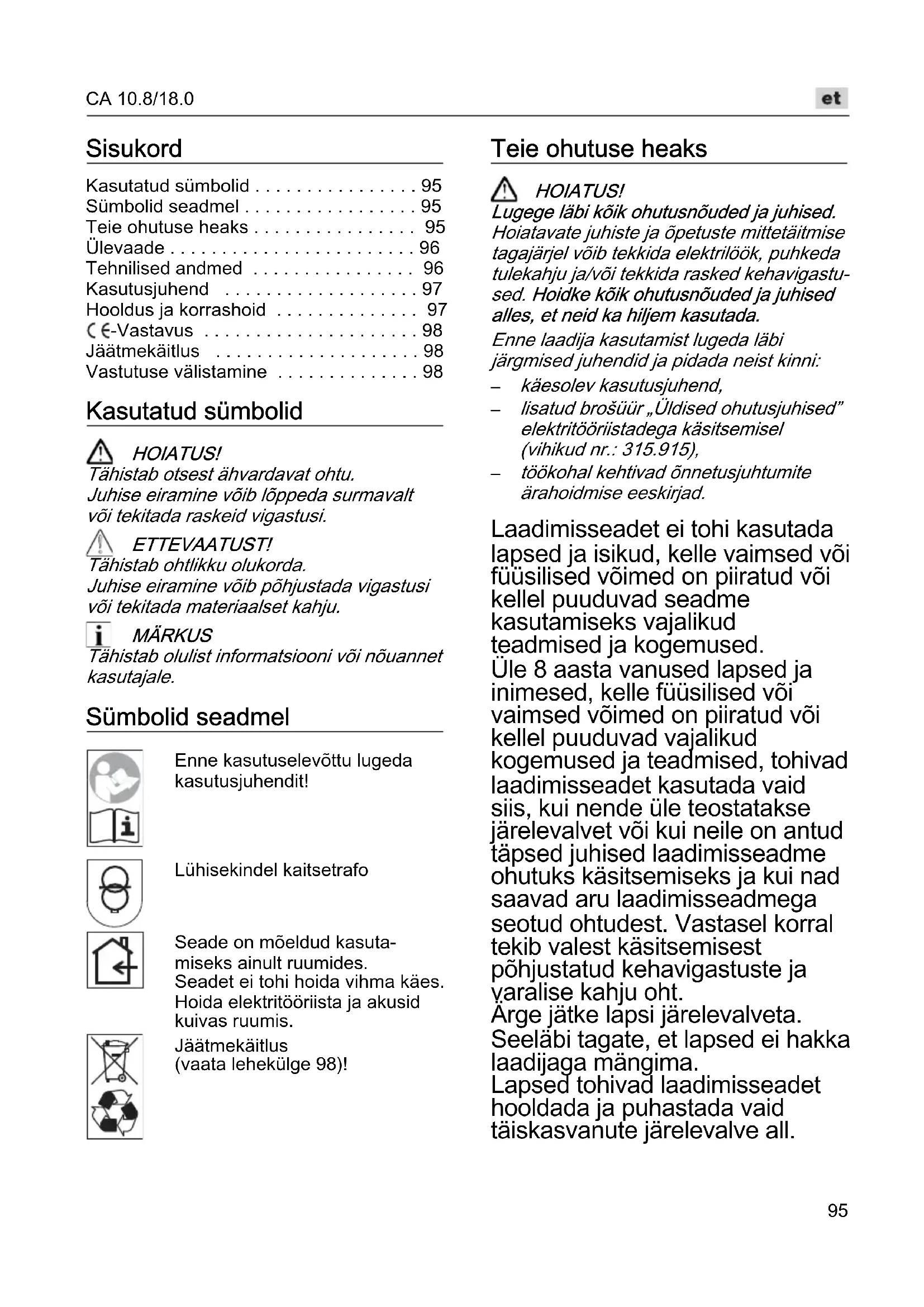- Vastutuse välistamine Kasutatud sümbolid HOIATUS! Tähistab otsest ähvardavat ohtu. Juhise eiramine võib lõppeda surmavalt või tekitada raskeid vigastusi. ETTEVAATUST! Tähistab ohtlikku olukorda. Juhise eiramine võib põhjustada vigastusi või tekitada materiaalset kahju. MÄRKUS Tähistab olulist informatsiooni või nõuannet kasutajale. Sümbolid seadmel Enne kasutuselevõttu lugeda kasutusjuhendit! Lühisekindel kaitsetrafo Seade on mõeldud kasuta- miseks ainult ruumides. Seadet ei tohi hoida vihma käes. Hoida elektritööriista ja akusid kuivas ruumis. Jäätmekäitlus (vaata lehekülge 98)! Teie ohutuse heaks HOIATUS! Lugege läbi kõik ohutusnõuded ja juhised. Hoiatavate juhiste ja õpetuste mittetäitmise tagajärjel võib tekkida elektrilöök, puhkeda tulekahju ja/või tekkida rasked kehavigastu- sed. Hoidke kõik ohutusnõuded ja juhised alles, et neid ka hiljem kasutada. Enne laadija kasutamist lugeda läbi järgmised juhendid ja pidada neist kinni: p. 98