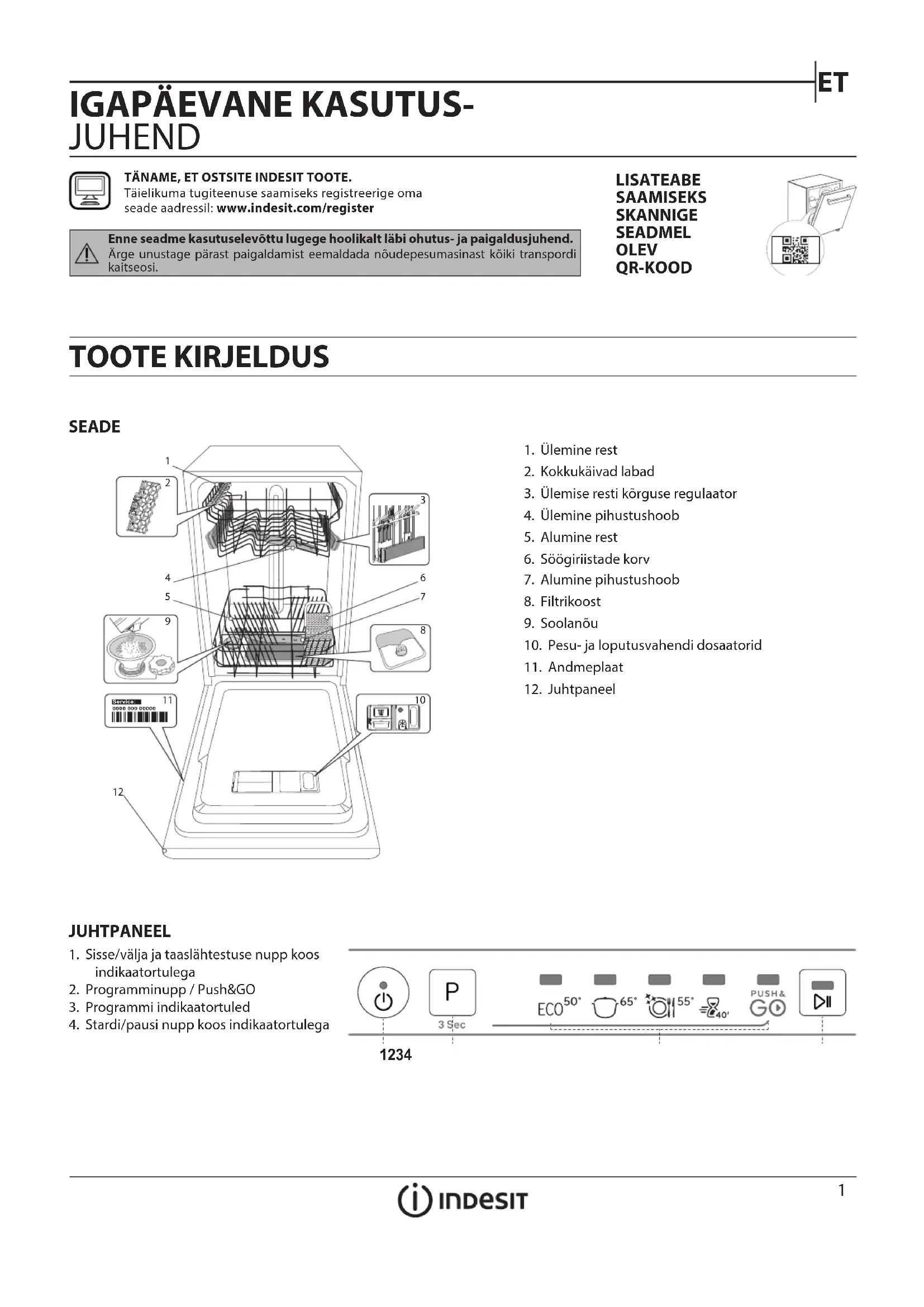LISATEABE SAAMISEKS SKANNIGE SEADMEL OLEV QR-KOOD Enne seadme kasutuselevõttu lugege hoolikalt läbi ohutus- ja paigaldusjuhend.Ärge unustage pärast paigaldamist eemaldada nõudepesumasinast kõiki transpordi kaitseosi.2 ESMAKASUTUS