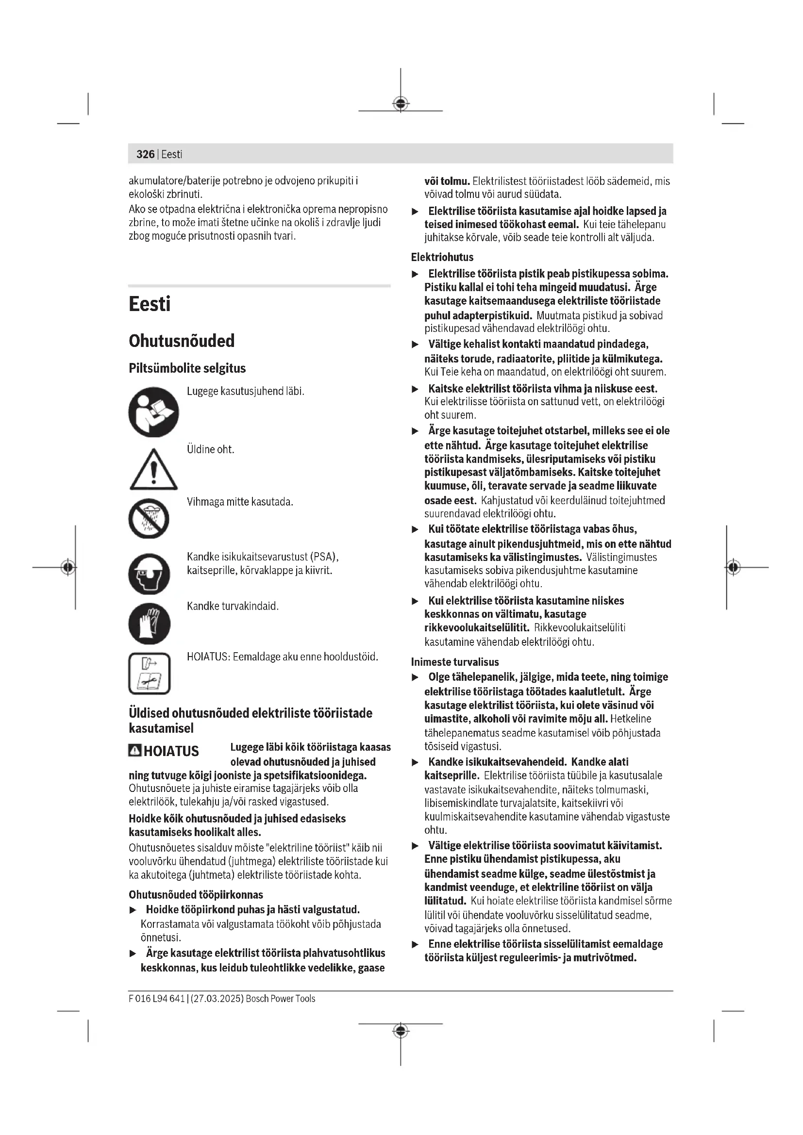 °C 0 ... +40 Ühilduvad akud GBA 18V... ProCORE18V... 5.5Ah, 8.0Ah, 12Ah Soovitatud akud ProCORE18V... ≥ 5.5Ah F 016 L94 641 | (27.03.2025) Bosch Power ToolsEesti | 331 Kõrglõikur GKE 18V-25 TP Soovituslikud laadijad GAL 18... GAX 18... A) sõltuvalt kasutatud akust B) piiratud jõudlus temperatuuridel <0°C C) Ärge kasutage seadet temperatuuril >40°C. Väärtused võivad olenevalt tootest varieeruda ja oleneda kasutus- ning keskkonnatingimustest.Täiendav teave veebisaidil www.bosch-professional.com/wac. Müra-/vibratsiooniväärtused