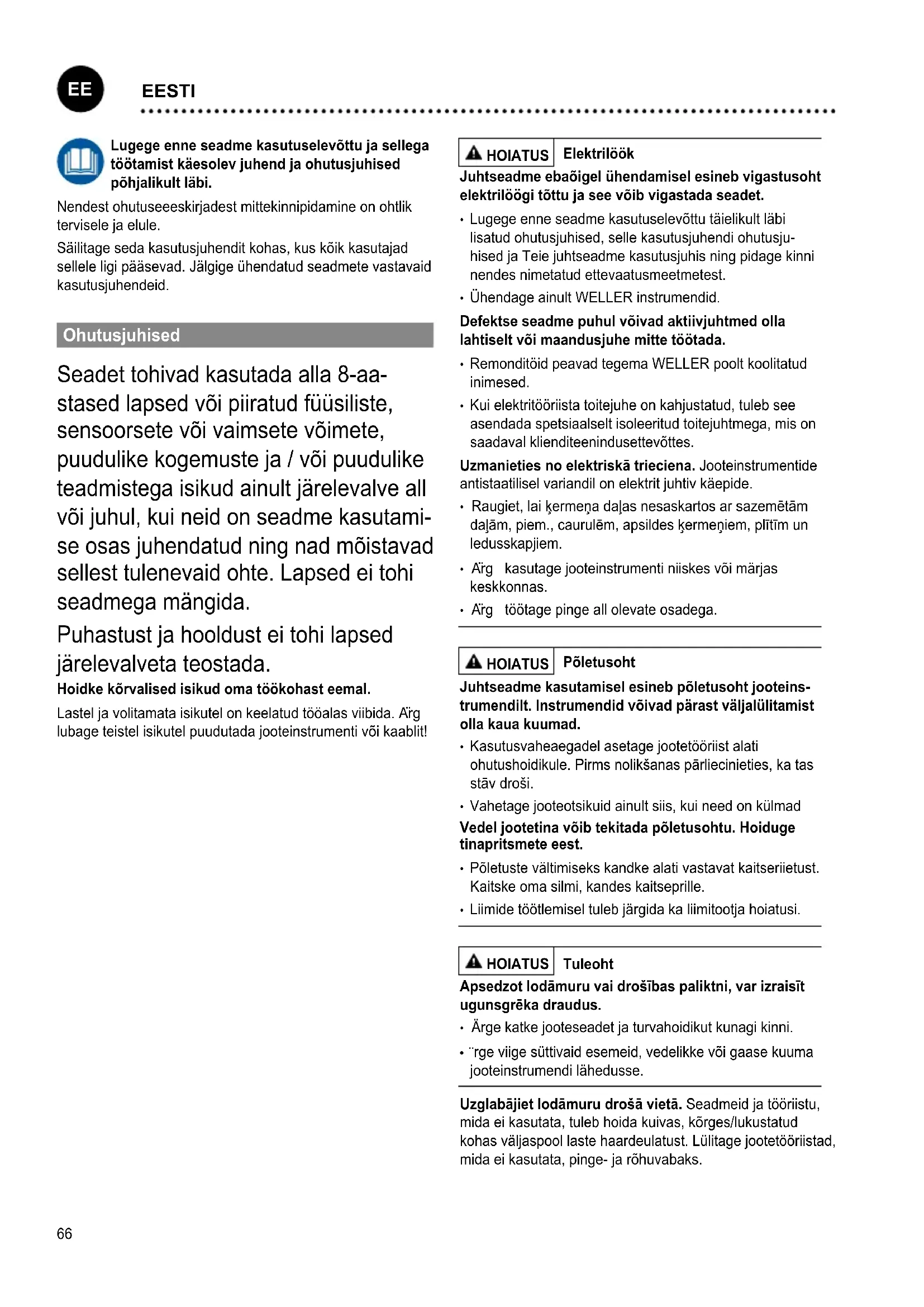 EESTI67 Võrgukaablit tohib ühendada ainult selleks lubatud võrgupistikupesa või adapteriga. Kontrollige, kas võrgupinge vastab tüübisildil nõutavale. Ühendage seade pistikupessa ainult väljalülitatud olekus. Neizmantojiet kabeli tādiem mērķiem, kuriem tas nav paredzēts. rgetõstkeseadetjuhtmest.Neraujietkabeli,lai izvilktukontaktdakšunokontaktligzdas.Sargājietkabelino karstuma,eļļasunasāmmalām. Esiet uzmanīgs. Olge tähelepanelik. Olge töötamisel mõist- lik.Nelietojietlodāmuru,janevaratkoncentrēties. Centieties neieņemt neparastas ķermeņa pozas. Savu darbavietuiekārtojietergonomiskipareizi.Vältigetöötamisel halba rühti, sest sellega võivad kaasneda rühiprobleemid. Jooteinstrumenti tohib kasutusele võtta ainult siis, kui see on tehniliselt laitmatus seisukorras. Kaitseseadmeid ei tohi välja lülitada. Tõrked ja defektid tuleb kõrvaldada kohe. Pärastseadme/ tööriista iga kasutuskorda tuleb kaitseseadmeid põhjalikult kontrollida laitmatu ja nõuetekohase toimimise suhtes. Veenduge, et liikuvad osad töötaksid laitmatult ega jääks kinni ning et osad ei oleks kahjustatud. Seadme laitmatu töö tagamiseks peavad kõik osad olema õigesti paigaldatud ja kõik tingimused täidetud. Kasutage õiget tööriista. Kasutage üksnes neid tarvikuid ja lisaseadmeid, mis on tarvikuloendis või millel on tootja kasu- tusluba. Kasutage WELLER tarvikuid ja lisaseadmeid üksnes originaalsete WELLER seadmetega. Teiste tootjate tööriista- de ja tarvikute kasutamisega võib kaasneda vigastusoht. Fikseerige tööriist. Kasutage detaili kinnihoidmiseks kinnitusseadmeid. Kasutage jooteaurude äratõmbeseadet. Kui saab ühendada jooteaurude äratõmbeseadmeid, veenduge, et need ühendataks ja et neid õigesti kasutataks. Kasutusotstarbele vastav käitamine WELLER jooteinstrumentide toiteplokk. Kasutage jootejaama ainultkasutusjuhendisnimetatudotstarbel,seetähendab: jootmiseks siin kirjeldatud tingimustel. Seda seadet tohib kasutada üksnes toatemperatuuril ja siseruumides. Kaitske seadet niiskuse ja otsese päikeseki- irguse eest.