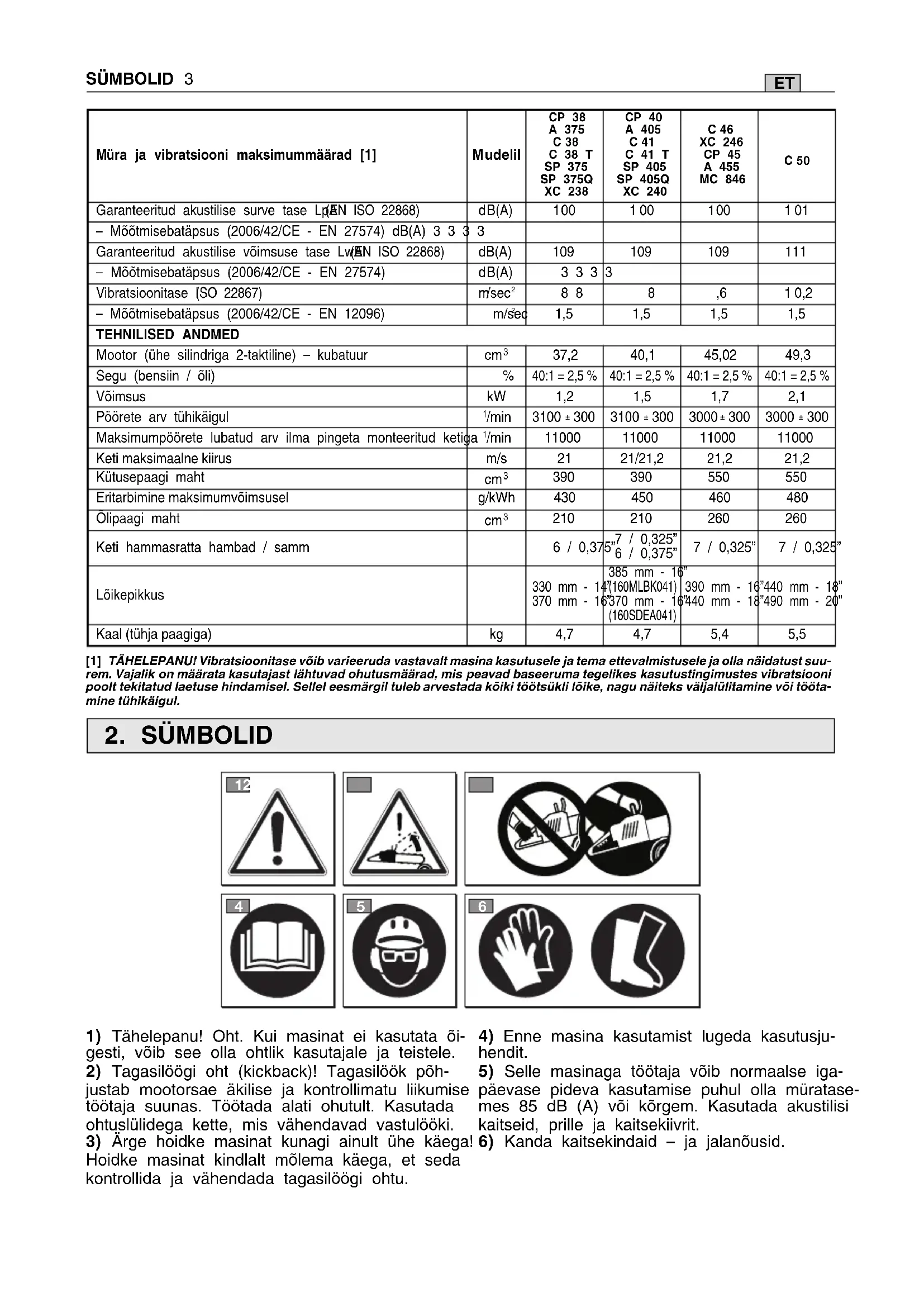Keti hammasratta hambad / samm 6 / 0,375” 7 / 0,325” 6 / 0,375” 7 / 0,325” 7 / 0,325” Lõikepikkus 330 mm - 14” 370 mm - 16” 385 mm - 16” (160MLBK041) 370 mm - 16” (160SDEA041) 390 mm - 16” 440 mm - 18” 440 mm - 18” 490 mm - 20” Kaal (tühja paagiga) kg 4,7 4,7 5,4 5,5 [1] TÄHELEPANU! Vibratsioonitase võib varieeruda vastavalt masina kasutusele ja tema ettevalmistusele ja olla näidatust suu- rem. Vajalik on määrata kasutajast lähtuvad ohutusmäärad, mis peavad baseeruma tegelikes kasutustingimustes vibratsiooni poolt tekitatud laetuse hindamisel. Sellel eesmärgil tuleb arvestada kõiki töötsükli lõike, nagu näiteks väljalülitamine või tööta- mine tühikäigul.ET