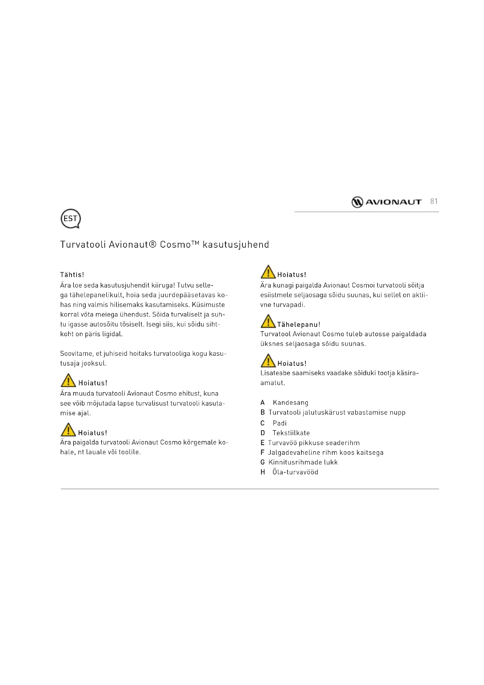 - Esta garantía ha sido preparada por la empresa Ł.KARWALA, establecida en Polonia. Razón social de la empresa: Szarlejka, ul. Lukaszewicza 172 42-130 Wreczyca Wielka, Polska (1) Los productos comprados con etiquetas o números de identificación modificados o sin ellos, se consideran no autorizados. Debido a que no se puede confirmar la autenticidad de dichos productos, la garantía no los cubre. 80Tähtis! Ära loe seda kasutusjuhendit kiiruga! Tutvu selle- ga tähelepanelikult, hoia seda juurdepääsetavas ko- has ning valmis hilisemaks kasutamiseks. Küsimuste korral võta meiega ühendust. Sõida turvaliselt ja suh- tu igasse autosõitu tõsiselt. Isegi siis, kui sõidu siht- koht on päris ligidal. Soovitame, et juhiseid hoitaks turvatooliga kogu kasu- tusaja jooksul. Hoiatus! Ära muuda turvatooli Avionaut Cosmo ehitust, kuna see võib mõjutada lapse turvalisust turvatooli kasuta- mise ajal. Hoiatus! Ära paigalda turvatooli Avionaut Cosmo kõrgemale ko- hale, nt lauale või toolile. Turvatooli Avionaut® Cosmo™ kasutusjuhend Hoiatus! Ära kunagi paigalda Avionaut Cosmoi turvatooli sõitja esiistmele seljaosaga sõidu suunas, kui sellel on aktii- vne turvapadi. Tähelepanu! Turvatool Avionaut Cosmo tuleb autosse paigaldada üksnes seljaosaga sõidu suunas. Hoiatus! Lisateabe saamiseks vaadake sõiduki tootja käsira- amatut. A Kandesang B Turvatooli jalutuskärust vabastamise nupp C Padi D Tekstiilkate E Turvavöö pikkuse seaderihm F Jalgadevaheline rihm koos kaitsega G Kinnitusrihmade lukk H Õla-turvavööd EST 81I Eemaldatavate kaitsetega õlarihmad J Auto puusa-turvavöö kinnituskonks K Aluse kinnitus L Kandmiskäepideme seadenupp M Peatoed N Päikesevari O Pöörlemisvastane raam P Aluse paigaldamise ISOFIX-kinniti R ISOFIX-kinniti vabastusnupp S Turvatooli lukustuse vabastuskang T Seatav jalg U Juhtpaneel V Tooli kinnitusmehhanism W Auto õla-turvavöö kinnituskonks X Tagumine tala Y Varju kinnitus Ohutus, kasutamine ja reisimine