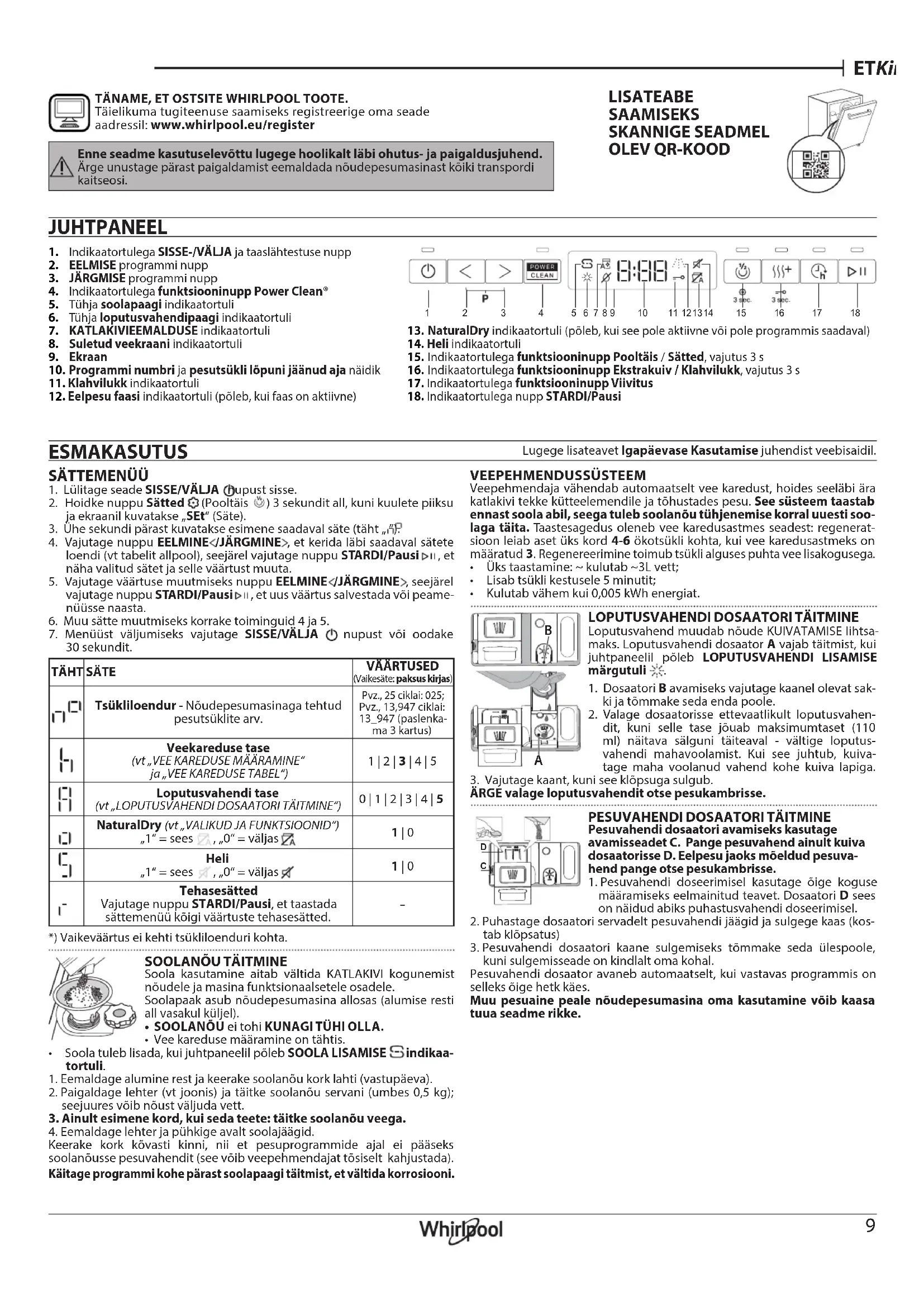 Katlakivieemaldi indikaator põleb või vilgub; kuvatud on alarm «dES». Katlakivi koguneb seadme sisekomponen- tidele. Eemaldage katlakivi kohe Isepuhastusprogrammi ning kaubandusvõrgust saa- daval katlakivieemaldi abil (vt VALIKUD JA FUNKTSIOONID). Täitke paak soolaga. Kontrollige vee kareduse sätet. Kui seadmest ei eemaldata katlakivi, lakkab see töötamast. Vesi ei voola nõude- pesumasinat välja. Ekraanil kuvatakse: F7 E3 või F9 E1 Toidujäägid või katlakivi on ltri ummistanud. Puhastage lter ja eemaldage seadmest katlakivi (vt FILTRI PUHASTAMINE ja KAT- LAKIVI EEMALDAMINE). Äravooluvoolik on kokku surutud. Kontrollige äravooluvoolikut (vt PAIGALDUSJUHENDIT). Vee äravool on umbes. Puhastage vee äravoolutoru. Nõudepesumasinasse ei tule vett. Ekraanil on kuvatud: H2O ja see põleb; kõlab helialarm. Torustikus ei ole vett või on kraan kinni. Veenduge, et torustikust tuleks vett ja kraan oleks lahti. Vee sisselaskevoolik on kokku surutud. Kontrollige sisselaskevoolikut (vt jaotist PAIGALDUS). Sulgege uks ja vajutage nuppu STARDI/Pausi. Vee sisselaskevooliku sõel on umbes; see vajab puhastamist. Kontrollige ja puhastage vee sisselaskevooliku sõela. Sulgege uks ja vajutage nuppu STARDI/Pausi. Nõudepesumasin lõpetab tsükli enne- aegselt. Ekraanil on kuvatud: F8 E3 Toidujäägid või katlakivi on ltri ummista- nud. Puhastage lter ja eemaldage seadmest katlakivi (vt FILTRI PUHASTAMINE ja KAT- LAKIVI EEMALDAMINE). Äravooluvoolik on liiga madalal või äravoo- luava juurest vaakumisse tõmmanud. Kontrollige, kas äravooluvooliku ots asub õigel kõrgusel (vt PAIGALDUS). Kontrollige ühendust reoveesüsteemi ja paigaldage vajaduse korral õhuklapp. Masinas on liiga palju vahtu. Pesuvahendit on valesti doseeritud või ei sobi see nõudepesumasinas kasutami- seks (vt PESUVAHENDI DOSAATORI TÄITMINE). Õhk veevarustuses. Kontrollige, kas veevarustuses on lekkeid või pääseb õhk mingil muul viisil sisse. Nõud ei ole kuivad. Loputusvahendit pole või on seda liiga vähe. Veenduge, et loputusvahendi dosaator oleks täidetud (vt LOPUTUSVAHENDI DOSAATORI TÄITMINE). Ainult mitmeotstarbeliste tablettidega ei saavutata sama head kuivatust kui vedelat loputusvahendit kasutades. Nõud on masinast eemaldatud pärast ukse automaatset avanemist, kuid enne tsükli tegelikku lõppemist. Veenduge, et tsükkel oleks lõppenud, enne kui alustate nõude väljavõtmist (vt IGAPÄEVANE KASUTAMINE)). Veelgi parema kuivatuse saavutamiseks on soovita- tav lasta nõudel nõudepesumasinas avatud uksega pärast tsükli lõppemist veel 15 minutit seista. Nõud pole piisava kalde all. Kui täheldate topside, kruuside või kausside süvendites vett, proovige nõud suu- rema kalde all paigutada (eriti ülemisel restil), et suurem kogus vett saaks enne kuivatamise algust maha tilkuda. Valitud tsüklil puudub kuivatusfaas. Kontrollige PROGRAMMIDE TABEL, kas valitud programmil on olemas kuiva- tusfaas. Ilma kuivatusfaasita tsükli korral ei pruugi kuivatus olla soovitud tulemu- sega, seega on soovitatav valida kuivatusfaasiga tsükkel. Nõud on tehtud teonist või plastikust. Seda tüüpi materjali korral on mõnede veetilkade esinemine normaalne. Nõudel ja klaasidel on näha katlakivi või valkjaid plekke. Soolapaak on tühi. Täitke paak esimesel võimalusel soolaga. Seadme kasutamine ilma soolata võib selle sisekomponente kahjustada. Vee kareduse säte on liiga väike. Valige suurem väärtus (vt VEE KAREDUSE TABEL). Soolanõu kork pole korralikult suletud. Kontrollige soolapaagi korki ja sulgege see. Loputusvahendi paak on tühi või loputus- vahendi kogus on liiga väike. Täitke dosaator loputusvahendiga ja kontrollige doosi sätet (lisateavet - vt LOPU- TUSVAHENDI DOSAATORI TÄITMINE). Nõudepesumasinal on kuvatud: F8 E5 Klapp on blokeeritud või defektne. Sulgege võimaluse korral veekraan. Ärge lülitage toiteallikat välja. Helistage teenindusse. Pesuaine leke. Oleneb kasutatavast pesuainevedelikust ja see võib esile tõusta, kui aktiveeritud on viivitusvalik. Väikesed lekked ei põhjusta masina talitlushäireid ja neid saab vältida, kui vahe- tada pesuainevedeliku tüüpi või kasutada tablette. VEAOTSING Lisateabe saamiseks skannige seadmel olev QR-kood. ®/TM/© 2024 Whirlpool. Toodetud litsentsi alusel. Kui nõudepesumasin ei tööta korralikult, kontrollige, kas probleemi on võimalik lahendada allpool oleva loendi abil. Kui esineb muid vigu või probleeme, pöörduge volitatud müügijärgsesse teenindusse, mille kontaktandmed leiate garantiibrošüürist. Varuosad on saadaval vastavalt kehtivatele erinõuetele kuni 7 või kuni 10 aastat. Poliitikad, standardite dokumentatsioon ja toote lisateave on saadaval järgmiselt: