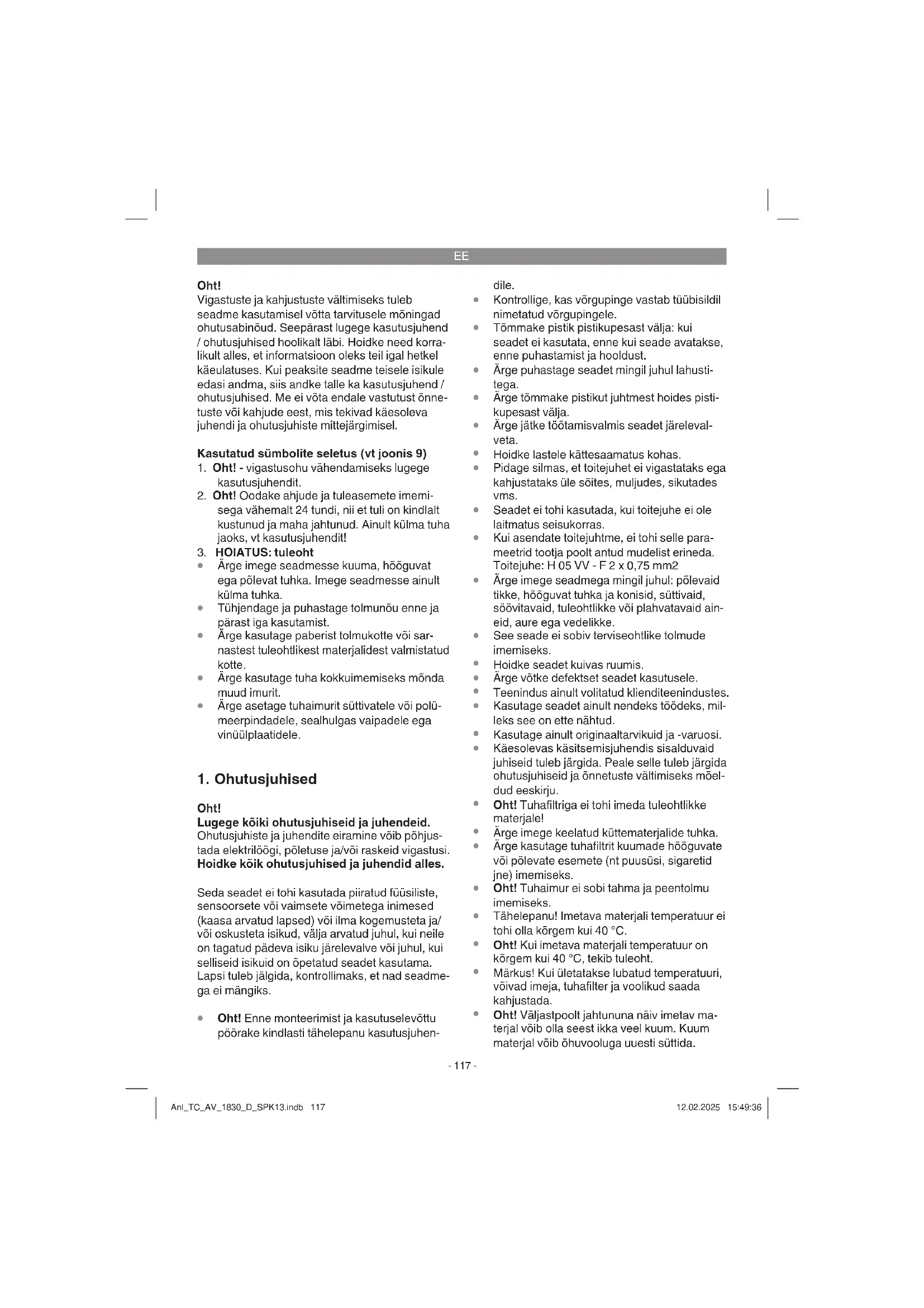 Oht! Väljastpoolt jahtununa näiv imetav ma- terjal võib olla seest ikka veel kuum. Kuum materjal võib õhuvooluga uuesti süttida. Anl_TC_AV_1830_D_SPK13.indb 117Anl_TC_AV_1830_D_SPK13.indb 117 12.02.2025 15:49:3612.02.2025 15:49:36EE