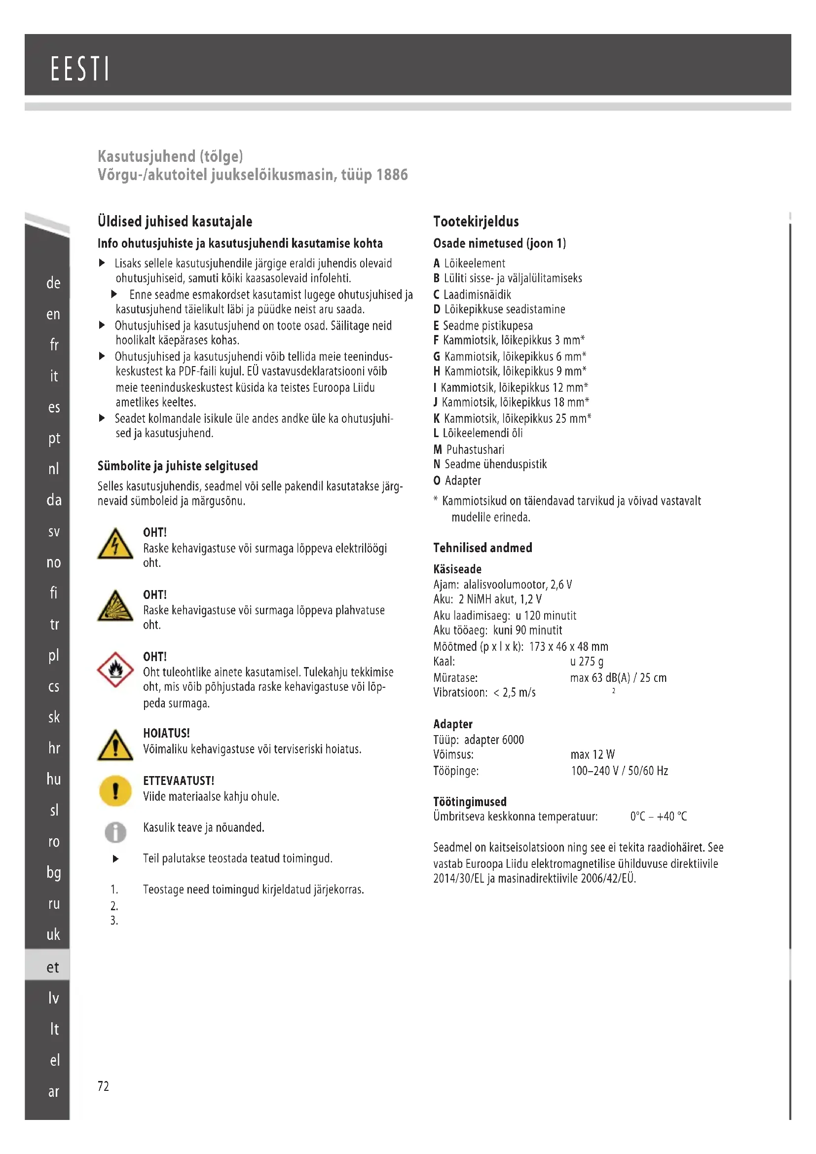 Kasutusjuhend (tõlge) Võrgu-/akutoitel juukselõikusmasin, tüüp 1886 Üldised juhised kasutajale Info ohutusjuhiste ja kasutusjuhendi kasutamise kohta f Lisaks sellele kasutusjuhendile järgige eraldi juhendis olevaid ohutusjuhiseid, samuti kõiki kaasasolevaid infolehti. f Enne seadme esmakordset kasutamist lugege ohutusjuhised ja kasutusjuhend täielikult läbi ja püüdke neist aru saada. f Ohutusjuhised ja kasutusjuhend on toote osad. Säilitage neid hoolikalt käepärases kohas. f Ohutusjuhised ja kasutusjuhendi võib tellida meie teenindus- keskustest ka PDF-faili kujul. EÜ vastavusdeklaratsiooni võib meie teeninduskeskustest küsida ka teistes Euroopa Liidu ametlikes keeltes. f Seadet kolmandale isikule üle andes andke üle ka ohutusjuhi- sed ja kasutusjuhend. Sümbolite ja juhiste selgitused Selles kasutusjuhendis, seadmel või selle pakendil kasutatakse järg- nevaid sümboleid ja märgusõnu. OHT! Raske kehavigastuse või surmaga lõppeva elektrilöögi oht. OHT! Raske kehavigastuse või surmaga lõppeva plahvatuse oht. OHT! Oht tuleohtlike ainete kasutamisel. Tulekahju tekkimise oht, mis võib põhjustada raske kehavigastuse või lõp- peda surmaga. HOIATUS! Võimaliku kehavigastuse või terviseriski hoiatus. ETTEVAATUST! Viide materiaalse kahju ohule. Kasulik teave ja nõuanded. Teil palutakse teostada teatud toimingud. Teostage need toimingud kirjeldatud järjekorras.