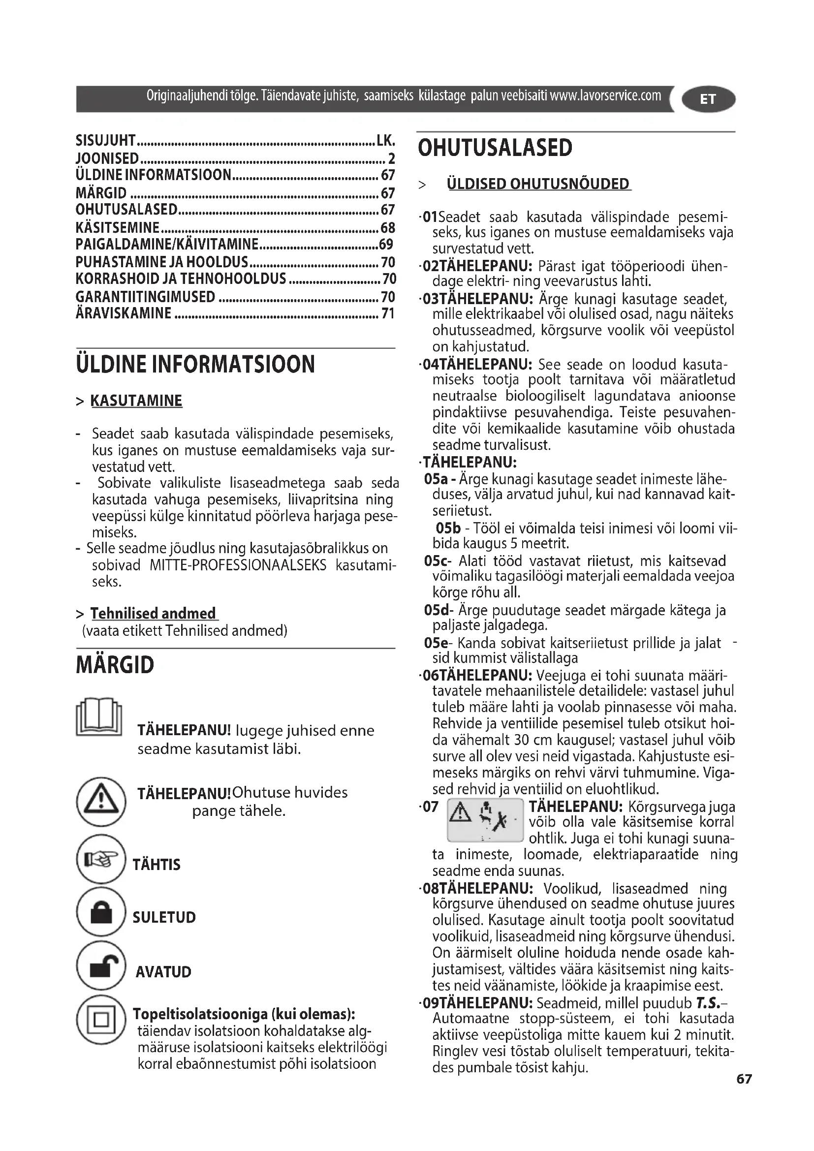 ÜLDINE INFORMATSIOON > KASUTAMINE - Seadet saab kasutada välispindade pesemiseks, kus iganes on mustuse eemaldamiseks vaja sur- vestatud vett. - Sobivate valikuliste lisaseadmetega saab seda kasutada vahuga pesemiseks, liivapritsina ning veepüssi külge kinnitatud pöörleva harjaga pese- miseks. - Selle seadme jõudlus ning kasutajasõbralikkus on sobivad MITTE-PROFESSIONAALSEKS kasutami- seks. > Tehnilised andmed (vaata etikett Tehnilised andmed) MÄRGID TÄHELEPANU! lugege juhised enne seadme kasutamist läbi. TÄHELEPANU! Ohutuse huvides pange tähele. TÄHTIS SULETUD AVATUD Topeltisolatsiooniga (kui olemas): täiendav isolatsioon kohaldatakse alg- määruse isolatsiooni kaitseks elektrilöögi korral ebaõnnestumist põhi isolatsioon OHUTUSALASED