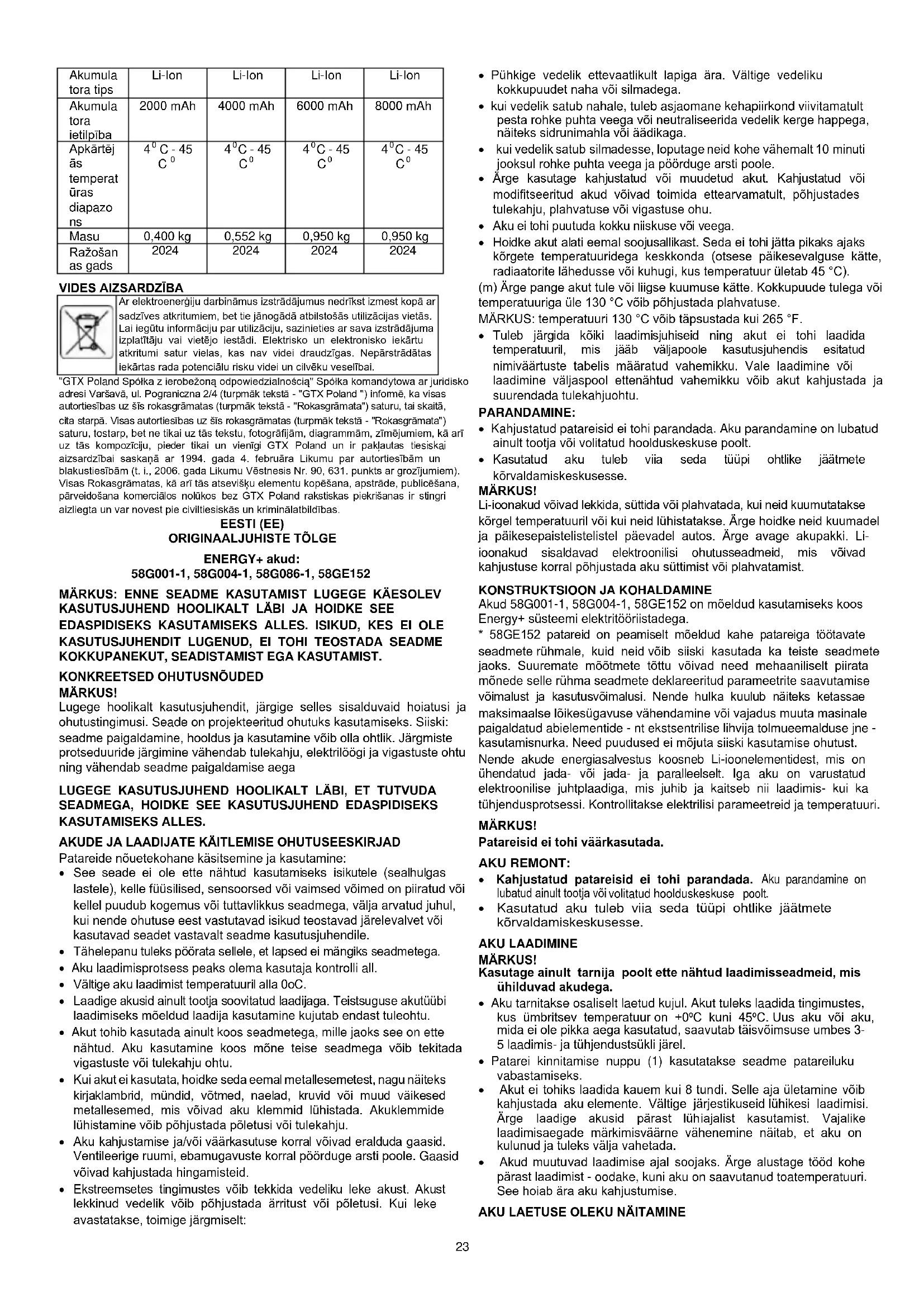 Elektritoitega tooteid ei tohiks hävitada koos olmejäätmetega, vaid need tuleks viia asjakohastesse jäätmekäitluskohtadesse. Teabe saamiseks kõrvaldamise kohta võtke ühendust oma toote edasimüüja või kohaliku omavalitsusega. Elektri- ja elektroonikaseadmete jäätmed sisaldavad aineid, mis ei ole keskkonnasõbralikud. Ringlusse võtmata seadmed kujutavad endast potentsiaalset ohtu keskkonnale ja inimeste tervisele. "GTX Poland Spółka z ograniczoną odpowiedzialnością" Spółka komandytowa, mille registrijärgne asukoht on Varssavi, ul. Pograniczna 2/4 (edaspidi "GTX Poland ") teatab, et kõik autoriõigused käesoleva käsiraamatu (edaspidi "käsiraamat") sisule, sealhulgas muu hulgas. Kõik autoriõigused käesoleva käsiraamatu (edaspidi "käsiraamat") sisule, sealhulgas, kuid mitte ainult, selle tekstile, fotodele, diagrammidele, joonistele ning selle koostisele, kuuluvad eranditult GTX Poland'ile ja on õiguskaitse all vastavalt 4. veebruari 1994. aasta seadusele autoriõiguse ja sellega seotud õiguste kohta (s.o. Teataja 2006 nr 90, punkt 631, muudetud kujul). Kogu käsiraamatu ja selle üksikute elementide kopeerimine, töötlemine, avaldamine ja muutmine ärilistel eesmärkidel ilma GTX Poland'i kirjaliku nõusolekuta on rangelt keelatud ning võib kaasa tuua tsiviil- ja kriminaalvastutuse. БЪЛГАРИЯ (BG) ПРЕВОД НА ОРИГИНАЛНИТЕ ИНСТРУКЦИИ Батерии ENERGY+: 58G001-1, 58G004-1, 58G086-1, 58GE152 ЗАБЕЛЕЖКА: ПРЕДИ ДА ИЗПОЛЗВАТЕ ОБОРУДВАНЕТО, ПРОЧЕТЕТЕ ВНИМАТЕЛНО ТОВА РЪКОВОДСТВО И ГО ЗАПАЗЕТЕ ЗА БЪДЕЩИ СПРАВКИ. ЛИЦА, КОИТО НЕ СА ПРОЧЕЛИ РЪКОВОДСТВОТО, НЕ ТРЯБВА ДА ИЗВЪРШВАТ МОНТАЖ, НАСТРОЙКА ИЛИ ЕКСПЛОАТАЦИЯ НА ОБОРУДВАНЕТО. СПЕЦИФИЧНИ РАЗПОРЕДБИ ЗА БЕЗОПАСНОСТ