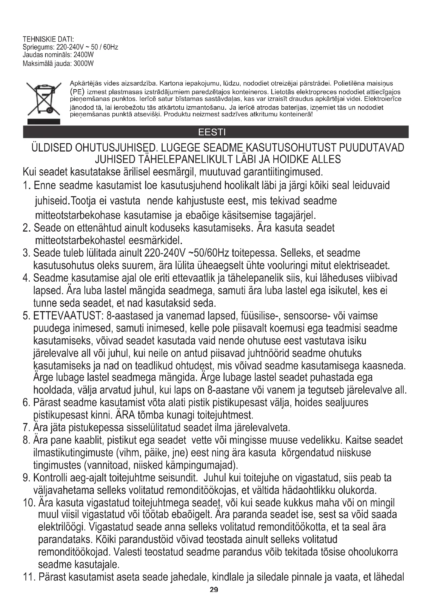 3. Seade tuleb lülitada ainult 220-240V ~50/60Hz toitepessa. Selleks, et seadme