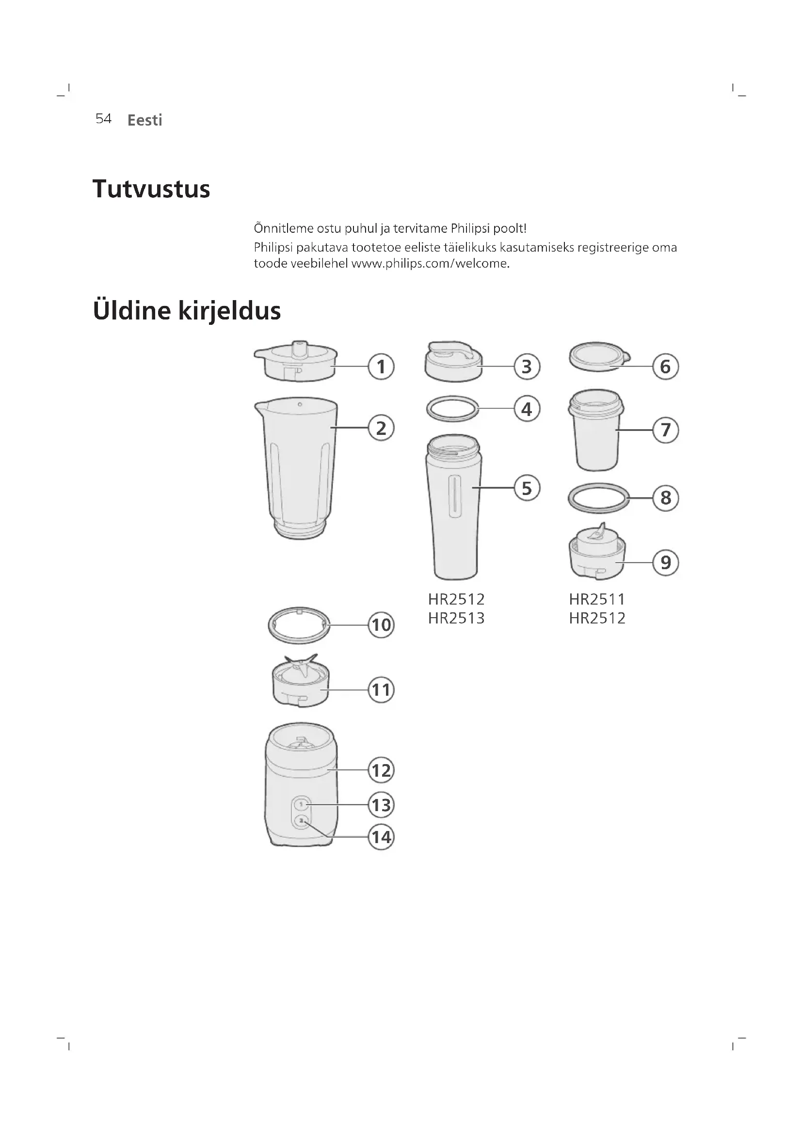 Peenestaja (ainult mudelitel HR2511/HR2512) 6 Blenderi kaas 7 Blenderi konteiner 8 Peenestaja rõngastihend 9 Peenestaja lõiketerad
