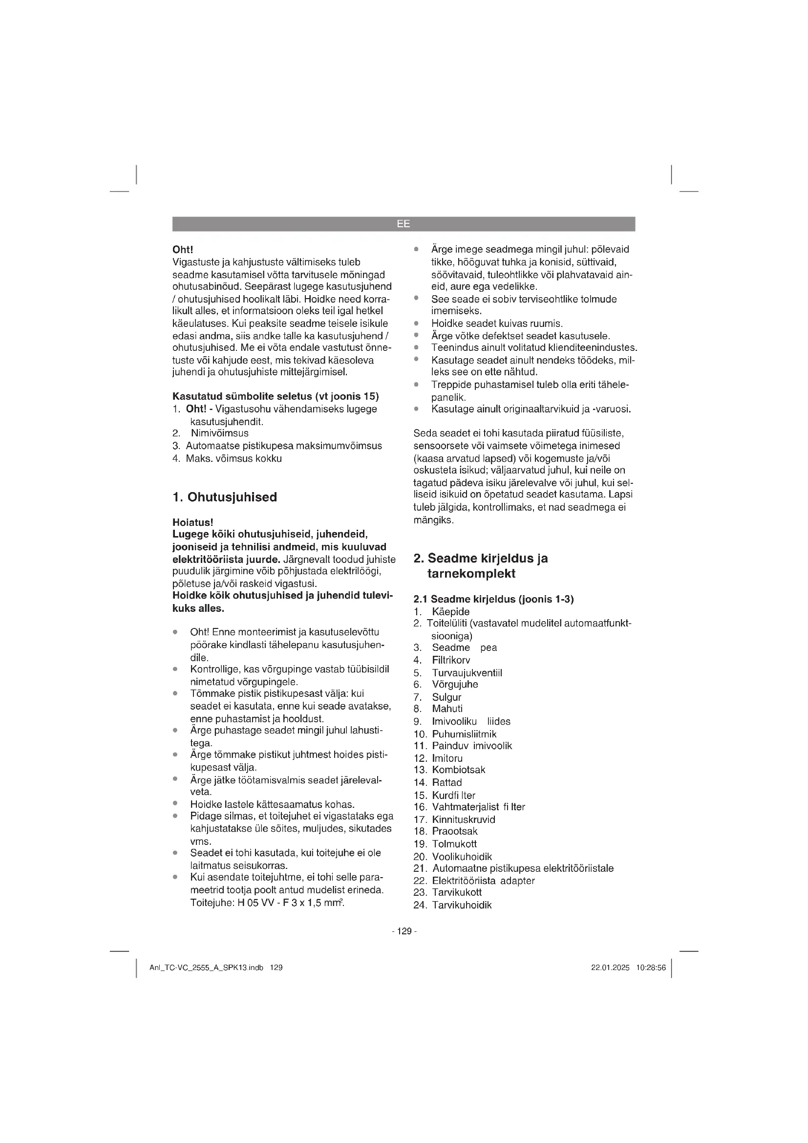 Oht! Kui käesoleva seadme toitejuhe on kahjustatud, tuleb see ohtude vältimiseks lasta tootjal või teda esindaval klienditeenindusel või sarnase kvalifi ka- tsiooniga isikul vahetada. Anl_TC-VC_2555_A_SPK13.indb 131Anl_TC-VC_2555_A_SPK13.indb 131 22.01.2025 10:28:5622.01.2025 10:28:56EE