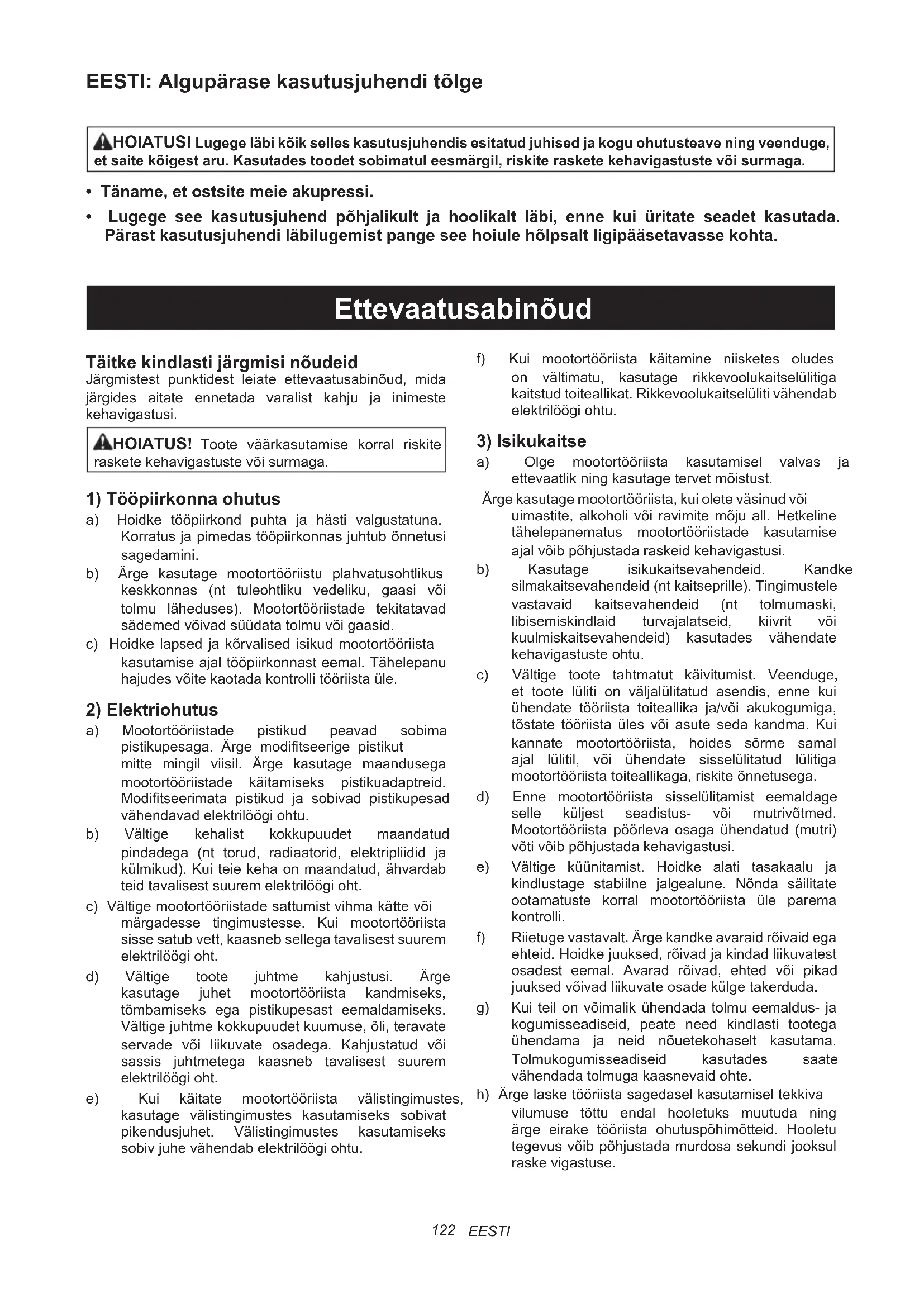a) Olge mootortööriista kasutamisel valvas ja ettevaatlik ning kasutage tervet mõistust. Ärge kasutage mootortööriista, kui olete väsinud või uimastite, alkoholi või ravimite mõju all. Hetkeline tähelepanematus mootortööriistade kasutamise ajal võib põhjustada raskeid kehavigastusi. b) Kasutage isikukaitsevahendeid. Kandke silmakaitsevahendeid (nt kaitseprille). Tingimustele vastavaid kaitsevahendeid (nt tolmumaski, libisemiskindlaid turvajalatseid, kiivrit või kuulmiskaitsevahendeid) kasutades vähendate kehavigastuste ohtu. c) Vältige toote tahtmatut käivitumist. Veenduge, et toote lüliti on väljalülitatud asendis, enne kui ühendate tööriista toiteallika ja/või akukogumiga, tõstate tööriista üles või asute seda kandma. Kui kannate mootortööriista, hoides sõrme samal ajal lülitil, või ühendate sisselülitatud lülitiga mootortööriista toiteallikaga, riskite õnnetusega. d) Enne mootortööriista sisselülitamist eemaldage selle küljest seadistus- või mutrivõtmed. Mootortööriista pöörleva osaga ühendatud (mutri) võti võib põhjustada kehavigastusi. e) Vältige küünitamist. Hoidke alati tasakaalu ja kindlustage stabiilne jalgealune. Nõnda säilitate ootamatuste korral mootortööriista üle parema kontrolli. f) Riietuge vastavalt. Ärge kandke avaraid rõivaid ega ehteid. Hoidke juuksed, rõivad ja kindad liikuvatest osadest eemal. Avarad rõivad, ehted või pikad juuksed võivad liikuvate osade külge takerduda. g) Kui teil on võimalik ühendada tolmu eemaldus- ja kogumisseadiseid, peate need kindlasti tootega ühendama ja neid nõuetekohaselt kasutama. Tolmukogumisseadiseid kasutades saate vähendada tolmuga kaasnevaid ohte. h) Ärge laske tööriista sagedasel kasutamisel tekkiva vilumuse tõttu endal hooletuks muutuda ning ärge eirake tööriista ohutuspõhimõtteid. Hooletu tegevus võib põhjustada murdosa sekundi jooksul raske vigastuse.123 EESTI