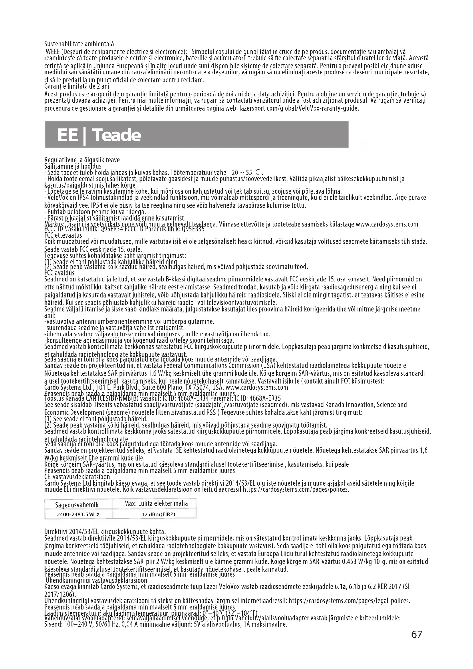 - Pärast pikaajalist säilitamist laadida enne kasutamist. Märkus: Disaini ja spetsifikatsioone võib muuta eelnevalt teadaega. Viimase ettevõtte ja tooteteabe saamiseks külastage www.cardosystems.com FCCC ID Vasakul ühik: Q95ER34 FCCC ID Paremik ühik: Q95ER35 FCC ettevaatus Kõik muudatused või muudatused, mille vastutav isik ei ole selgesõnaliselt heaks kiitnud, võiksid kasutaja volitused seadmete käitamiseks tühistada. Seade vastab FCC eeskirjade 15. osale. Tegevuse suhtes kohaldatakse kaht järgmist tingimust: (1) Seade ei tohi põhjustada kahjulikke häireid ning (2) Seade peab vastama kõik saadud häired, sealhulgas häired, mis võivad põhjustada soovimatu tööd. FCC avaldus Seadmed on katsetatud ja leitud, et see vastab B-klassi digitaalseadme piirnormidele vastavalt FCC eeskirjade 15. osa kohaselt. Need piirnormid on ette nähtud mõistlikku kaitset kahjulike häirete eest elamistasse. Seadmed toodab, kasutab ja võib kiirgata raadiosagedusenergia ning kui see ei paigaldatud ja kasutada vastavalt juhistele, võib põhjustada kahjulikku häireid raadiosidele. Siiski ei ole mingit tagatist, et teatavas käitises ei esine häireid. Kui see seadis põhjustab kahjulikku häireid raadio- või televisioonivastuvõtmisele, Seadme väljalülitamise ja sisse saab kindlaks määrata, julgustatakse kasutajat üles proovima häireid korrigeerida ühe või mitme järgmise meetme abil: -vastuvõtva antenni ümberorienteerimine või ümberpaigutamine. -suurendada seadme ja vastuvõtja vahelist eraldamist. -ühendada seadme väljavahetusse erineval ringlusest, millele vastuvõtja on ühendatud. -konsulteerige abi edasimüüja või kogenud raadio/televisiooni tehnikaga. Seadmed vastab kontrollimata keskkonnas sätestatud FCC kiirguskokkupuute piirnormidele. Lõppkasutaja peab järgima konkreetseid kasutusjuhiseid, et rahuldada radiotehnoloogiate kokkupuute vastavust. Seda saadija ei tohi olla koos paigutatud ega töötada koos muude antennide või saadijaga. Sandav seade on projekteeritud nii, et vastata Federal Communications Commission (USA) kehtestatud raadiolainetega kokkupuute nõuetele. Nõuetega kehtestatakse SAR piirväärtus 1,6 W/kg keskmiselt ühe grammi kude üle. Kõige kõrgeim SAR-väärtus, mis on esitatud käesoleva standardi alusel tootekertifitseerimisel, kasutamiseks, kui peale nõuetekohaselt kannatakse. Vastavalt isikule (kontakt ainult FCC küsimustes): Cardo Systems Ltd., 101 E. Park Blvd., Suite 600 Plano, TX 75074, USA. www.cardosystems.com Peasendis peab saadaja paigaldama minimaalselt 5 mm eraldamise juures Tööstus Kanada CAN ICES(B)/NMB(B) vasakul: IC ID: 4668A-ER34 Paremal: IC ID: 4668A-ER35 See seade sisaldab litsentsivabastatud saadij/vastuvõtjate (saadajate)/vastuvõtjate (seadmed), mis vastavad Kanada Innovation, Science and Economic Development (seadme) nõuetele litsentsivabastatud RSS ( Tegevuse suhtes kohaldatakse kaht järgmist tingimust: (1) See seade ei tohi põhjustada häireid. (2) Seade peab vastama kõiki häireid, sealhulgas häireid, mis võivad põhjustada seadme soovimatu töötamist. Seadmed vastab kontrollimata keskkonna jaoks sätestatud kiirguskokkupuute piirnormidele. Lõppkasutaja peab järgima konkreetseid kasutusjuhiseid, et rahuldada radiotehnoloogiate Seda saadija ei tohi olla koos paigutatud ega töötada koos muude antennide või saadijaga. Sandav seade on projekteeritud selleks, et vastata ISE kehtestatud raadiolainetega kokkupuute nõuetele. Nõuetega kehtestatakse SAR piirväärtus 1,6 W/kg keskmiselt ühe grammi kude üle. Kõige kõrgeim SAR-väärtus, mis on esitatud käesoleva standardi alusel tootekertifitseerimisel, kasutamiseks, kui peale Peasendis peab saadaja paigaldama minimaalselt 5 mm eraldamise juures CE-vastavusdeklaratsioon Cardo Systems Ltd kinnitab käesolevaga, et see toode vastab direktiivi 2014/53/EL oluliste nõuetele ja muude asjakohaseid sätetele ning kõigile muude ELi direktiivi nõuetele. Kõik vastavusdeklaratsioon on leitud aadressil https://cardosystems.com/pages/polices. Direktiivi 2014/53/EL kiirguskokkupuute kohta: Seadmed vastab direktiivile 2014/53/EL kiirguskokkupuute piirnormidele, mis on sätestatud kontrollimata keskkonna jaoks. Lõppkasutaja peab järgima konkreetseid tööjuhiseid, et rahuldada radiotehnoloogiate kokkupuute vastavust. Seda saadija ei tohi olla koos paigutatud ega töötada koos muude antennide või saadijaga. Sandav seade on projekteeritud selleks, et vastata Euroopa Liidu turul kehtestatud raadiolainetega kokkupuute nõuetele. Nõuetega kehtestatakse SAR-piir 2 W/kg keskmiselt üle kümne grammi kude. Kõige kõrgeim SAR-väärtus 0,453 W/kg 10-g, mis on esitatud käesoleva standardi alusel tootekertifitseerimisel, et kasutada nõuetekohaselt peale kannatud. Peasendis peab saadaja paigaldama minimaalselt 5 mm eraldamise juures Ühendkuningriigi vastavusdeklarasioon Käesolevaga kinnitab Cardo Systems, et raadioseadmete tüüp Lazer VeloVox vastab raadioseadmete eeskirjadele 6.1a, 6.1b ja 6.2 RER 2017 (SI 2017/1206). Ühendkuningriigi vastavusdeklaratsiooni täistekst on kättesaadav järgmisel internetiaadressil: https://cardosystems.com/pages/legal-polices. Peasendis peab saadaja paigaldama minimaalselt 5 mm eraldamise juures. Laadimistemperatuur: aku laadimistemperatuuri piirmäärad: 0°–40°C (32°–104°F) Vahelduv/alalisvooluadapterid: seinaväljallaadimisel veenduge, et plugin Vahelduv/alalisvooluadapter vastab järgmistele kriteeriumidele: Sisend: 100–240 V, 50/60 Hz, 0,04 A minimaalne väljund: 5V alalisvoolualus, 1A maksimaalne. EE | Teade 67Laadimine