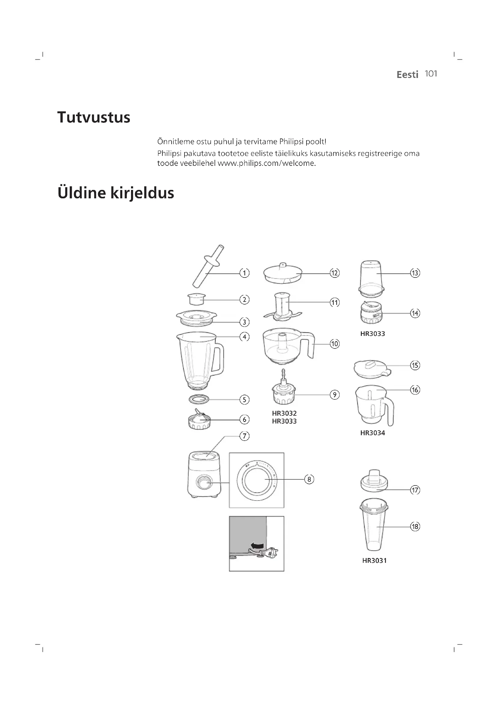 Eesti Eesti Tutvustus Õnnitleme ostu puhul ja tervitame Philipsi poolt! Philipsi pakutava tootetoe eeliste täielikuks kasutamiseks registreerige oma toode veebilehel www.philips.com/welcome. Üldine kirjeldus HR3034HR3031 HR3033HR3032 HR3033