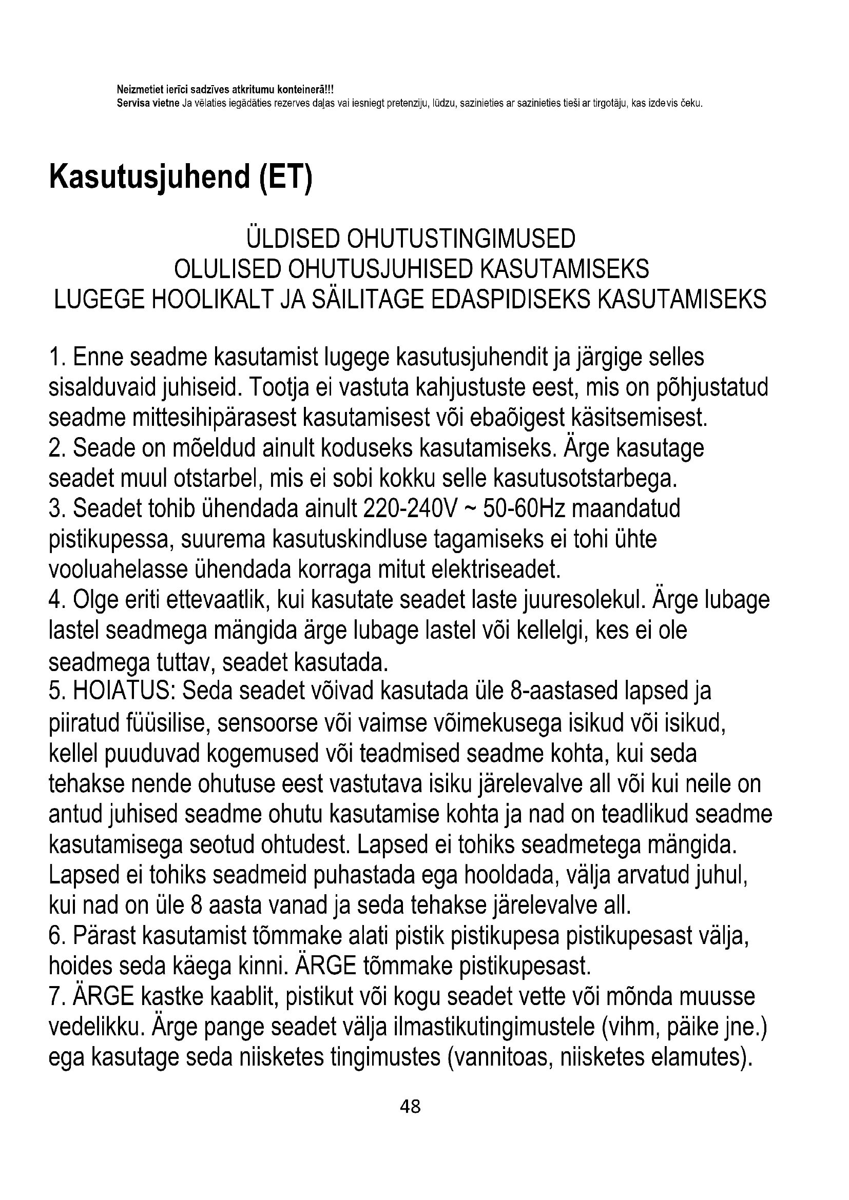 piiratud füüsilise, sensoorse või vaimse võimekusega isikud või isikud, kellel puuduvad kogemused või teadmised seadme kohta, kui seda tehakse nende ohutuse eest vastutava isiku järelevalve all või kui neile on antud juhised seadme ohutu kasutamise kohta ja nad on teadlikud seadme kasutamisega seotud ohtudest. Lapsed ei tohiks seadmetega mängida. Lapsed ei tohiks seadmeid puhastada ega hooldada, välja arvatud juhul, kui nad on üle 8 aasta vanad ja seda tehakse järelevalve all.
