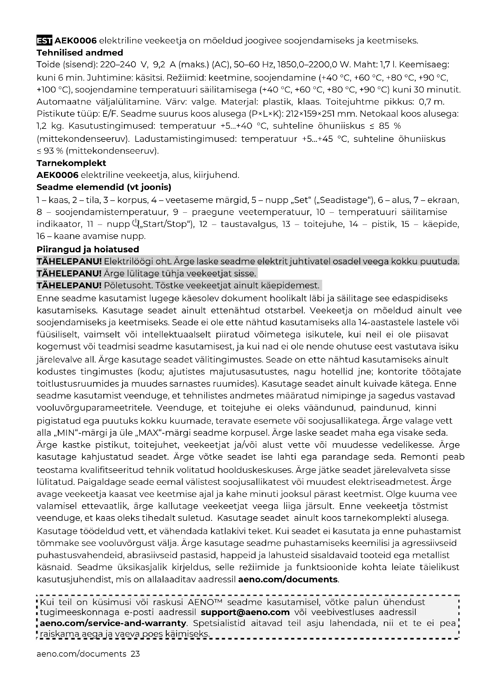Η ASBISC διατηρεί το δικαίωμα να τροποποιήσει τη συσκευή και να κάνει αλλαγές και προσθήκες σε αυτό το έγγραφο χωρίς προηγούμενη ειδοποίηση των χρηστών. Αυτή η συσκευή συμμορφώνεται με τις ισχύουσες απαιτήσεις ασφαλείας. Η περίοδος εγγύησης και η διάρκεια ζωής είναι 2 έτη από την ημερομηνία λιανικής πώλησης του προϊόντος. Πληροφορίες κατασκευαστή: ASBISC Enterprises PLC, Iapetou, 1, Agios Athanasios, 4101, Limassol, Cyprus (Κύπρος). Τηλ.: +48732080077, ηλ. ταχυδρομείο: info@asbis.com, asbis.com. Κατασκευασμένο στην Κίνα. Δείτε τη συσκευασία για την ημερομηνία κατασκευής. Όλα τα εμπορικά σήματα και οι εμπορικές μάρκες που αναφέρονται στο παρόν έγγραφο αποτελούν ιδιοκτησία των αντίστοιχων κατόχων τους. Επικαιροποιημένες πληροφορίες και λεπτομερείς περιγραφές των συσκευών, καθώς και οδηγίες σύνδεσης, πιστοποιητικά, πληροφορίες για εταιρείες που δέχονται αξιώσεις ποιότητας και εγγυήσεις, είναι διαθέσιμες για λήψη στη διεύθυνση aeno.com/documents. Οδηγία RoHS. Η συσκευή συμμορφώνεται με την Οδηγία RoHS 2011/65/EU περιορισμό της χρήσης ορισμένων επικίνδυνων ουσιών, συμπεριλαμβανομένων των διατάξεων της Οδηγίας RoHS 2015/863/EU.aeno.com/documents 23 EST AEK0006 elektriline veekeetja on mõeldud joogivee soojendamiseks ja keetmiseks. Tehnilised andmed Toide (sisend): 220–240 V, 9,2 A (maks.) (AC), 50–60 Hz, 1850,0–2200,0 W. Maht: 1,7 l. Keemisaeg: kuni 6 min. Juhtimine: käsitsi. Režiimid: keetmine, soojendamine (+40 °C, +60 °C, +80 °C, +90 °C, +100 °C), soojendamine temperatuuri säilitamisega (+40 °C, +60 °C, +80 °C, +90 °C) kuni 30 minutit. Automaatne väljalülitamine. Värv: valge. Materjal: plastik, klaas. Toitejuhtme pikkus: 0,7 m. Pistikute tüüp: E/F. Seadme suurus koos alusega (P×L×K): 212×159×251 mm. Netokaal koos alusega: 1,2 kg. Kasutustingimused: temperatuur +5…+40 °C, suhteline õhuniiskus ≤ 85 % (mittekondenseeruv). Ladustamistingimused: temperatuur +5…+45 °C, suhteline õhuniiskus ≤ 93 % (mittekondenseeruv). Tarnekomplekt AEK0006 elektriline veekeetja, alus, kiirjuhend. Seadme elemendid (vt joonis) 1 – kaas, 2 – tila, 3 – korpus, 4 – veetaseme märgid, 5 – nupp „Set“ („Seadistage“), 6 – alus, 7 – ekraan, 8 – soojendamistemperatuur, 9 – praegune veetemperatuur, 10 – temperatuuri säilitamise indikaator, 11 – nupp („Start/Stop“), 12 – taustavalgus, 13 – toitejuhe, 14 – pistik, 15 – käepide, 16 – kaane avamise nupp. Piirangud ja hoiatused TÄHELEPANU! Elektrilöögi oht. Ärge laske seadme elektrit juhtivatel osadel veega kokku puutuda. TÄHELEPANU! Ärge lülitage tühja veekeetjat sisse. TÄHELEPANU! Põletusoht. Tõstke veekeetjat ainult käepidemest. Enne seadme kasutamist lugege käesolev dokument hoolikalt läbi ja säilitage see edaspidiseks kasutamiseks. Kasutage seadet ainult ettenähtud otstarbel. Veekeetja on mõeldud ainult vee soojendamiseks ja keetmiseks. Seade ei ole ette nähtud kasutamiseks alla 14-aastastele lastele või füüsiliselt, vaimselt või intellektuaalselt piiratud võimetega isikutele, kui neil ei ole piisavat kogemust või teadmisi seadme kasutamisest, ja kui nad ei ole nende ohutuse eest vastutava isiku järelevalve all. Ärge kasutage seadet välitingimustes. Seade on ette nähtud kasutamiseks ainult kodustes tingimustes (kodu; ajutistes majutusasutustes, nagu hotellid jne; kontorite töötajate toitlustusruumides ja muudes sarnastes ruumides). Kasutage seadet ainult kuivade kätega. Enne seadme kasutamist veenduge, et tehnilistes andmetes määratud nimipinge ja sagedus vastavad vooluvõrguparameetritele. Veenduge, et toitejuhe ei oleks väändunud, paindunud, kinni pigistatud ega puutuks kokku kuumade, teravate esemete või soojusallikatega. Ärge valage vett alla „MIN“-märgi ja üle „MAX“-märgi seadme korpusel. Ärge laske seadet maha ega visake seda. Ärge kastke pistikut, toitejuhet, veekeetjat ja/või alust vette või muudesse vedelikesse. Ärge kasutage kahjustatud seadet. Ärge võtke seadet ise lahti ega parandage seda. Remonti peab teostama kvalifitseeritud tehnik volitatud hoolduskeskuses. Ärge jätke seadet järelevalveta sisse lülitatud. Paigaldage seade eemal välistest soojusallikatest või muudest elektriseadmetest. Ärge avage veekeetja kaasat vee keetmise ajal ja kahe minuti jooksul pärast keetmist. Olge kuuma vee valamisel ettevaatlik, ärge kallutage veekeetjat veega liiga järsult. Enne veekeetja tõstmist veenduge, et kaas oleks tihedalt suletud. Kasutage seadet ainult koos tarnekomplekti alusega. Kasutage töödeldud vett, et vähendada katlakivi teket. Kui seadet ei kasutata ja enne puhastamist tõmmake see vooluvõrgust välja. Ärge kasutage seadme puhastamiseks keemilisi ja agressiivseid puhastusvahendeid, abrasiivseid pastasid, happeid ja lahusteid sisaldavaid tooteid ega metallist käsnaid. Seadme üksikasjalik kirjeldus, selle režiimide ja funktsioonide kohta leiate täielikust kasutusjuhendist, mis on allalaaditav aadressil aeno.com/documents. Kui teil on küsimusi või raskusi AENO™ seadme kasutamisel, võtke palun ühendust tugimeeskonnaga e-posti aadressil support@aeno.com või veebivestluses aadressil aeno.com/service-and-warranty. Sp