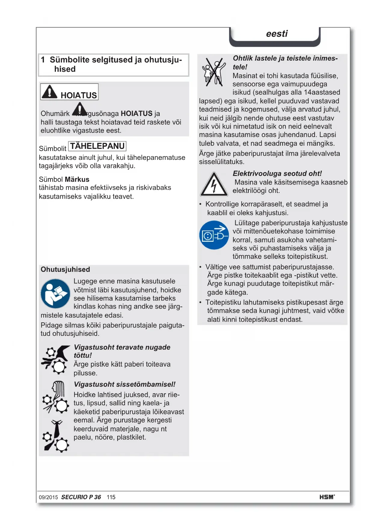 - Max. počet listov (DIN A4, 70 g/m², príp. 80 g/m²), po dĺžke privádzaných, ktoré sa rozrežú pri jednom prechode. Stanovenie uvedených údajov o výkone sa uskutočňuje s novým, naolejovaným rezacím mechanizmom a studeným motorom. Slabšie sieťové napätie alebo iná sieťová frekvencia ako je uvedená môže viesť k nižšiemu výkonu a zvýše- nej hlučnosti. Podľa štruktúry a vlastností papiera a druhu spôsobu uloženia môže byť výkon odlišný.09/2015 SECURIO P 36 115 eesti 1 Sümbolite selgitused ja ohutusju- hised Sümbol Märkus tähistab masina efektiivseks ja riskivabaks kasutamiseks vajalikku teavet. HOIATUS Ohumärk märgusõnaga HOIATUS ja halli taustaga tekst hoiatavad teid raskete või eluohtlike vigastuste eest. Ohutusjuhised Lugege enne masina kasutusele võtmist läbi kasutusjuhend, hoidke see hilisema kasutamise tarbeks kindlas kohas ning andke see järg- mistele kasutajatele edasi. Pidage silmas kõiki paberipurustajale paiguta- tud ohutusjuhiseid. Vigastusoht teravate nugade tõttu! Ärge pistke kätt paberi toiteava pilusse. Vigastusoht sissetõmbamisel! Hoidke lahtised juuksed, avar riie- tus, lipsud, sallid ning kaela- ja käeketid paberipurustaja lõikeavast eemal. Ärge purustage kergesti keerduvaid materjale, nagu nt paelu, nööre, plastkilet. Ohtlik lastele ja teistele inimes- tele! Masinat ei tohi kasutada füüsilise, sensoorse ega vaimupuudega isikud (sealhulgas alla 14aastased lapsed) ega isikud, kellel puuduvad vastavad teadmised ja kogemused, välja arvatud juhul, kui neid jälgib nende ohutuse eest vastutav isik või kui nimetatud isik on neid eelnevalt masina kasutamise osas juhendanud. Lapsi tuleb valvata, et nad seadmega ei mängiks. Ärge jätke paberipurustajat ilma järelevalveta sisselülitatuks. Elektrivooluga seotud oht! Masina vale käsitsemisega kaasneb elektrilöögi oht.