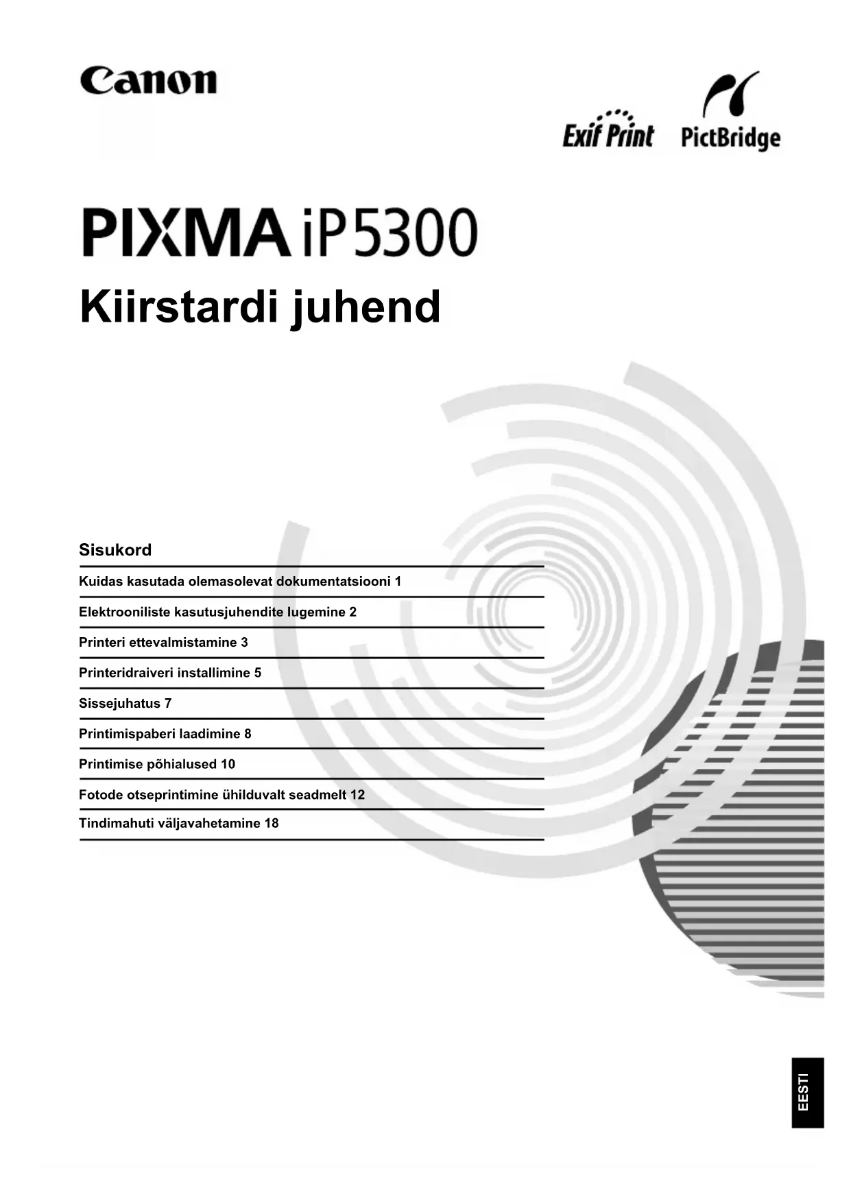 on rahvusvaheline programm, mille abil toetatakse energiasäästlike arvutite ja muu kontoritehnika tootmist. Programm toetab energiakulu tõhusalt vähendavate funktsioonidega seadmete väljatöötamist ja kasutuselevõttu. Tegemist on avatud süsteemiga, milles osalemine on ettevõtetele vabatahtlik. Sihttooted on kontoriseadmed (nt arvutid, kuvarid, printerid, faksid ja paljundusmasinad). Standardid ja logod on kõigis osalevates riikides ühesugused. Toitenõuded Ärge kunagi kasutage toiteallikat, mille pinge erineb seadme osturiigis kasutatavast pingest. Vale pinge võib põhjustada tulekahju või elektrilöögi ohu. Toiteallika õige pinge ja sagedus on järgmised: Vahelduvvool 100–240 V, 50/60 Hz Lisatarvikute teave Lisatarvikud (tindimahutid / FINE-kassetid (FINE Cartridges)) on saadaval viis aastat pärast tootmise lõpetamist. Ohutusnõuded Mudeli number: K10285 (iP5300) Hoiatus z Ärge kunagi proovige toitejuhet vooluvõrku ühendada või vooluvõrgust eemaldada märgade kätega! z Ärge toitejuhet kahjustage, muutke, venitage, liigselt painutage ega keerake! Ärge asetage toitejuhtmele raskeid esemeid. z Ärge kasutage osturiigis saadaolevatest standardsetest toiteplokkidest erinevat toiteallikat! Vale pinge ja sagedusega toite kasutamine võib põhjustada tulekahju või elektrilöögi ohu.z Lükake pistik vooluvõrgu pistikupessa alati lõpuni. Ettevaatust! z Ohutuse huvides säilitage tindimahuteid väikelaste käeulatusest eemal. z Ärge pillake tindimahuteid maha ega raputage neid, kuna nii võib tint lekkida ja teie riideid või käsi määrida. Lugege ka ohutusnõudeid [User's Guide/Kasutusjuhendi] elektroonilisest juhendist. Kehavigastuste või printeri kahjustamise vältimiseks järgige ettevaatusabinõusid ja hoiatusi.1Kuidas kasutada olemasolevat dokumentatsiooni EESTI Kuidas kasutada olemasolevat dokumentatsiooni Lihtsad paigaldusjuhised (häälestusdokumentatsioon) Lugege esmalt kindlasti seda dokumenti. Käesolevas dokumendis on toodud juhised printeri üles- ja kasutusvalmis seadmiseks. Kiirstardi juhend (see juhend) Lugege seda juhendit printeri kasutamise alustamisel. Pärast juhendis Lihtsad paigaldusjuhised (häälestusdokumentatsioon) toodud juhiste järgimist soovitame seda juhenit lugeda, et end kurssi viia põhifunktsioonidega, nagu nt arvutist ja PictBridge-ühilduvast seadmest printimine. Elektroonilised kasutusjuhendid [User’s Guide/Kasutusjuhend] Lugege seda juhendit printeri kasutamise alustamisel. Kui te ei leia Kiirstardi juhendist piisavalt teavet, siis tutvuge juhendiga [User’s Guide/Kasutusjuhend], mida on võimalik installida plaadilt [Setup CD-ROM/Installimislaserplaat]. Käesolevas juhendis on toodud üksikasjalikud juhised: z arvutist printimise kohta z ühilduvate kandjatüüpide kohta z regulaarse hoolduse kohta z tõrkeotsingu kohta Lisafunktsioonide kohta on saadaval lisajuhendid. [Printer Driver Guide/Printeridraiveri juhend] Tutvuge selle juhendiga printeridraiveri seade kohta täielike juhiste saamiseks. [Photo Application Guide/Fotorakenduse juhend] Tutvuge selle juhendiga, et plaadil [Setup CD-ROM/Installimislaserplaat] toodud erinevaid rakendustarkvarade kasutamise kohta juhiseid saada.2 Elektrooniliste kasutusjuhendite lugemine EESTI Elektrooniliste kasutusjuhendite lugemine Printeriga tarnitakse koos käesoleva Kiirstardi juhendiga ka elektroonilised juhendid. Elektrooniliste juhendite installeerimise üksikasjadeks tutvuge juhendiga Lihtsad paigaldusjuhised (häälestusdokumentatsioon). Elektroonilisi juhendeid on võimalik näha järgneval viisil: Elektroonilise juhendi nägemiseks tehke topeltklõps töölaual [iP5300 On-screen Manual/ iP5300 elektrooniline juhend] otsetee ikoonil või klõpsake [Start/Käivita] > [All Programs/Kõik programmid] (või [Programs/Programmid]) > [Canon iP5300 Manual/Canon iP4300 juhend] > [iP5300 On-screen Manual/iP5300 elektrooniline juhend]. Nõuded süsteemile Brauser: Windowsi spikrivaatur HTML Help Viewer Elektroonilise kasutusjuhendi kuvamiseks topeltklõpsake töölaual ikooni [iP5300 On-screen Manual/iP5300 elektrooniline juhend]. Nõuded süsteemile Brauser: spikrivaatur Help Viewer Märkus. z Nõuab brauserit Microsoft Internet Explorer
