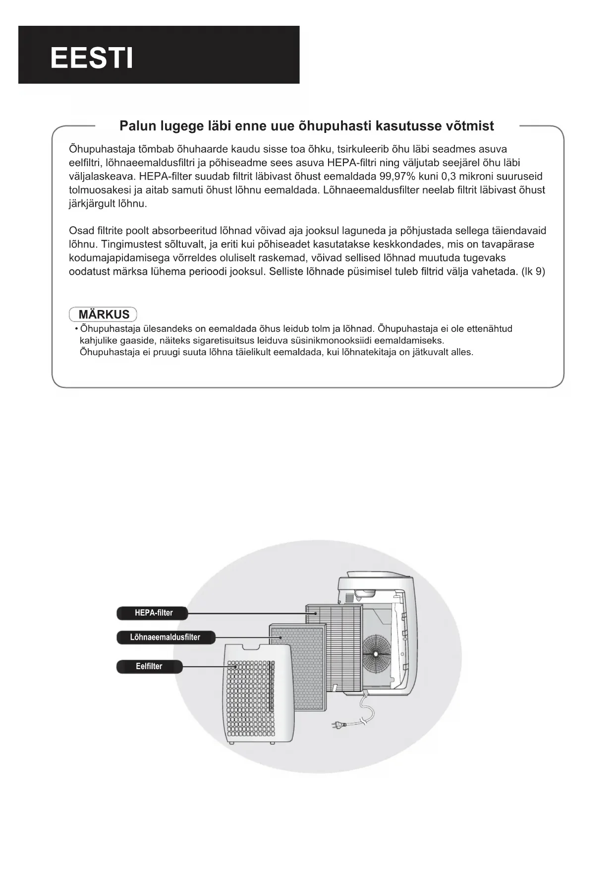 Pre-FilterHEPA FilterDeodorizing Filter Õhupuhastaja tõmbab õhuhaarde kaudu sisse toa õhku, tsirkuleerib õhu läbi seadmes asuva eelltri, lõhnaeemaldusltri ja põhiseadme sees asuva HEPA-ltri ning väljutab seejärel õhu läbi väljalaskeava. HEPA-lter suudab ltrit läbivast õhust eemaldada 99,97% kuni 0,3 mikroni suuruseid tolmuosakesi ja aitab samuti õhust lõhnu eemaldada. Lõhnaeemalduslter neelab ltrit läbivast õhust järkjärgult lõhnu. Osad ltrite poolt absorbeeritud lõhnad võivad aja jooksul laguneda ja põhjustada sellega täiendavaid lõhnu. Tingimustest sõltuvalt, ja eriti kui põhiseadet kasutatakse keskkondades, mis on tavapärase kodumajapidamisega võrreldes oluliselt raskemad, võivad sellised lõhnad muutuda tugevaks oodatust märksa lühema perioodi jooksul. Selliste lõhnade püsimisel tuleb ltrid välja vahetada. (lk 9) MÄRKUS