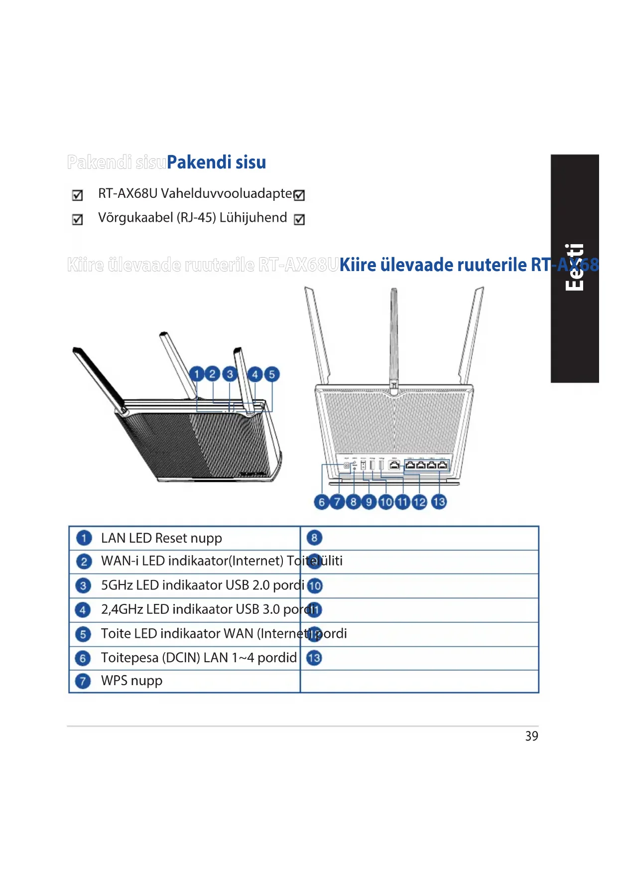 Volg de installatierichtlijnen van de ASUS Router-app voor het voltooien van de instelling. ASUS Router ASUS Router39 Eesti Kiire ülevaade ruuterile RT-AX68UKiire ülevaade ruuterile RT-AX68U Pakendi sisuPakendi sisu RT-AX68U Vahelduvvooluadapter Võrgukaabel (RJ-45) Lühijuhend Eesti LAN LED Reset nupp WAN-i LED indikaator(Internet) Toitelüliti 5GHz LED indikaator USB 2.0 pordi 2,4GHz LED indikaator USB 3.0 pordi Toite LED indikaator WAN (Internet) pordi Toitepesa (DCIN) LAN 1~4 pordid WPS nupp40 Eesti Traadita ruuteri paigutamineTraadita ruuteri paigutamine Traadita signaali parimaks edastuseks traadita ruuteri ja sellega ühendatud võrguseadmete vahel tehke järgmist: