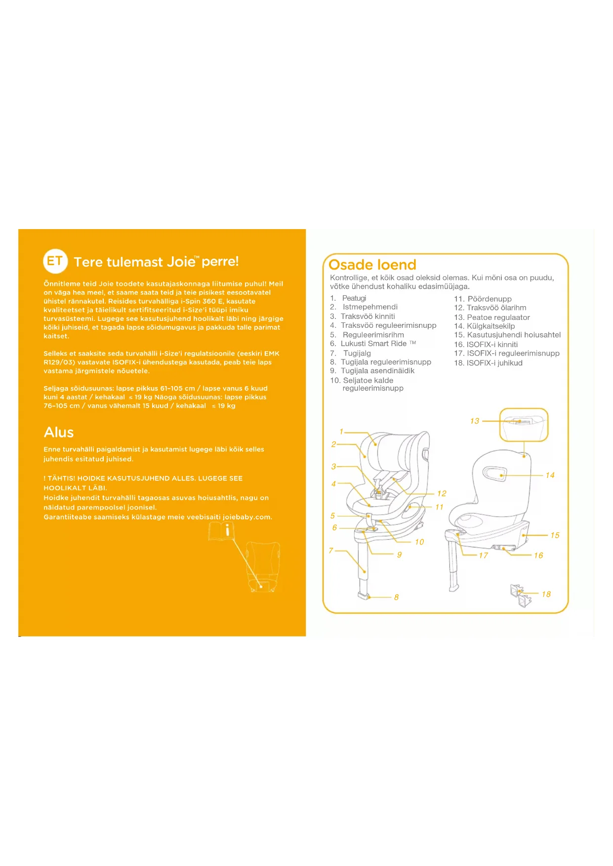 perre! Õnnitleme teid Joie toodete kasutajaskonnaga liitumise puhul! Meil on väga hea meel, et saame saata teid ja teie pisikest eesootavatel ühistel rännakutel. Reisides turvahälliga i-Spin 360 E, kasutate kvaliteetset ja täielikult sertifitseeritud i-Size’i tüüpi imiku turvasüsteemi. Lugege see kasutusjuhend hoolikalt läbi ning järgige kõiki juhiseid, et tagada lapse sõidumugavus ja pakkuda talle parimat kaitset.Selleks et saaksite seda turvahälli i-Size’i regulatsioonile (eeskiri EMK R129/03) vastavate ISOFIX-i ühendustega kasutada, peab teie laps vastama järgmistele nõuetele.Seljaga sõidusuunas: lapse pikkus 61–105 cm / lapse vanus 6 kuud kuni 4 aastat / kehakaal 19 kg Näoga sõidusuunas: lapse pikkus 76–105 cm / vanus vähemalt 15 kuud / kehakaal 19 kg Alus Enne turvahälli paigaldamist ja kasutamist lugege läbi kõik selles juhendis esitatud juhised.! TÄHTIS! HOIDKE KASUTUSJUHEND ALLES. LUGEGE SEE HOOLIKALT LÄBI.Hoidke juhendit turvahälli tagaosas asuvas hoiusahtlis, nagu on näidatud parempoolsel joonisel.Garantiiteabe saamiseks külastage meie veebisaiti joiebaby.com. Osade loend