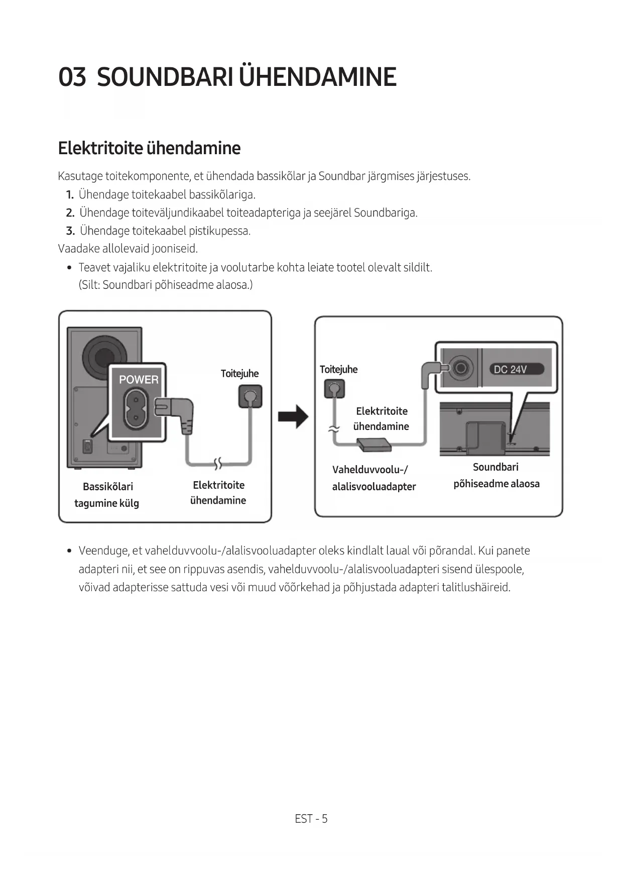 - Veenduge, et vahelduvvoolu-/alalisvooluadapter oleks kindlalt laual või põrandal. Kui panete adapteri nii, et see on rippuvas asendis, vahelduvvoolu-/alalisvooluadapteri sisend ülespoole, võivad adapterisse sattuda vesi või muud võõrkehad ja põhjustada adapteri talitlushäireid.EST - 6 Soundbari ühendamine bassikõlariga Kui bassikõlar on ühendatud, saate nautida rikkalikku bassiheli. Bassikõlari ja Soundbari automaatne ühendamine Kui lülitate pärast Soundbari ja bassikõlari toitekaablite ühendamist toite sisse, ühendatakse bassikõlar automaatselt Soundbariga.