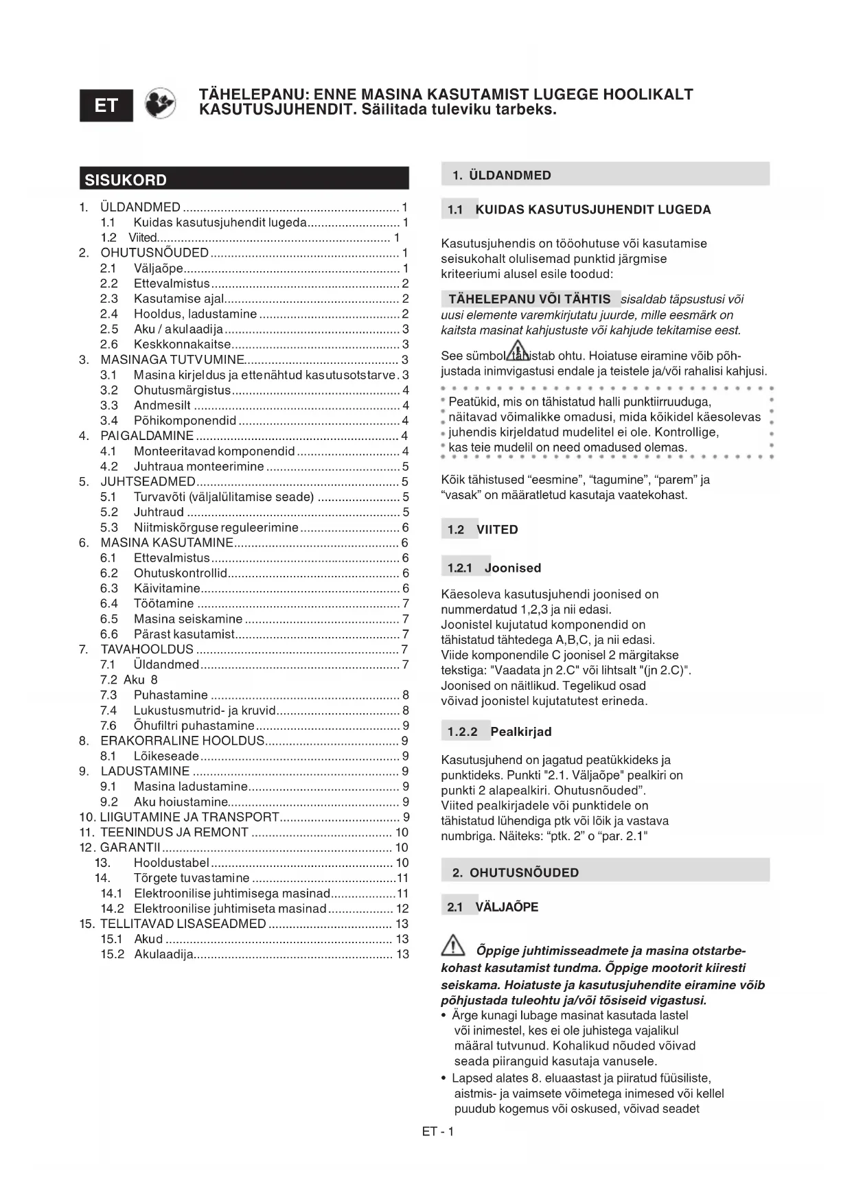 TÄHTIS Järgmised ohutusnõuded lisanduvad masinaga tarnitud aku ja akulaadija juhise ohutusnõuetele.