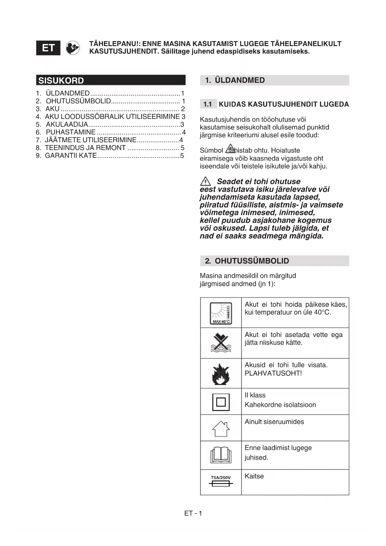 Akut ei tohi hoida päikese käes, kui temperatuur on üle 40°C. Akut ei tohi asetada vette ega jätta niiskuse kätte. Akusid ei tohi tulle visata. PLAHVATUSOHT! II klass Kahekordne isolatsioon Ainult siseruumides Enne laadimist lugege juhised. T5A/250V Kaitse TÄHELEPANU!: ENNE MASINA KASUTAMIST LUGEGE TÄHELEPANELIKULT KASUTUSJUHENDIT. Säilitage juhend edaspidiseks kasutamiseks.