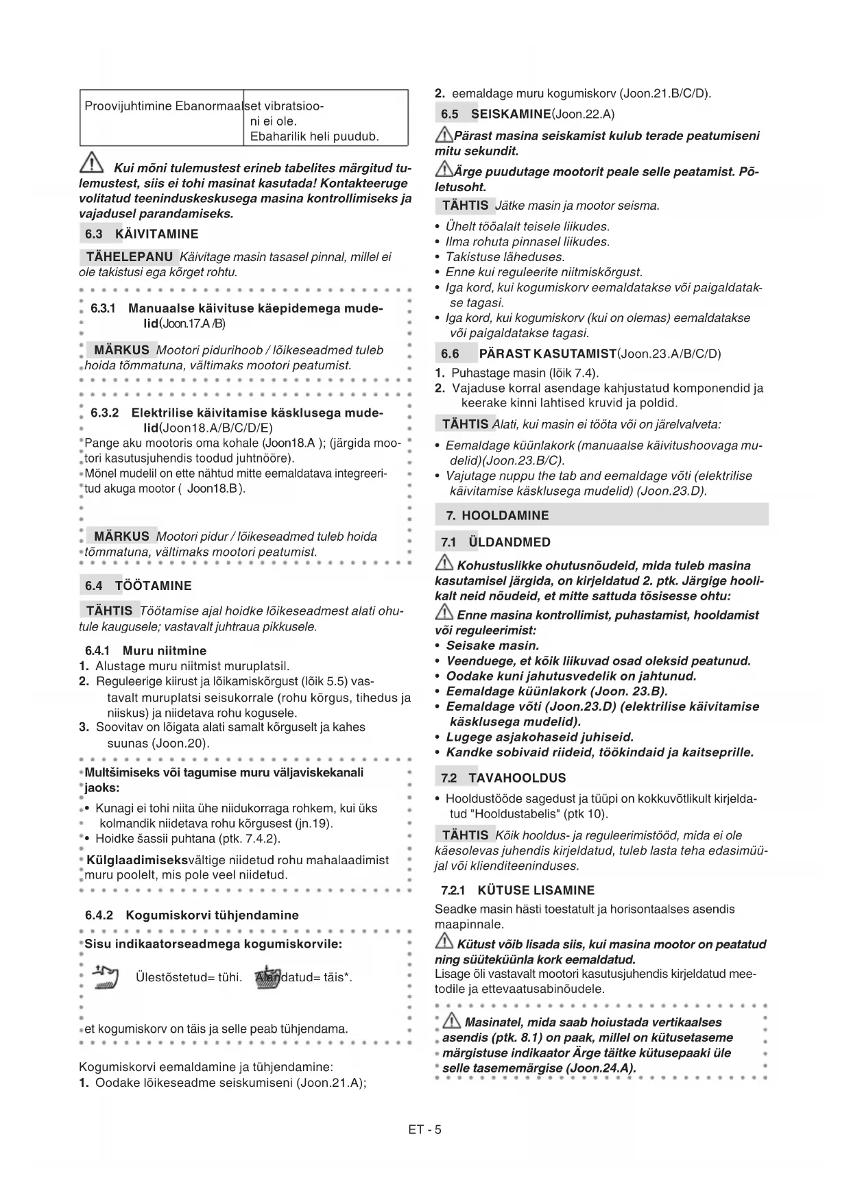 - Masina reguleerimistöid tehes tuleb olla ettevaatlik väl- timaks sõrmede jäämist liikuva lõikeseadme ja masina liikumatute osade vahele. Antud kasutusjuhendis toodud müra- ja vibratsiooni- tase on masina kasutamise maksimumnäitajad. Tasakaa- lust väljas lõikeseadme kasutamine, liigne liikumiskii- rus, hoolduse puudumine mõjutavad märkimisväärselt müra ja vibratsiooni. Seetõttu on vajalik tarvitusele võtta ennetavad meetmed, et hoida ära kõrgest mürast ja vibratsiooni survest põhjustatud kahjustused; tegeleda masina hooldusega, kanda müravastaseid kõrvaklappe, teha töö ajal pause. Ladustamine