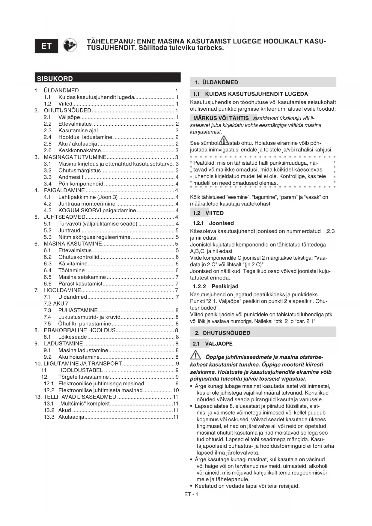 TÄHTIS Järgmised ohutussuunised kehtivad lisaks masinaga komplektis oleva aku ja akulaadija juhendi ohu- tusnõuetele.