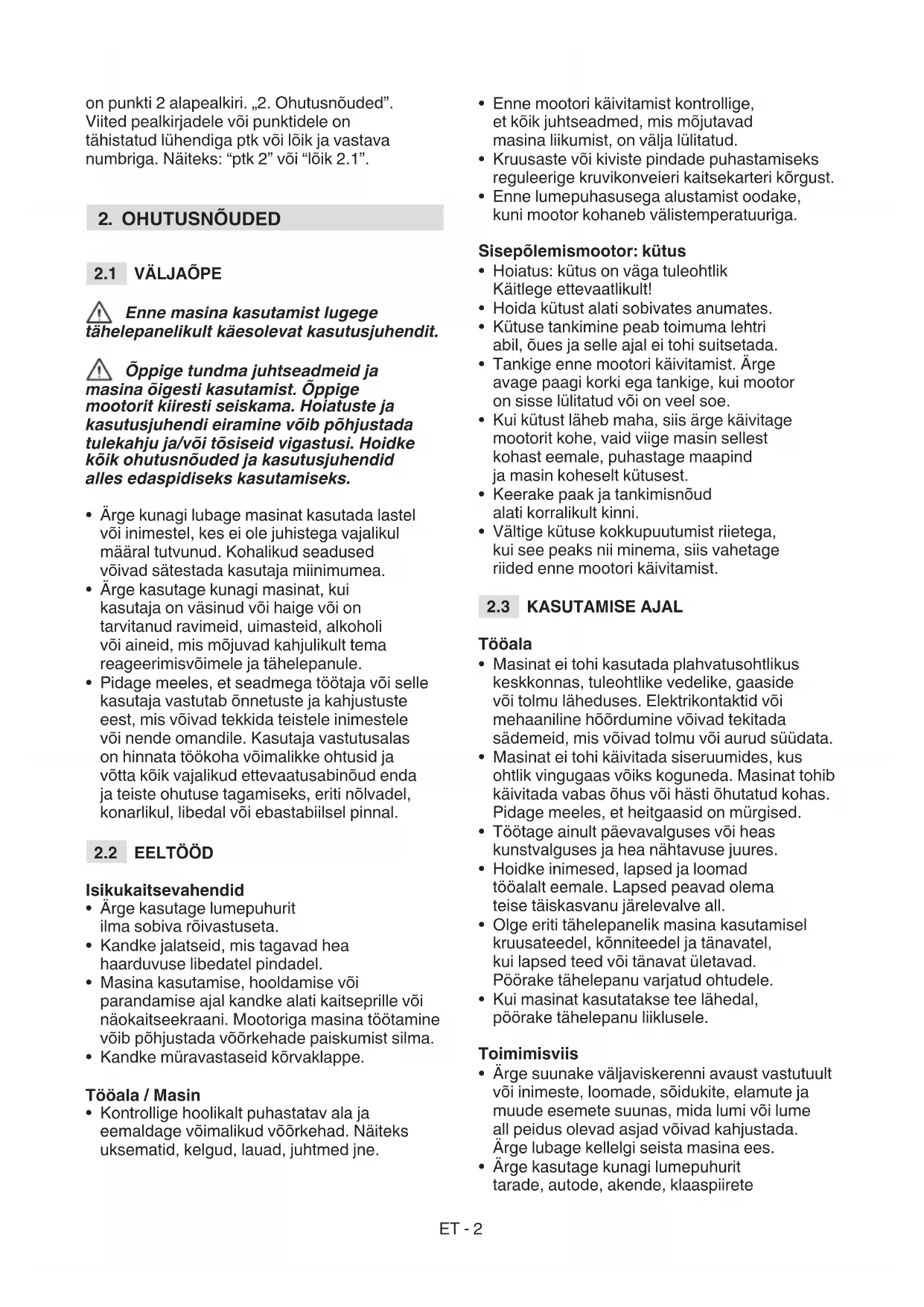Enne masina kasutamist lugege tähelepanelikult käesolevat kasutusjuhendit. Õppige tundma juhtseadmeid ja masina õigesti kasutamist. Õppige mootorit kiiresti seiskama. Hoiatuste ja kasutusjuhendi eiramine võib põhjustada tulekahju ja/või tõsiseid vigastusi. Hoidke kõik ohutusnõuded ja kasutusjuhendid alles edaspidiseks kasutamiseks.