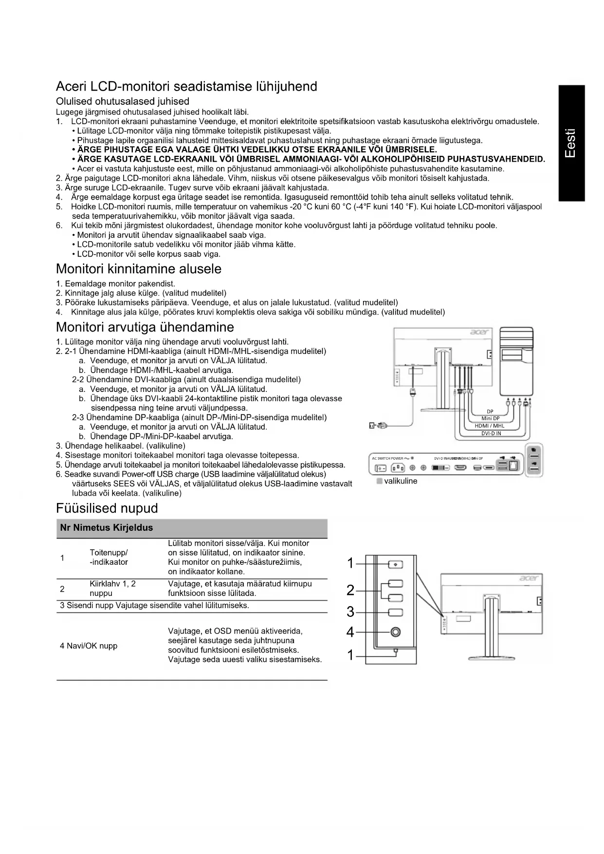 (tüüpiline) Kontrastsus Max 100000000:1 (ACM) Vaatenurk 178° (H) 178° (V) (CR = 10) Reageerimisaeg 5 ms (G-st G-ni) Paneeli tüüp IPS Video R, G, B H-sagedus DVI: 31 – 89 kHz, HDMI/DP/MiniDP: 31 – 135 kHz V-sagedus DVI/HDMI: 23 – 76 Hz, DP/MiniDP: 29 – 76 Hz Värvitäpsus 1,07 miljardit värvitooni Pikslisagedus DVI: 297 MHz, HDMI/DP/MiniDP: 533 MHz Maksimaalne lahutusvõime DVI: 3840 x 2160 @ 30 Hz, HDMI/DP/MiniDP: 3840 x 2160 @ 60 Hz Isehäälestumine VESA DDCCI/DDC2B Energiatõhususe klass B *Aastane energiatarve 70 (kWh) (HDMI-sisendiga mudelil) Toitevõimsus Sisselülitatuna 115 W (tüüpiline) Puhkerežiimis 0,5 W (tüüpiline) Väljalülitatuna 0,5 W (tüüpiline) Sisendpistik 19-kontaktiline HDMI (ainult HDMI-sisendiga mudelitel) MHL (ainult MHL-sisendiga mudelitel) 24-kontaktiline DVI (kahe ühendusega) (ainult duaalsisendiga mudelitel) DP (ainult DP-sisendiga mudelitel) Mini-DP (ainult Mini-DP sisendiga mudelitel) Video sisendsignaal HDMI-signaal (ainult HDMI-sisendiga mudelitel) (valikuline) MHL (ainult MHL-sisendiga mudelitel) (valikuline) Digitaalsignaal (ainult duaalsisendiga mudelitel) DP (ainult DP-sisendiga mudelitel) (valikuline) Mini-DP (ainult Mini-DP sisendiga mudelitel) (valikuline) Kõlarid 2 W × 2 (ainult helisisendiga mudelitel) (valikuline) USB USB 3.0 × 4 (valikuline) Ekraani maksimaalsed mõõtmed Horisontaalne: 708,5 mm Vertikaalne: 398,5 mm Toiteallikas 100–240 V, 50/60 Hz Keskkonnatingimused Töötemperatuur: 5 °C kuni 35 °C Säilitamistemperatuur: -20 °C kuni 60 °C Õhuniiskus töökeskkonnas: 10% kuni 85% Mõõtmed 727,5 (L) × 465,8 kuni 615,8 (K) × 280,8 (S) mm Mass (netomass) 11,14 kg (netomass) Mehaanilised andmed Kaldenurk: -5° kuni +25° (kaldenurk 25 kraadi on saavutatav ainult monitori kõrgeimas asendis) Pöördenurk: -45° kuni +45° Kõrguse reguleerimisvahemik: 0 mm kuni 150 mm Pöördepunkt: -90° kuni +90° Lahtivõetav jalg: jah (kruviga kinnitatav lahtivõetav jalg) Füüsilised nupud Lülitid/nupud Toitenupp Kiirklahv 1 Kiirklahv 2 Sisend Menüü/Navi/OK Funktsioonid Kontrastsus Heledus Teravus (ainult analoogsisendiga mudelitel) Sagedus (ainult analoogsisendiga mudelitel) H-asend (ainult analoogsisendiga mudelitel) V-asend (ainult analoogsisendiga mudelitel) Üliteravus 6-teljeline küllastus 6-teljeline toon Gamma Värvitemperatuur sRGB/Adobe RGB/Rec.709 PIP/PBP Acer eColor Management Sinine tuli DP-formaat USB laadimine väljalülitatud olekus Keel Menüü ajapiirang Automaatseadistus (ainult analoogsisendiga mudelitel) Laiekraanirežiim (täisekraan/kuvasuhe) ACM sisse/välja Sisendsignaali valik Automaatne allikas Kiire alustamise režiim Ühtsus Läbipaistvus Kiirklahvide määrangud Salvesta seade Kõiki tehnilisi andmeid võidakse ette teatamata muuta.Lietuvių LCD monitoriaus „Acer“ trumpasis sąrankos vadovas Svarbios saugos instrukcijos Atidžiai perskaitykite šias instrukcijas. 1. Norėdami nuvalyti LCD monitoriaus ekraną: būtinai įsitikinkite, ar jūsų monitoriaus vardinė elektros galia atitinka jūsų vietovėje tiekiamos kintamosios srovės galią.