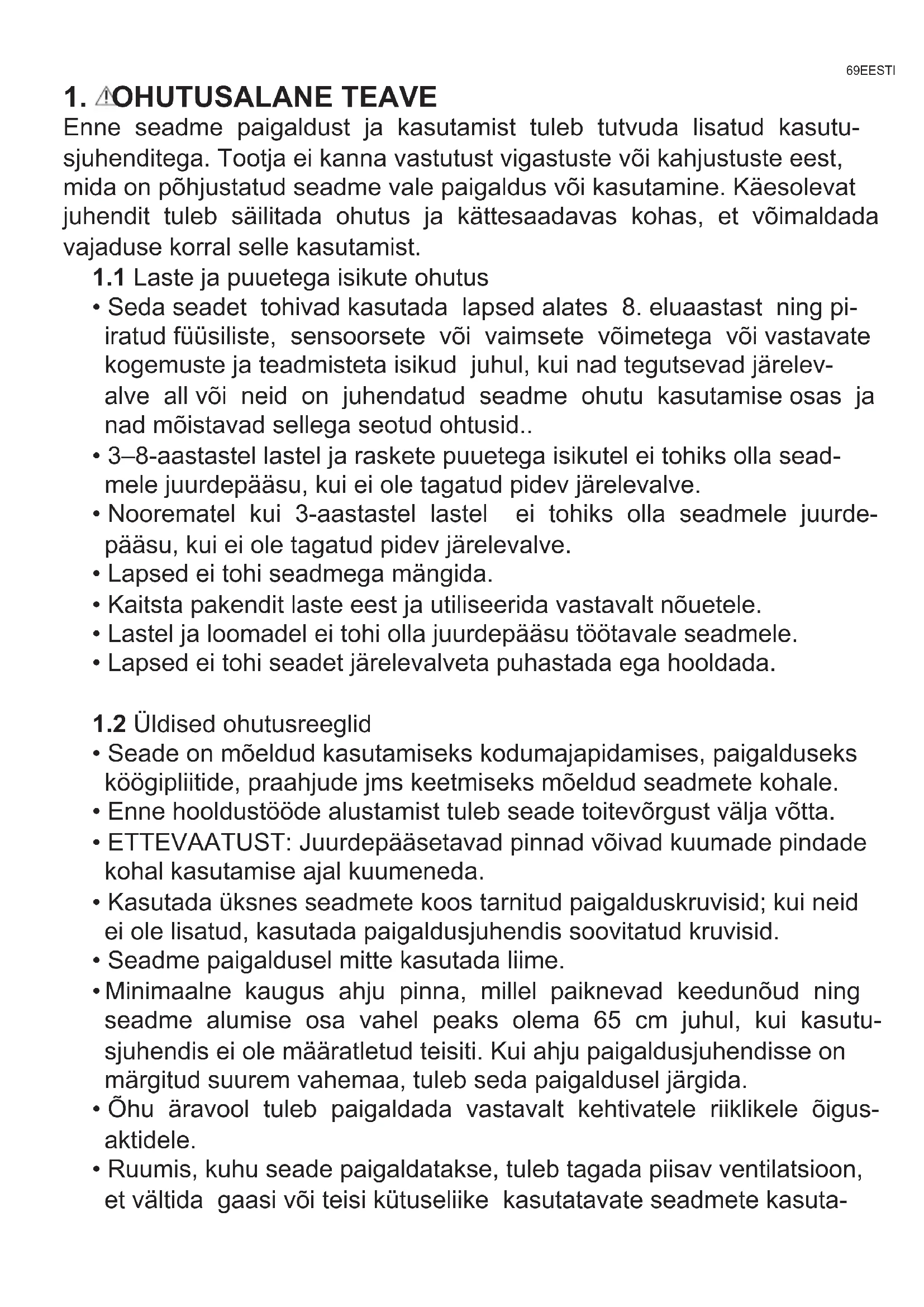 - Seda seadet tohivad kasutada lapsed alates 8. eluaastast ning pi- iratud füüsiliste, sensoorsete või vaimsete võimetega või vastavate kogemuste ja teadmisteta isikud juhul, kui nad tegutsevad järelev- alve all või neid on juhendatud seadme ohutu kasutamise osas ja nad mõistavad sellega seotud ohtusid..