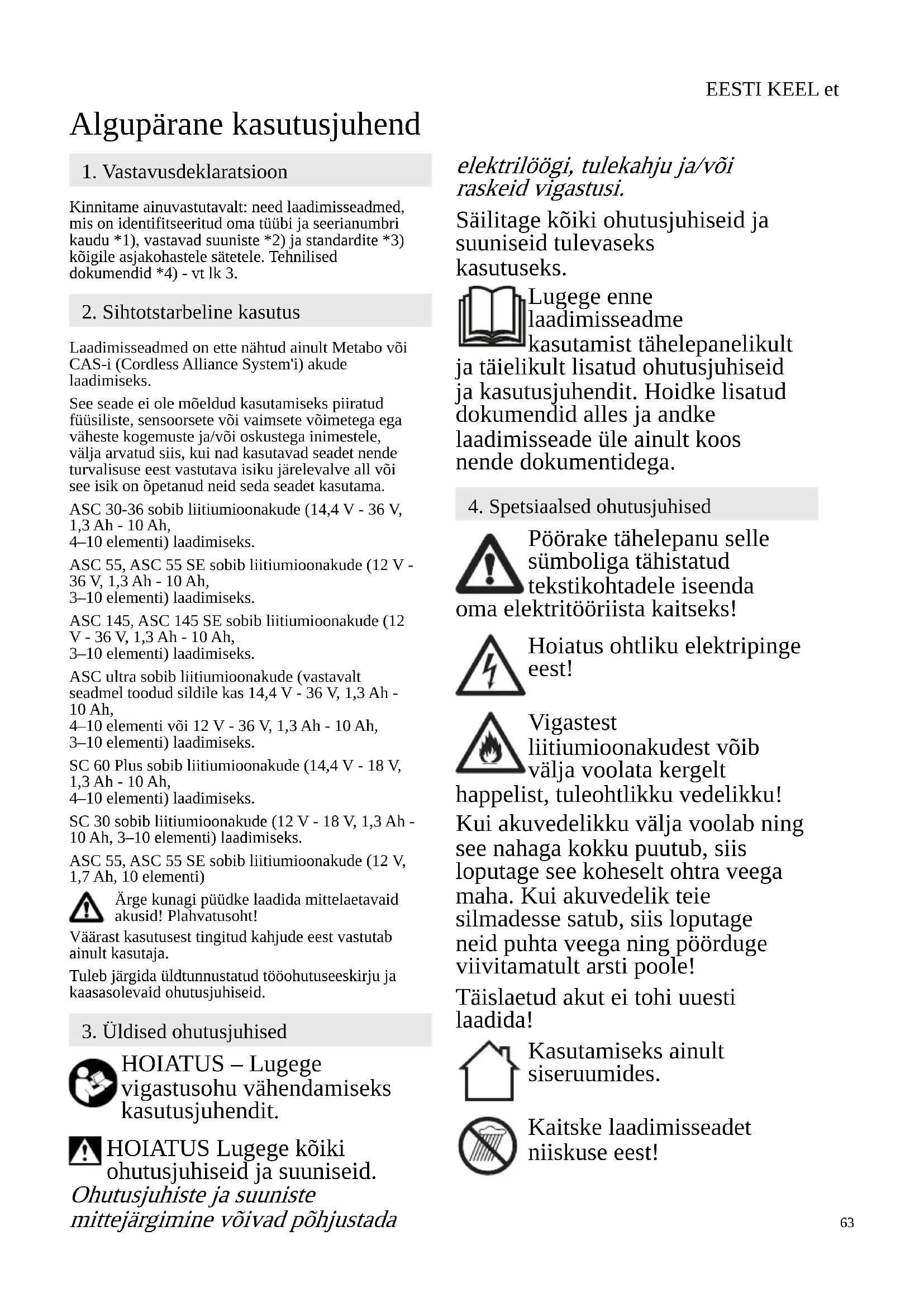 Algupärane kasutusjuhend Kinnitame ainuvastutavalt: need laadimisseadmed, mis on identifitseeritud oma tüübi ja seerianumbri kaudu *1), vastavad suuniste *2) ja standardite *3) kõigile asjakohastele sätetele. Tehnilised dokumendid *4) - vt lk 3. Laadimisseadmed on ette nähtud ainult Metabo või CAS-i (Cordless Alliance System'i) akude laadimiseks. See seade ei ole mõeldud kasutamiseks piiratud füüsiliste, sensoorsete või vaimsete võimetega ega väheste kogemuste ja/või oskustega inimestele, välja arvatud siis, kui nad kasutavad seadet nende turvalisuse eest vastutava isiku järelevalve all või see isik on õpetanud neid seda seadet kasutama. ASC 30-36 sobib liitiumioonakude (14,4 V - 36 V, 1,3 Ah - 10 Ah, 4–10 elementi) laadimiseks. ASC 55, ASC 55 SE sobib liitiumioonakude (12 V - 36 V, 1,3 Ah - 10 Ah, 3–10 elementi) laadimiseks. ASC 145, ASC 145 SE sobib liitiumioonakude (12 V - 36 V, 1,3 Ah - 10 Ah, 3–10 elementi) laadimiseks. ASC ultra sobib liitiumioonakude (vastavalt seadmel toodud sildile kas 14,4 V - 36 V, 1,3 Ah - 10 Ah, 4–10 elementi või 12 V - 36 V, 1,3 Ah - 10 Ah, 3–10 elementi) laadimiseks. SC 60 Plus sobib liitiumioonakude (14,4 V - 18 V, 1,3 Ah - 10 Ah, 4–10 elementi) laadimiseks. SC 30 sobib liitiumioonakude (12 V - 18 V, 1,3 Ah - 10 Ah, 3–10 elementi) laadimiseks. ASC 55, ASC 55 SE sobib liitiumioonakude (12 V, 1,7 Ah, 10 elementi) Ärge kunagi püüdke laadida mittelaetavaid akusid! Plahvatusoht! Väärast kasutusest tingitud kahjude eest vastutab ainult kasutaja. Tuleb järgida üldtunnustatud tööohutuseeskirju ja kaasasolevaid ohutusjuhiseid. HOIATUS – Lugege vigastusohu vähendamiseks kasutusjuhendit. HOIATUS Lugege kõiki ohutusjuhiseid ja suuniseid. Ohutusjuhiste ja suuniste mittejärgimine võivad põhjustada elektrilöögi, tulekahju ja/või raskeid vigastusi. Säilitage kõiki ohutusjuhiseid ja suuniseid tulevaseks kasutuseks. Lugege enne laadimisseadme kasutamist tähelepanelikult ja täielikult lisatud ohutusjuhiseid ja kasutusjuhendit. Hoidke lisatud dokumendid alles ja andke laadimisseade üle ainult koos nende dokumentidega. Pöörake tähelepanu selle sümboliga tähistatud tekstikohtadele iseenda oma elektritööriista kaitseks! Hoiatus ohtliku elektripinge eest! Vigastest liitiumioonakudest võib välja voolata kergelt happelist, tuleohtlikku vedelikku! Kui akuvedelikku välja voolab ning see nahaga kokku puutub, siis loputage see koheselt ohtra veega maha. Kui akuvedelik teie silmadesse satub, siis loputage neid puhta veega ning pöörduge viivitamatult arsti poole! Täislaetud akut ei tohi uuesti laadida! Kasutamiseks ainult siseruumides. Kaitske laadimisseadet niiskuse eest!